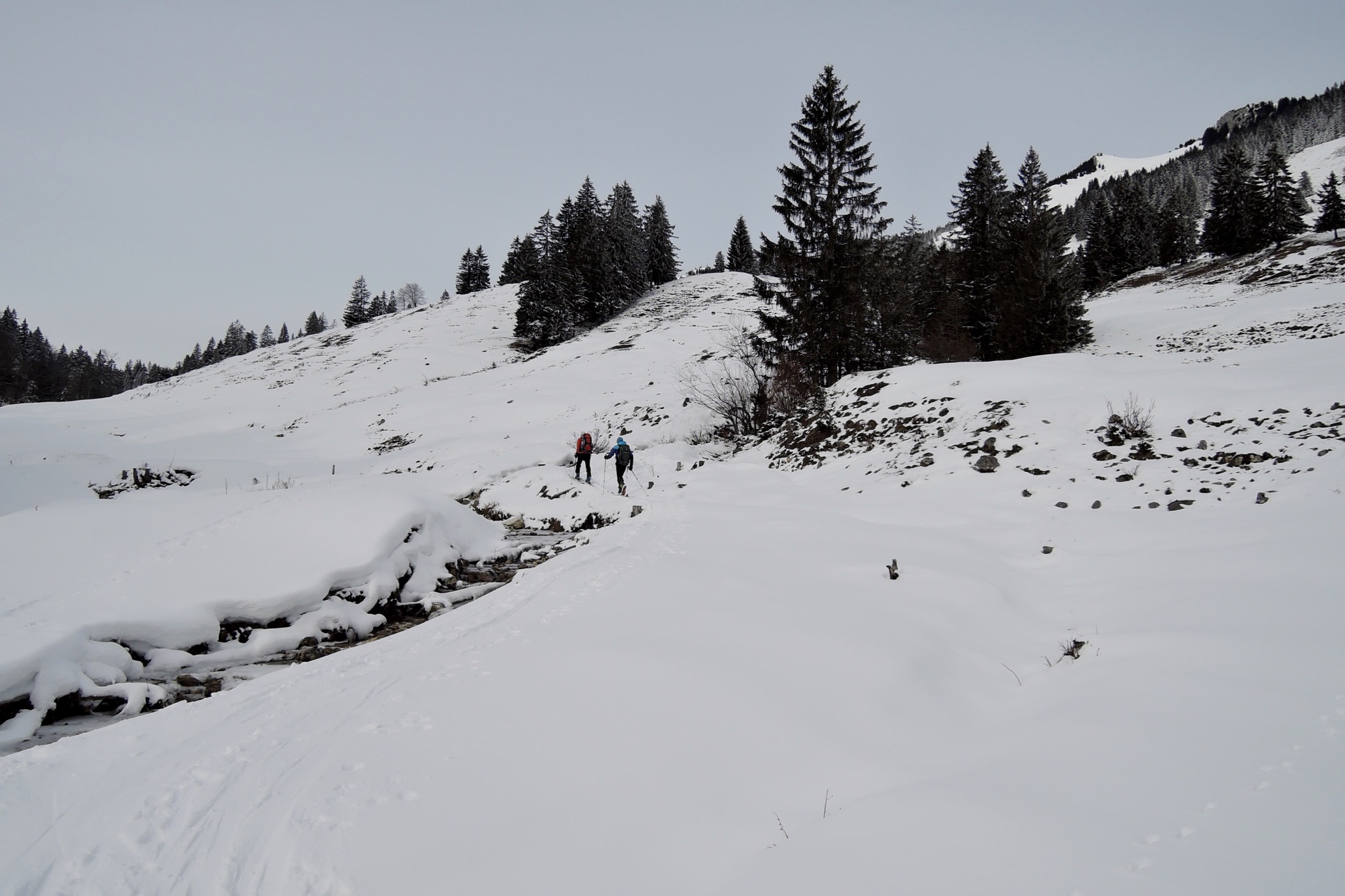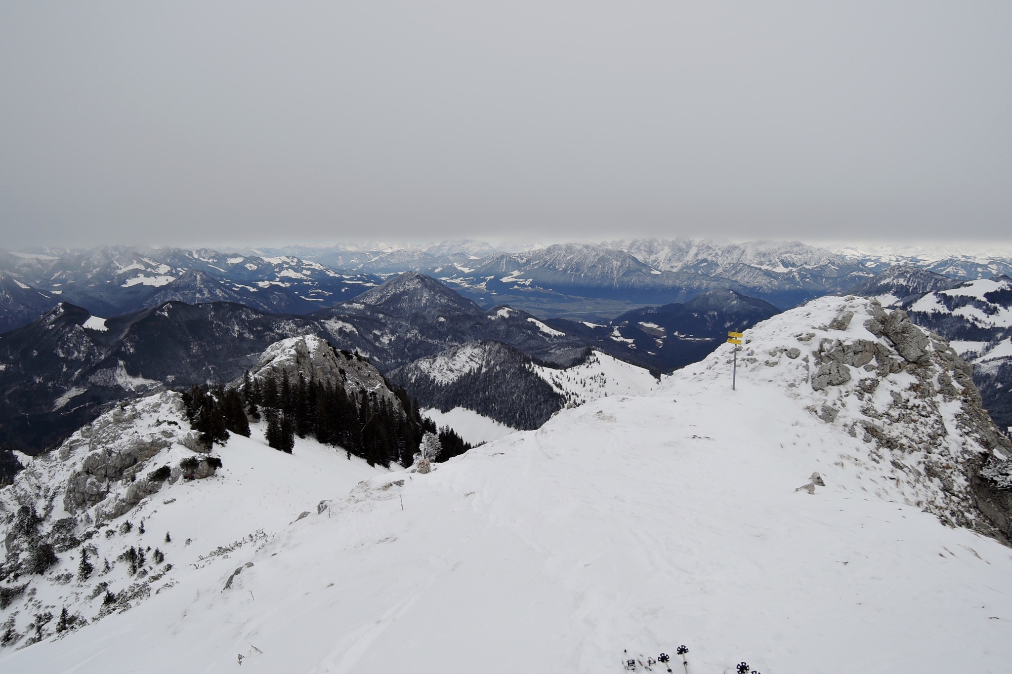 Tourenverhältnisse: Oben hartgefroren, aber völlig plan, um 1550m Bruchharsch, dann Pulver, dann Zucker, dann Frühjahrsschnee. Aber auf Ski dennoch bis unten, auch wenn's manchmal arg dünn war ![]()