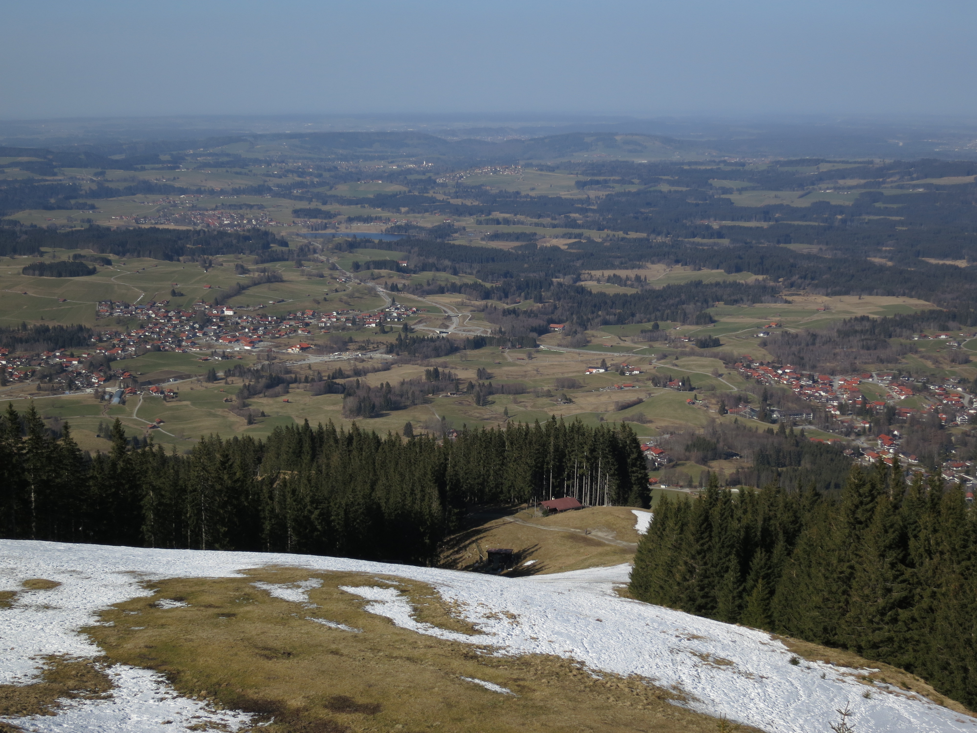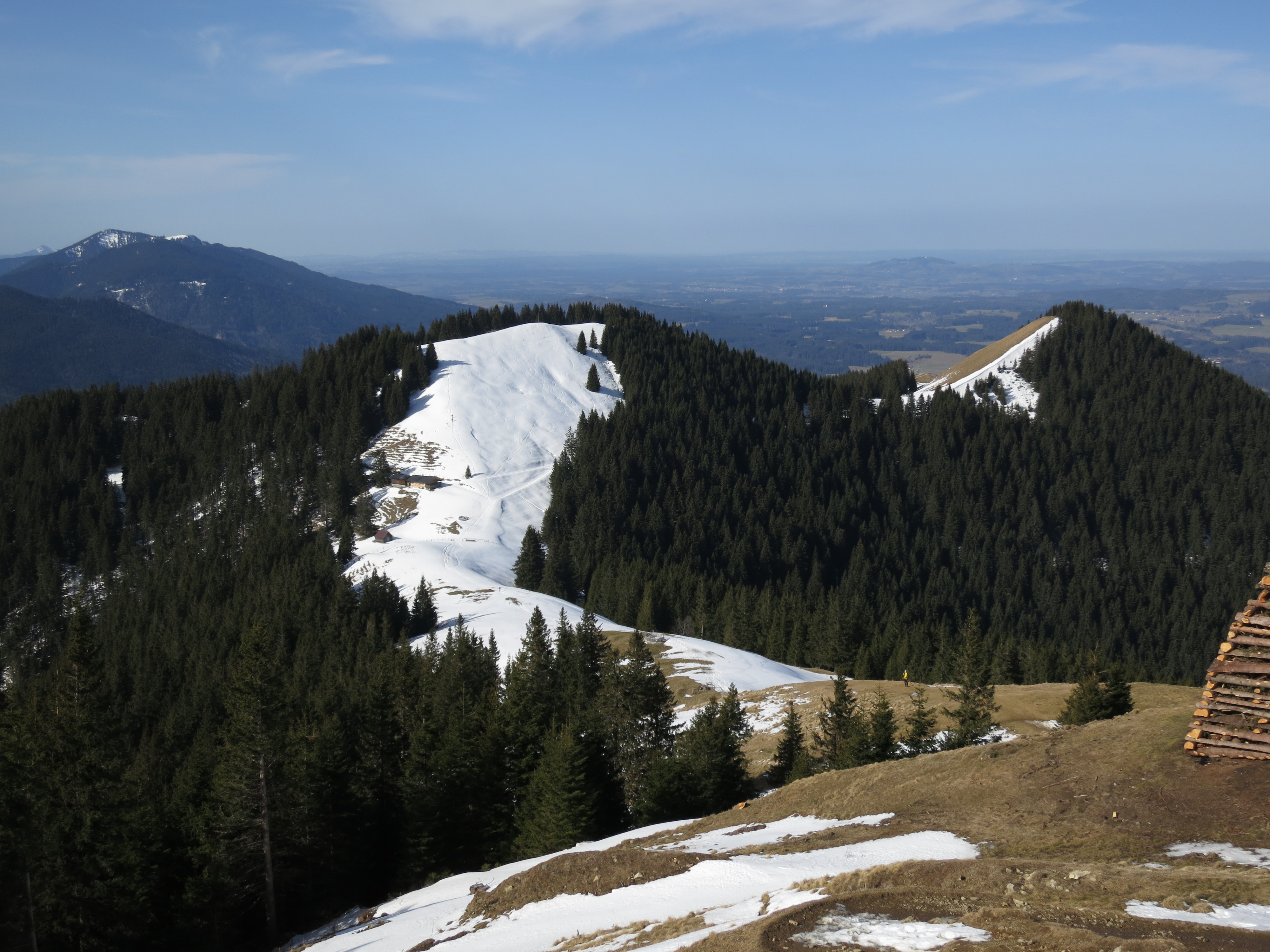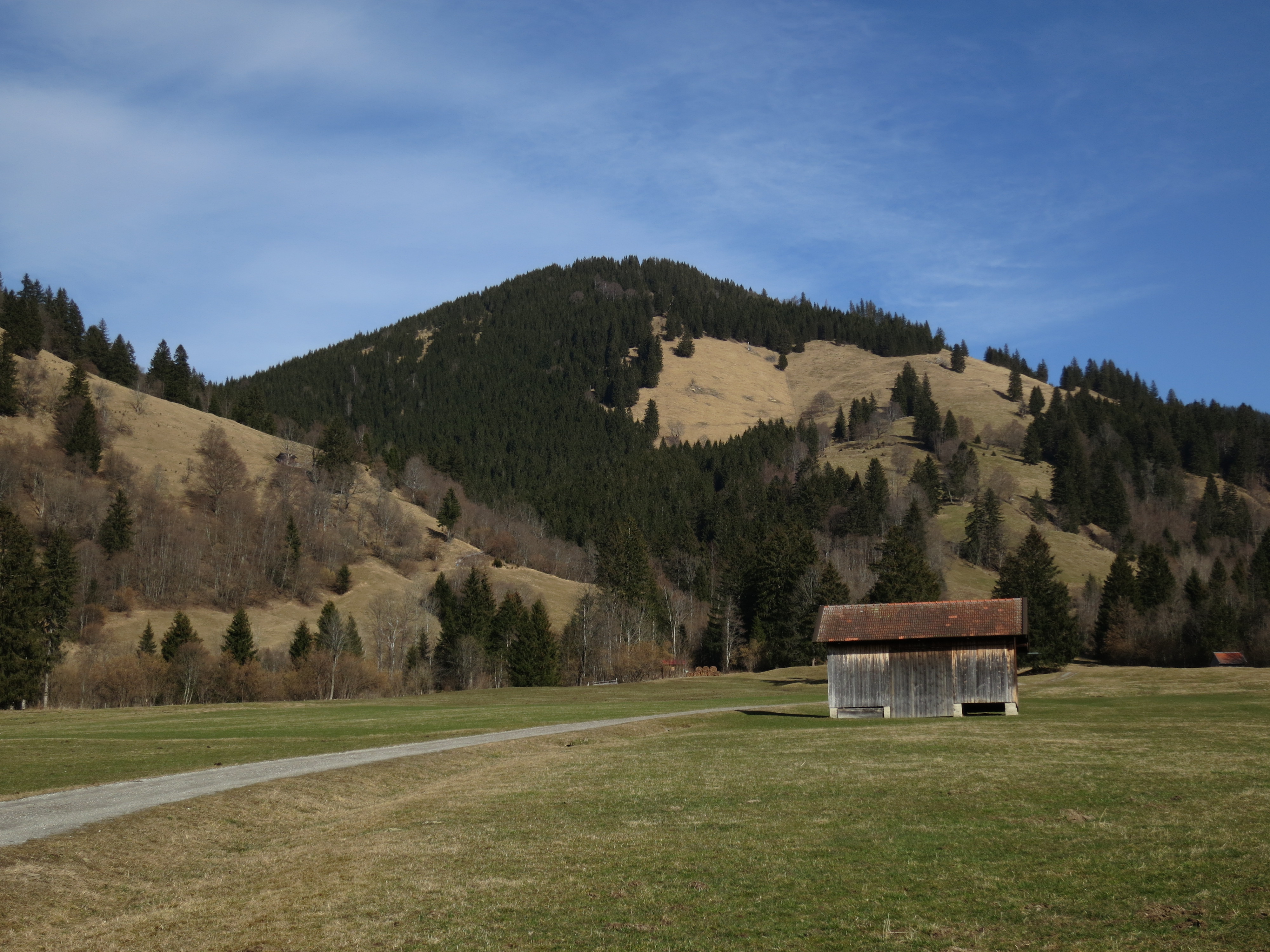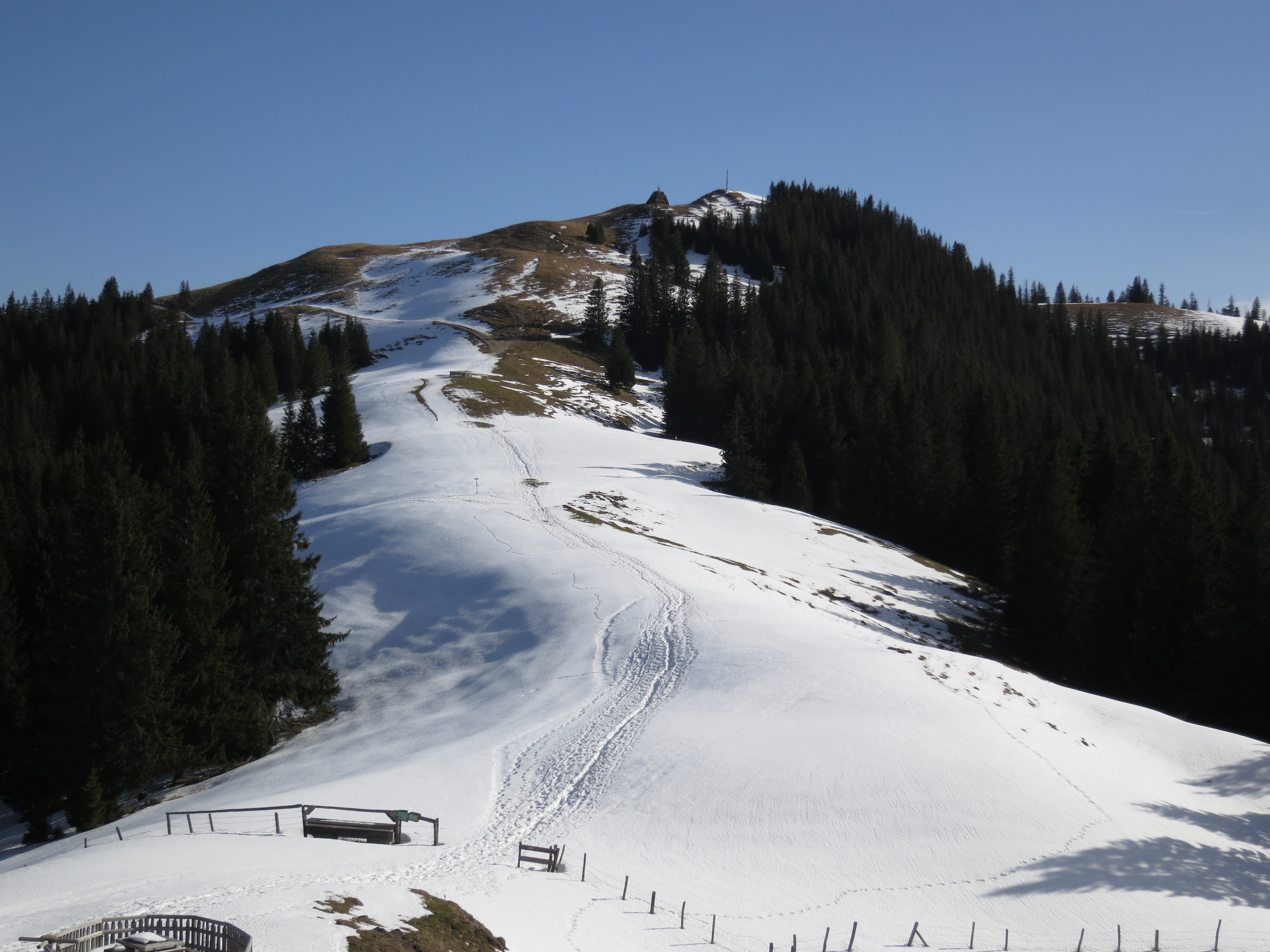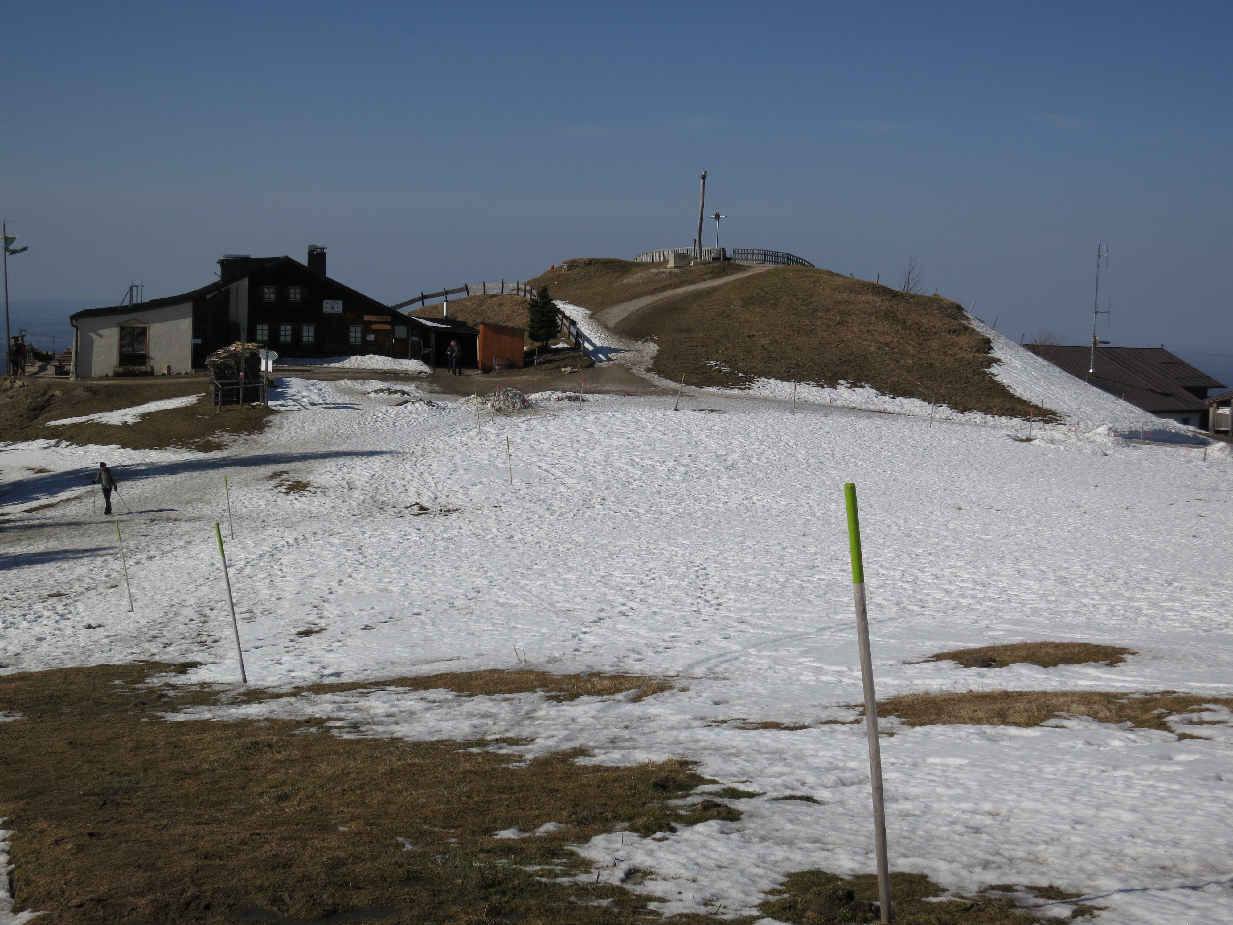 Tourenverhältnisse: Aufstieg wie bei der Skitour. Bis kurz vor der Hörnle-Alm aper und meist trocken; nur kurze batzige Abschnitte. Im Bereich der Hörnle-Alm liegt im flachen Abschnitt Schnee (eingetretene Spur). Gipfelhang dann wieder schneefrei. Abstieg über die Hörnle-Hütte auf dem markierten Wanderweg ab Hörnlehütte ebenfalls meist schneefrei und trocken mit einigen batzigen Abschnitten. Aber alles problemlos zu gehen.
