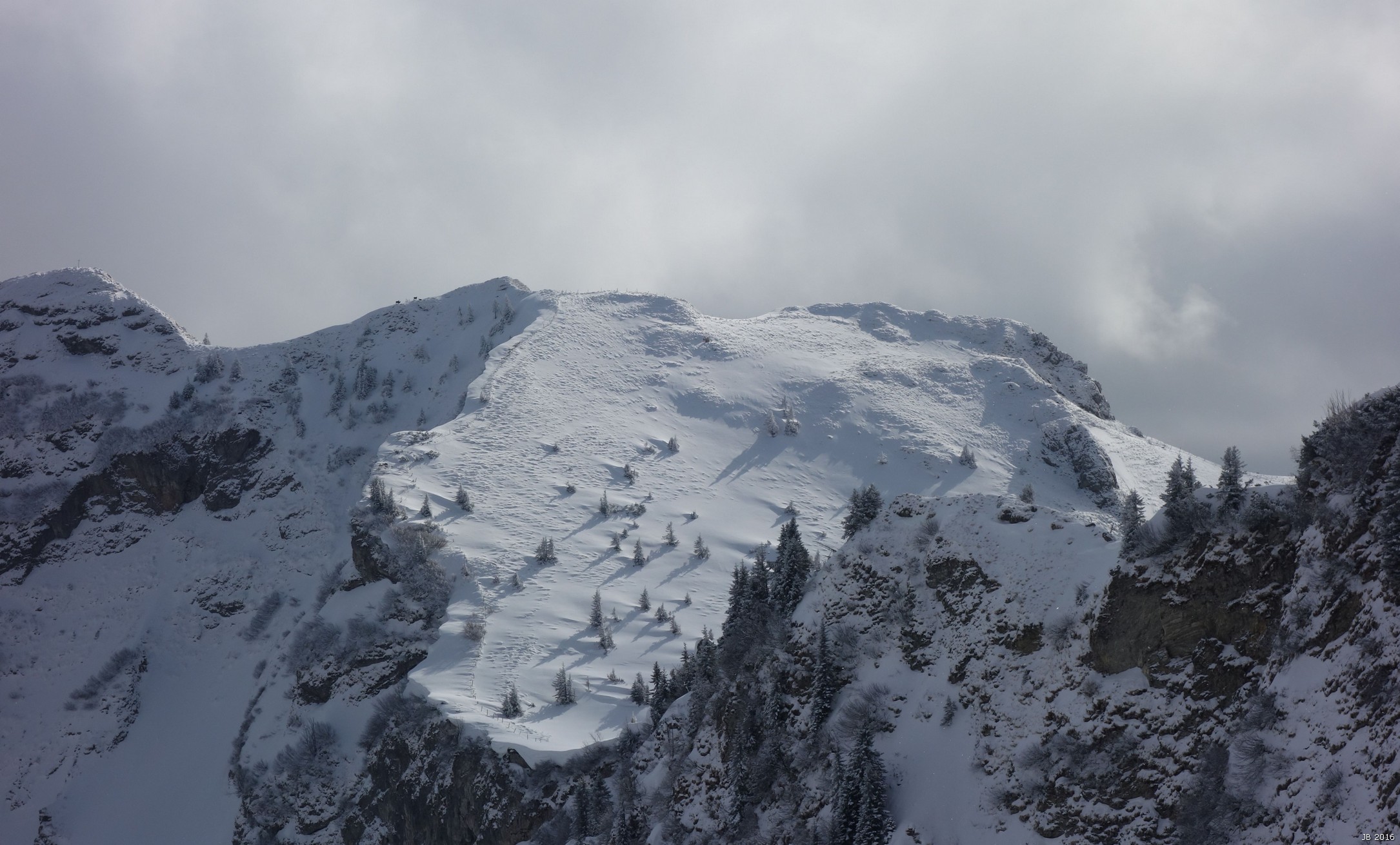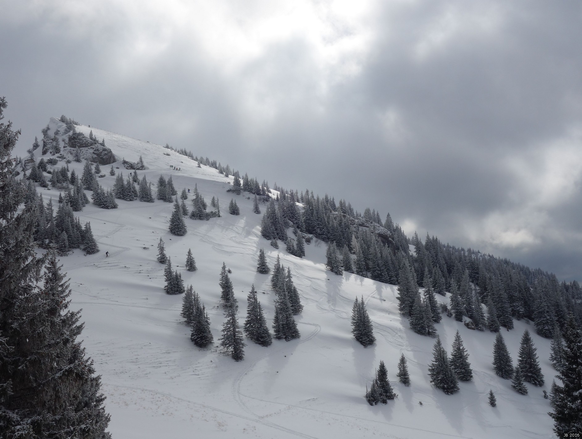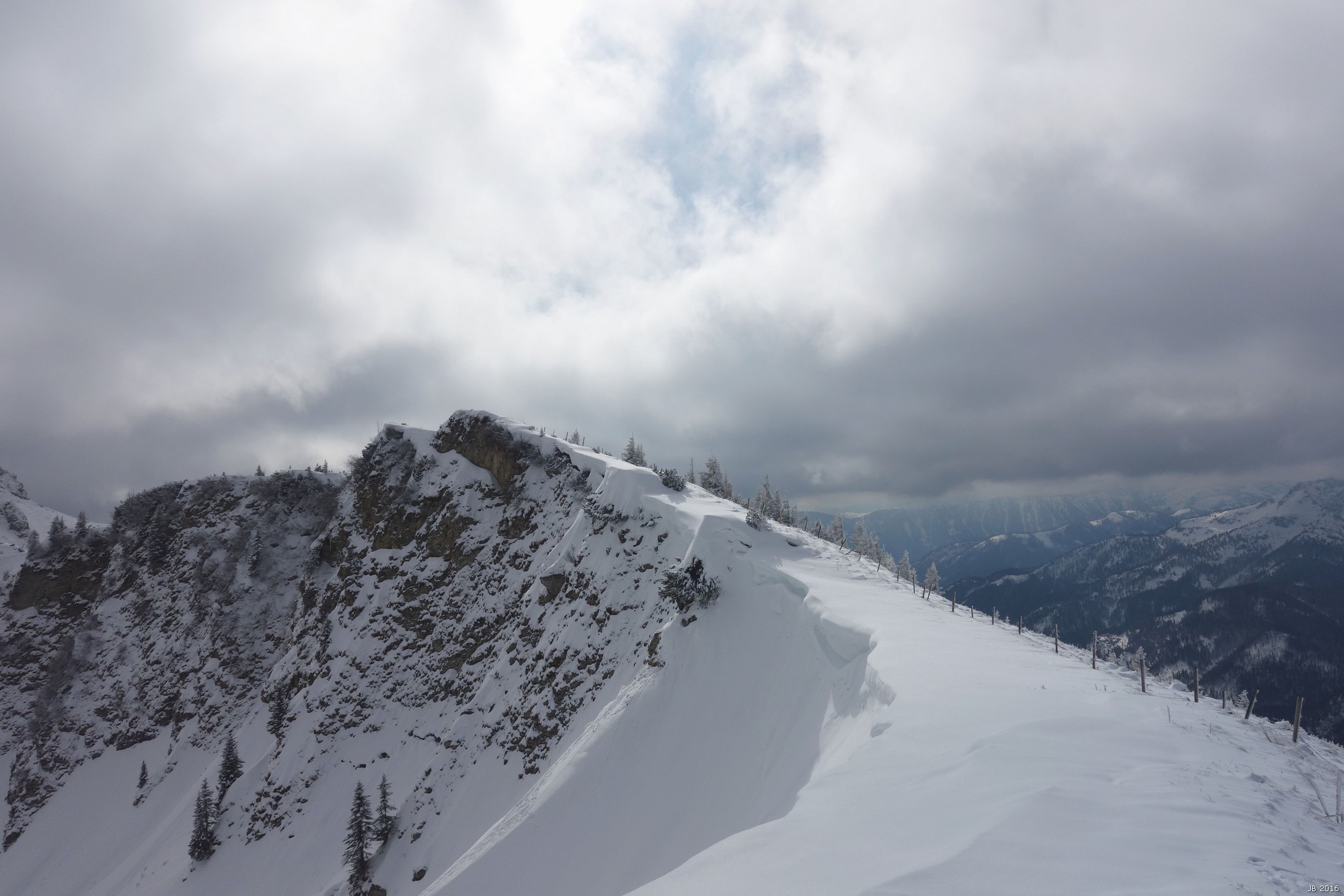 Abfahrt über die untere Wallenburgalm Richtung Südwesten über herrliche Wiesen bis zum Waldrand auf ca. 1300m. Im oberen Teil sehr wenig Schnee, weiter unten aber sehr gut zu fahren, feinster Pulver, wenig Spuren.
