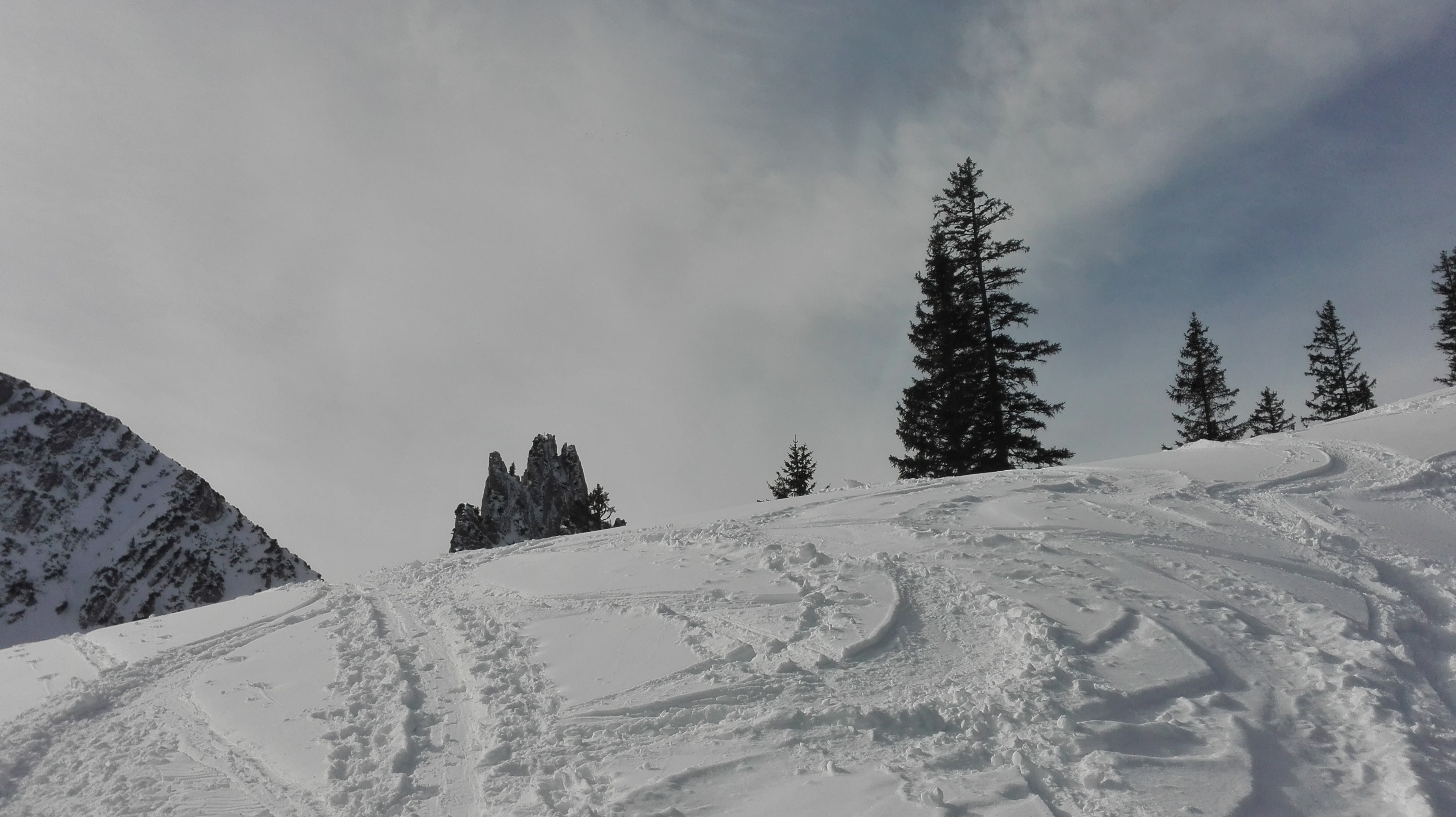 Tourenverhältnisse: Gut; von der Hufnagelstube über die Siebli- und Riedereckalm zum Riederecksattel. Schnee ab Parkplatz, im unteren Bereich der Straße allerdings nur 1-2cm festgetretener Schnee/Eis. Wo die Aufstiegsspur durch dichteren Wald führt (im Anschluss an die freien Hänge oberhalb der Sieblialm), liegt wenig Schnee. Hier leiden bei einer Abfahrt wahrscheinlich schon Ski und Wald. Es ist sinnvoller, bei der Abfahrt rechts haltend bis zu einer Forststraße abzufahren und auf dieser etwa 100 - 200m waagrecht nach links zu den freien Hängen oberhalb der Sieblialm zu queren. Bis etwa 1250m herab auch noch am Nachmittag schöne Pulverschneeauflage (ca. 10cm) auf Harsch, unterhalb 1250m weicher Schnee, ebenfalls gut fahrbar.