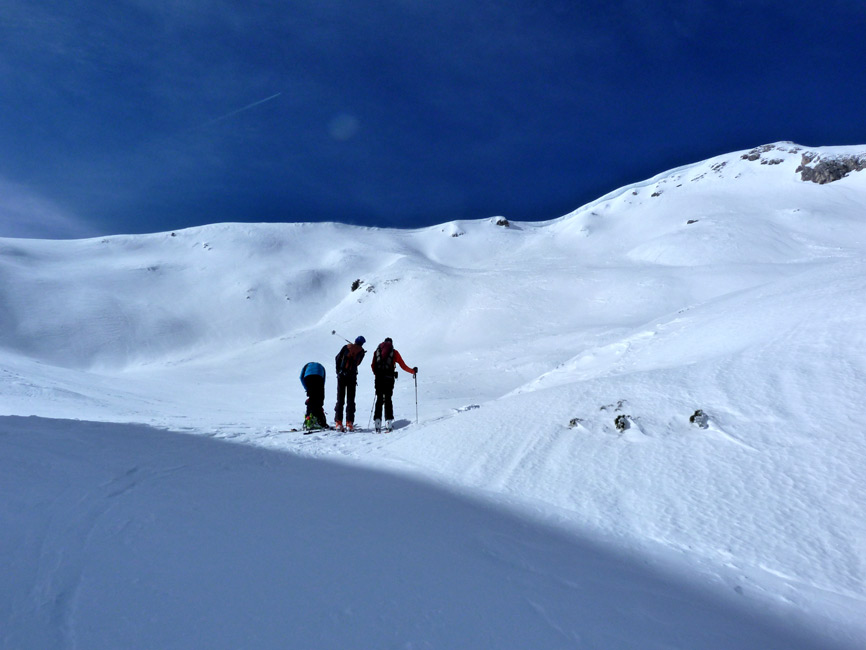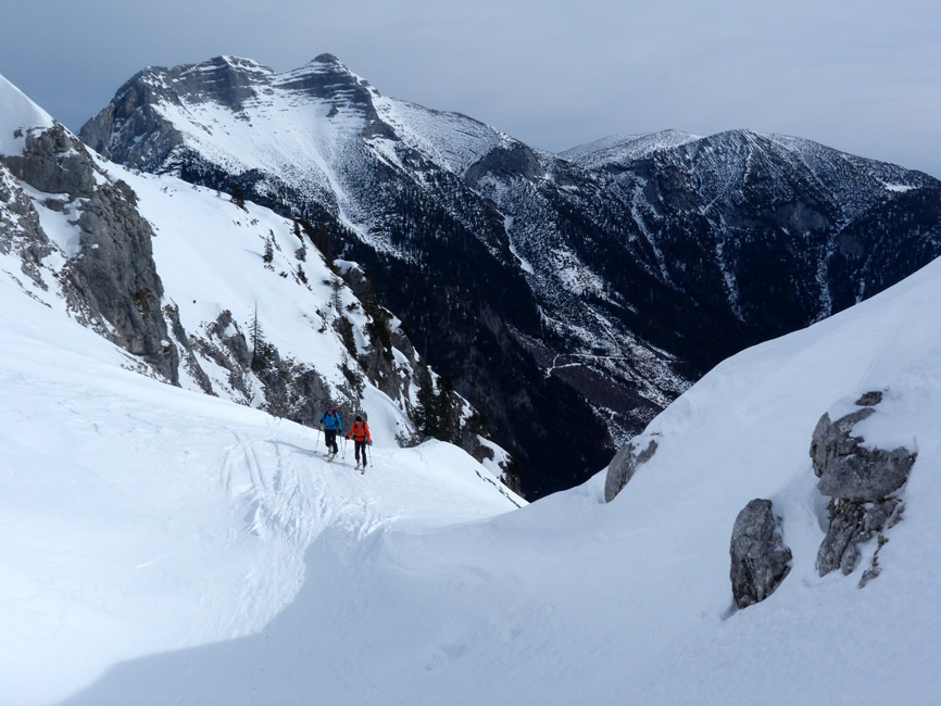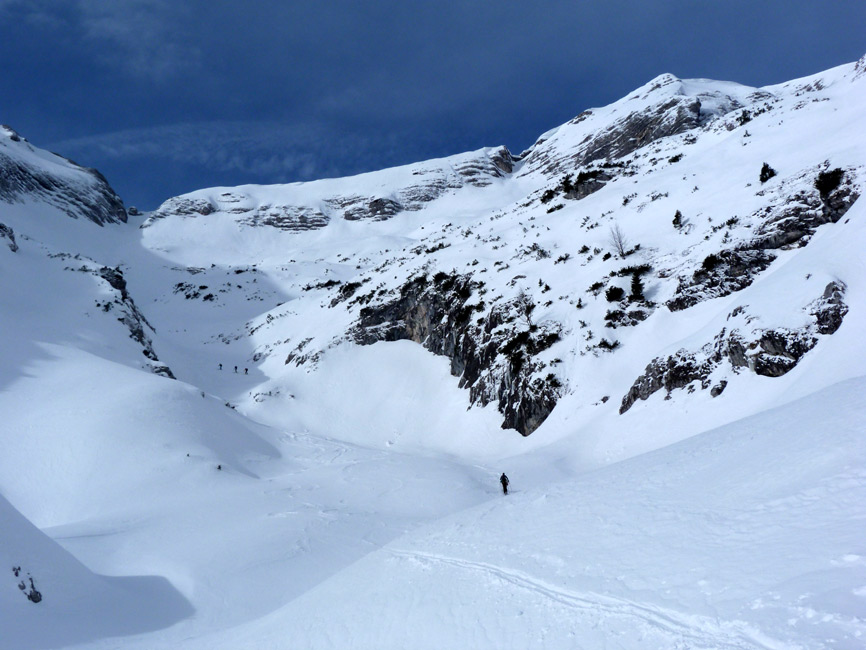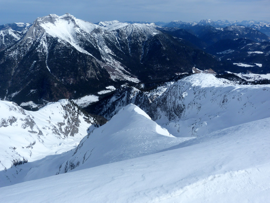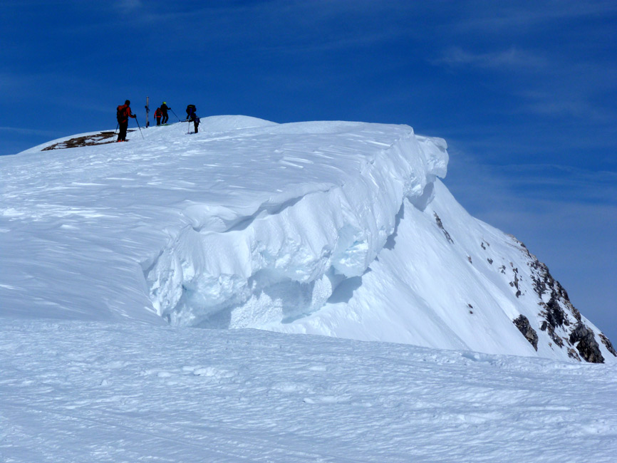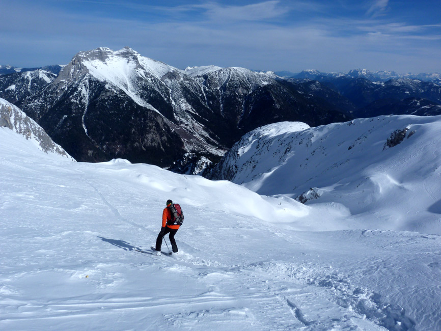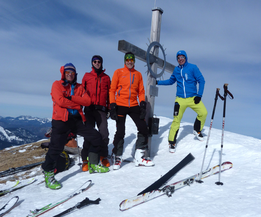 Tourenverhältnisse: Sehr schöne Bedingungen!!! Aufstieg und Abfahrt vom Auto weg ohne einen einzigen Skitragemeter und ohne jeglichen Steintreffer. Diverse Schneearten angetroffen (Pulver, Harsch, Firn, windverpresst auf hartem Altschnee). Orientierung beim direkten Nordaufstieg bisweilen nicht ganz einfach. In den Steilpassagen im Aufstieg ein paar mühsame Stellen (Neuschneeauflage auf Harsch), ging aber alles ohne Harscheisen. Am Gipfel starker Wind, aber nicht allzu kalt. Super Abfahrt, Bachbett ist komplett offen, kann links aber gut umfahren werden. Am Schluss hilft die Loipe. Sehr lohnend!