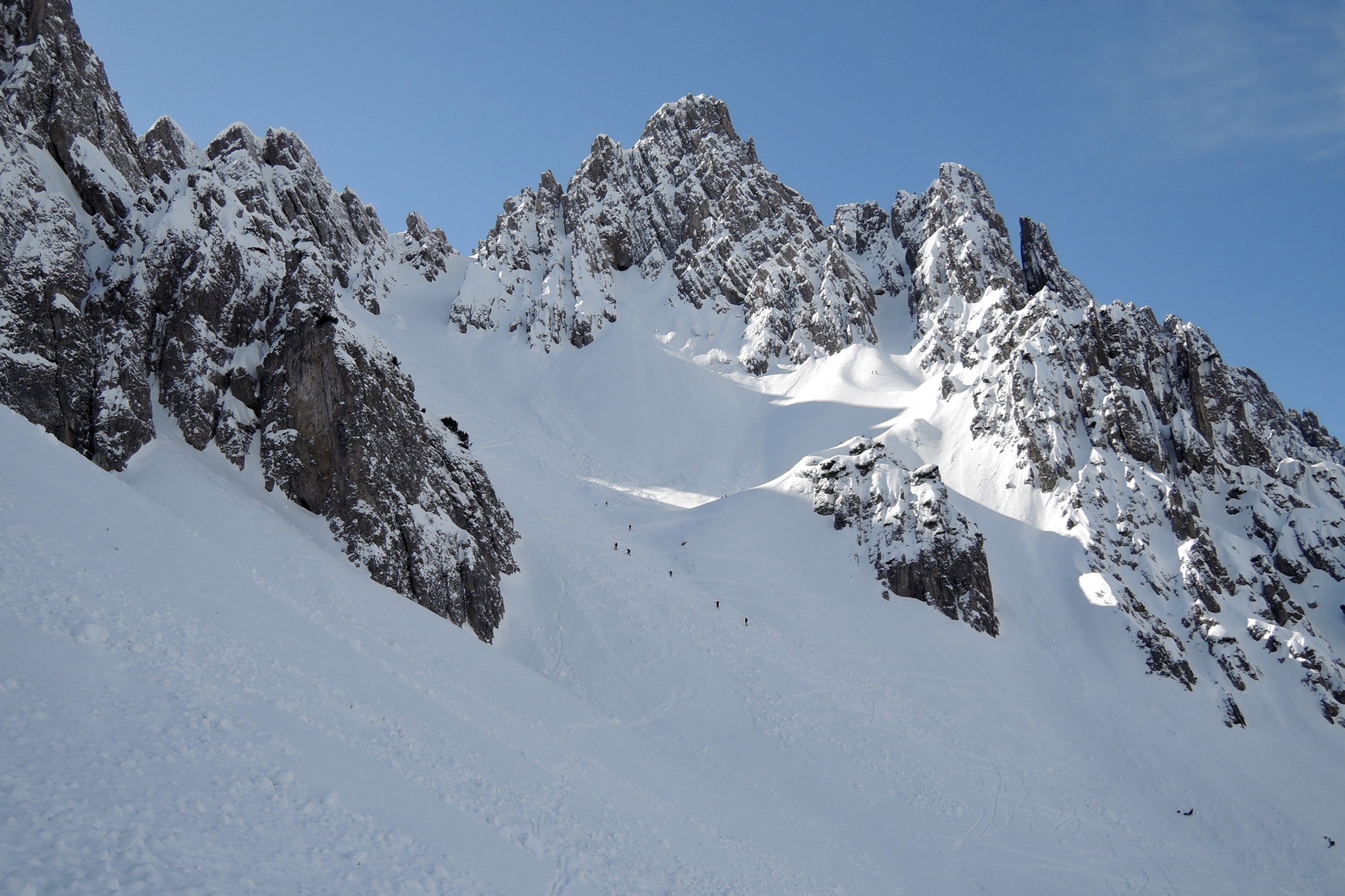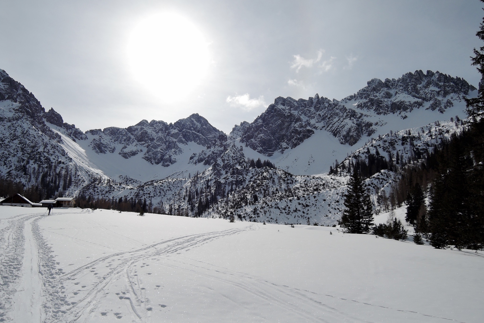Tourenverhältnisse: PP um 9:45 voll. Zu Beginn der Forststrasse kleiner Lücken, sonst gut. Ab Kuhloch 10cm und mehr lockerer Schnee auf pickelharter Regenkruste. Entweder zugelangt (Eppzirler Scharte) oder zerfahren (Kuhljoch)