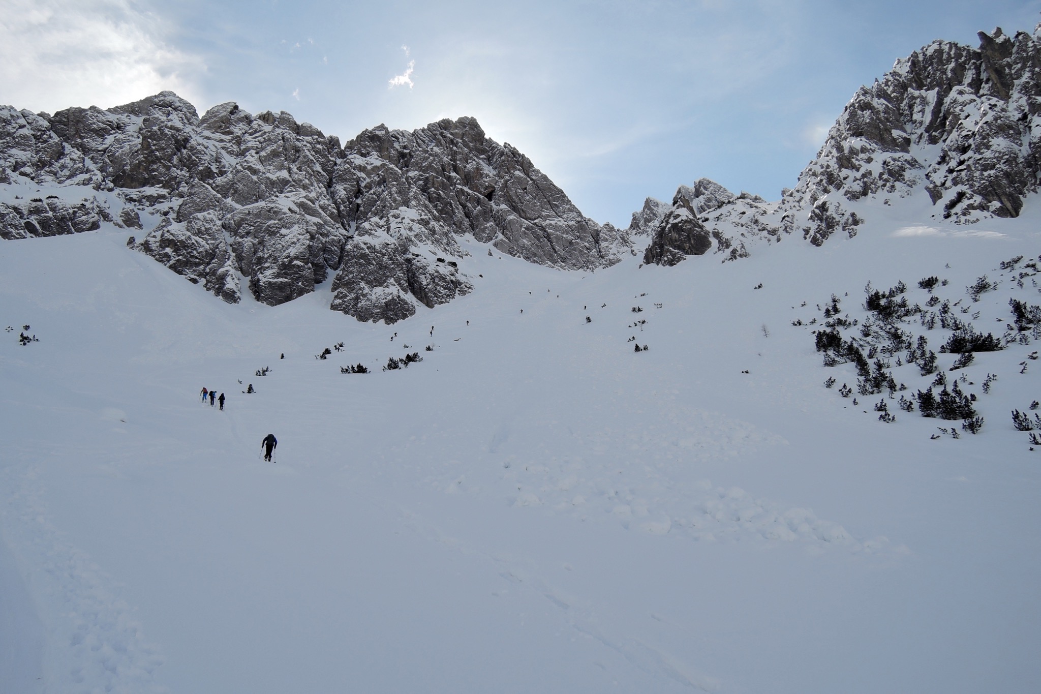 Sonstiges: Vom vollen (!) PP am Bhf Gießenbach (1005m) bei Scharnitz stets Richtung SO auf der gemächlich ansteigenden Forststrasse durchs Eppzirler Tal bis zur Gabelung Oberbrunnalm/Eppzirler Alm. Dort rechts hinauf Richtung Eppzirler Alm (1469m), die man bald nach geringfügigem Höhenverlust erreicht. Weiter in landschaftlich großartiger Kulisse nach S zum Talschluss und über die latschenbewachsene Steilstufe in den Karboden, das Kuhlloch. Von dort aus links haltend (SO) zwischen den Lahnen in den oberen Karboden. Meine eigentlich sehr zuverlässigen Adhäsionsfelle versauen mir heute den Tag, sie lösen sich und sind bei der Kälte im Schatten nicht mehr zum Kleben zu bringen (1965m) – F...... Hell! Andi hält die Fahne hoch und macht sich zunehmend steiler überwiegend Richtung SO in die Eppzirler Scharte (2100m) auf. Die letzten 50Hm ohne Spur und pickelhart gehen aber nicht mal zu Fuß…