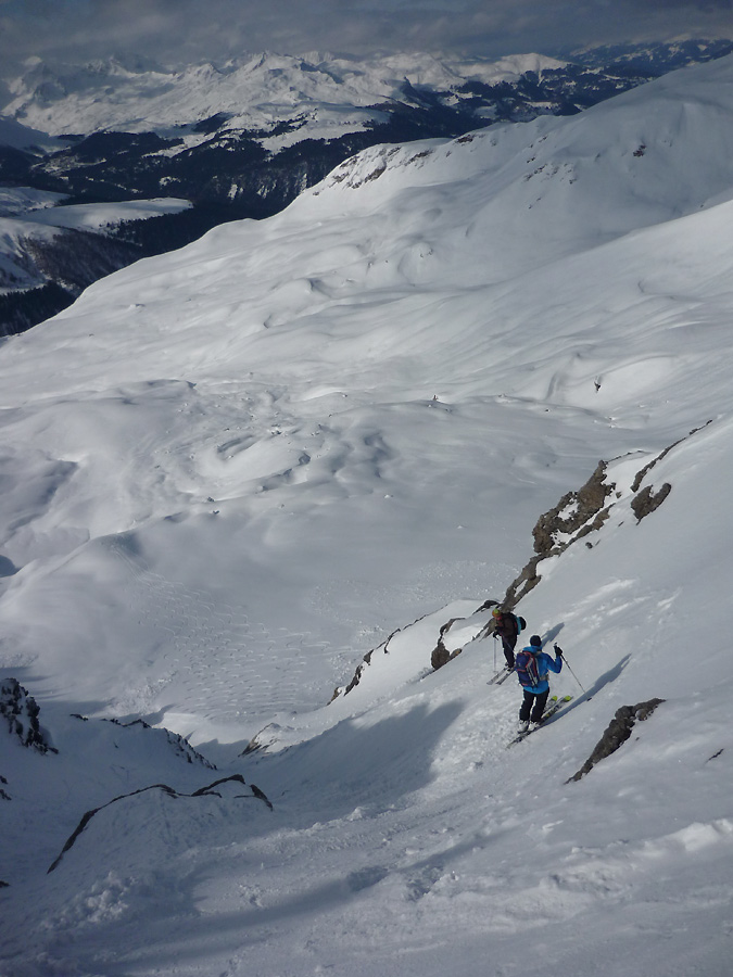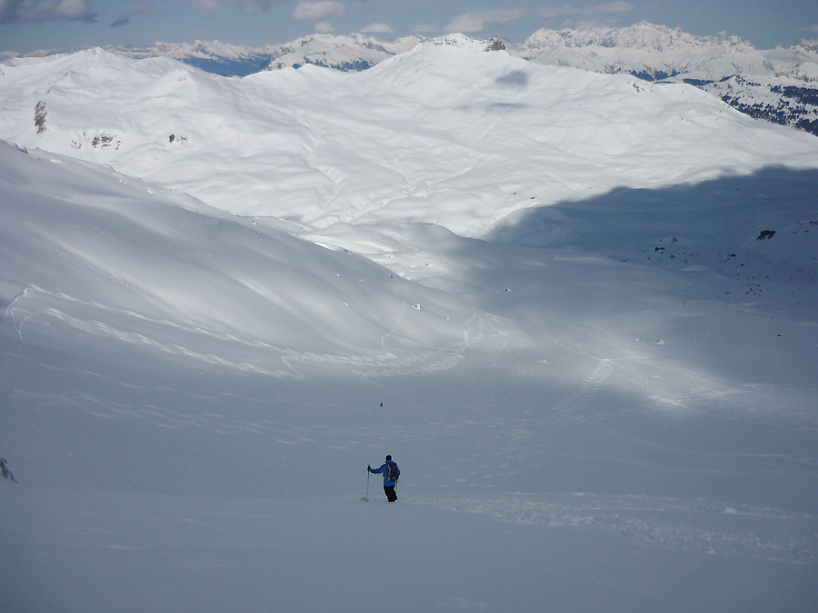 In den Hochlagen ca. 30 cm Pulver auf einer verharschen Altschneedecke, unterhalb von ca. 2000 m liegen dann nur noch ca. 10 bis 15 cm auf einer kompakten Altschneedecke. Südseitig bis ca. 2300 hinauf Firnverhältnisse. Nordseitig liegt der Schnee bis auf 1100 m, darunter kann man sich noch bis ins Tal (Küblis und Fideris) so einigermaßen durchmogeln mit abschnallen und kurzen Tragepassagen. Es war sehr wenig los im Gebiet, sogar nach dem sonnigen Mittwoch konnte man am Donnerstag im Nahbereich der Pisten am Jakobshorn noch jede Menge unverspurte Hänge finden.