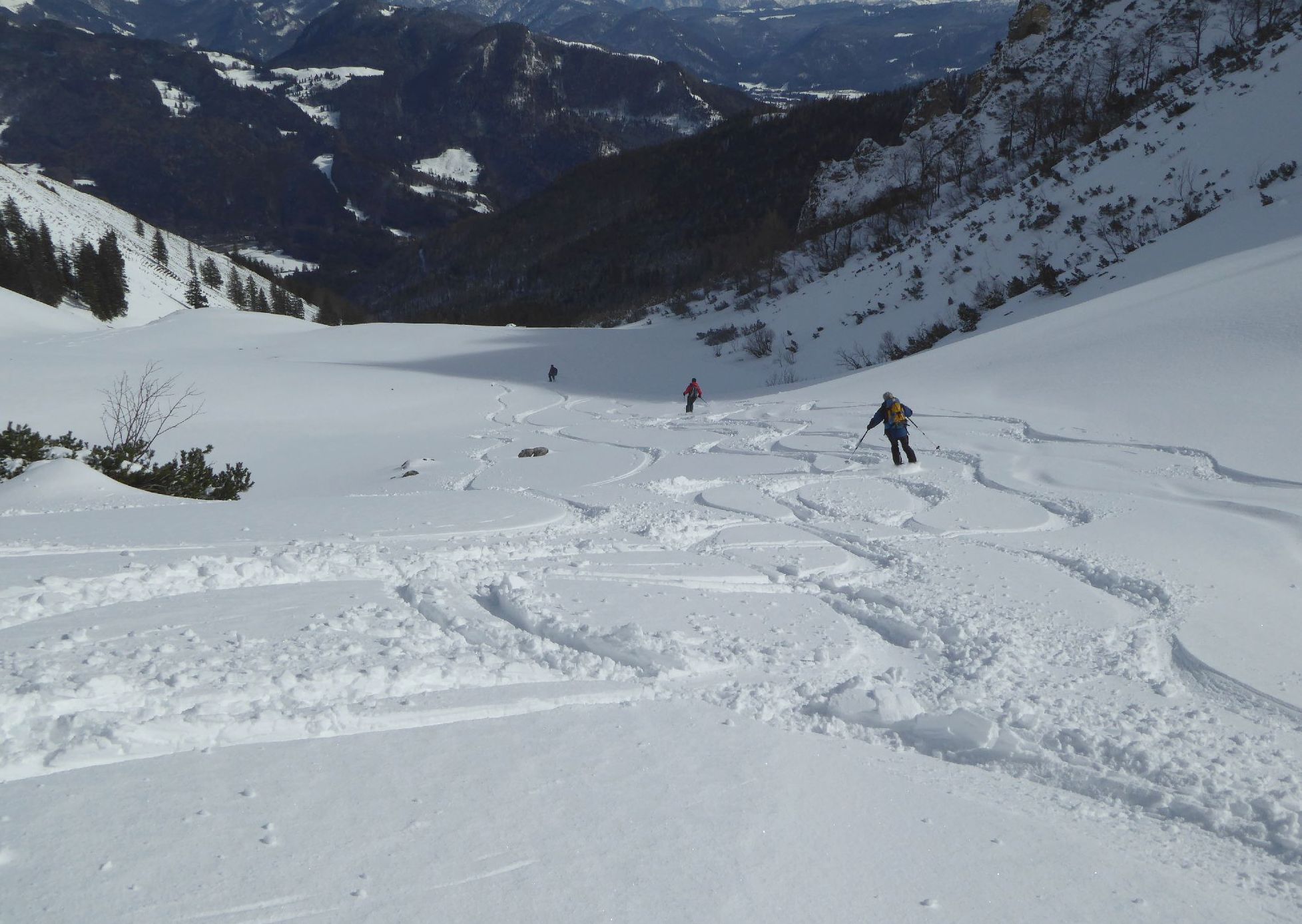 Schöner Pulver auf fester Altschneedecke, am Mittag von der Sonne schon angefeuchtet, aber alles gut zu fahren.