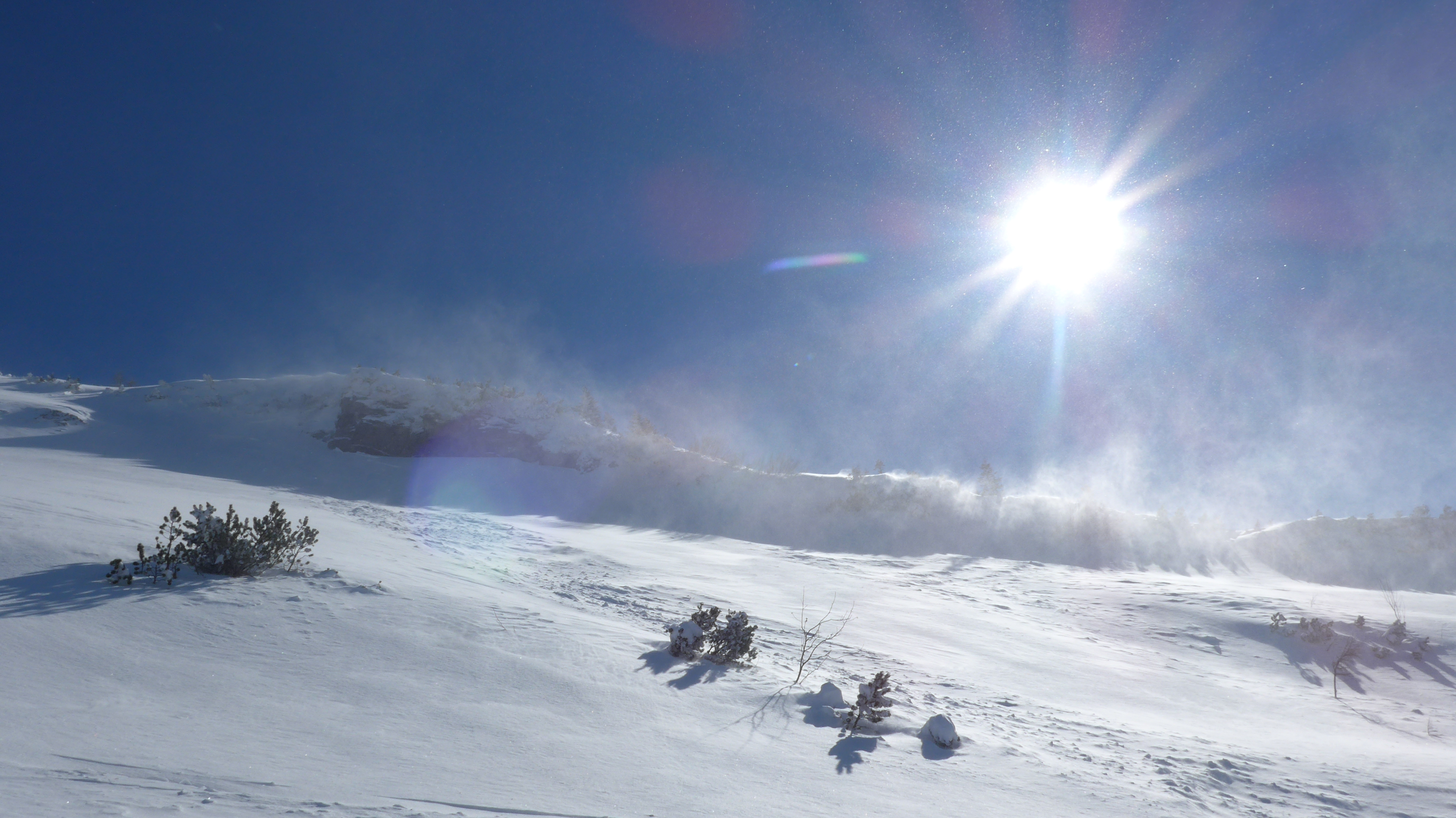 Tourenverhältnisse: Windstill + wolkenlos. In Gratnähe starke Süd-Windböen, die einiges an Schnee in die NW-Hänge trugen. 30 cm tiefe Spur war in kurzer Zeit zugeweht.