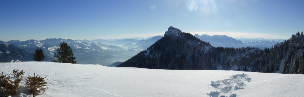 Tourenverhältnisse: Der untere Ziehweg hat gerade noch Schnee - im Aufstieg ausreichend, bei der Abfahrt auf Steine aufpassen. Ab der Schoißeralm gute Schneelage, außer am letzten Westhang vor dem Gipfel, der wie so oft abgeblasen ist, aber man kommt mit Ski hoch. Strahlender Sonnenschein und ausgezeichnete Fernsicht auf dem Gipfel, dazu windstill und mild. Abfahrt: die oberen Hänge haben noch tiefen, lockeren Pulver, ein Vergnügen