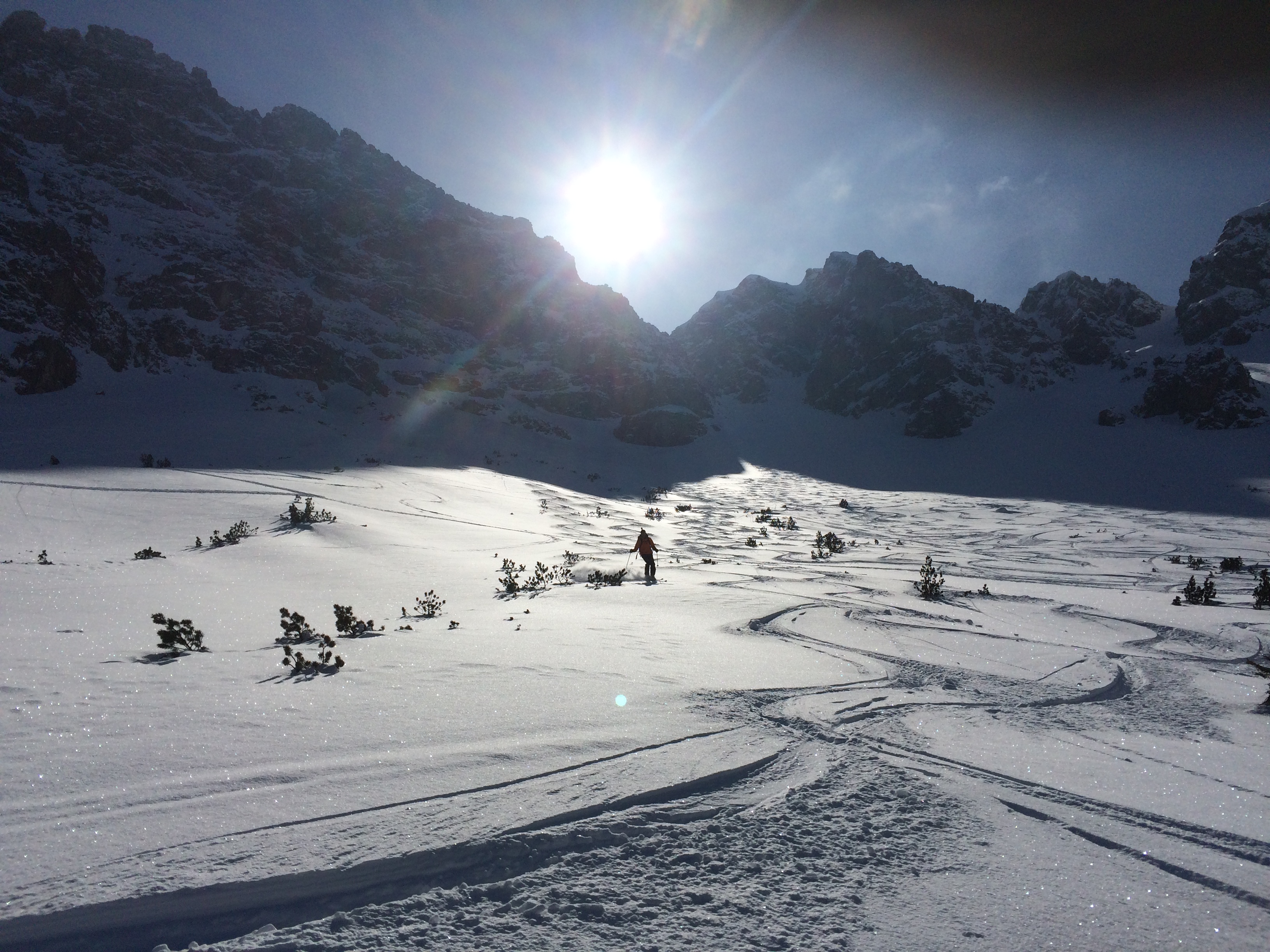 Tourenverhältnisse: Super! Massig Schnee von unten weg, noch pulvrig, da Thanellerkar und Kärlestal recht gut im Schatten liegen und es bislang nicht zu warm war. Nach dem Rintljoch (2166 m) kommt man auf die Südseite. Hier harter, gesetzter Schnee, der im Tagesverlauf weich wird, nachts aber wieder gefriert. Schneeauflage reicht, um mit Skiern bis auf den Gipfel zu kommen.