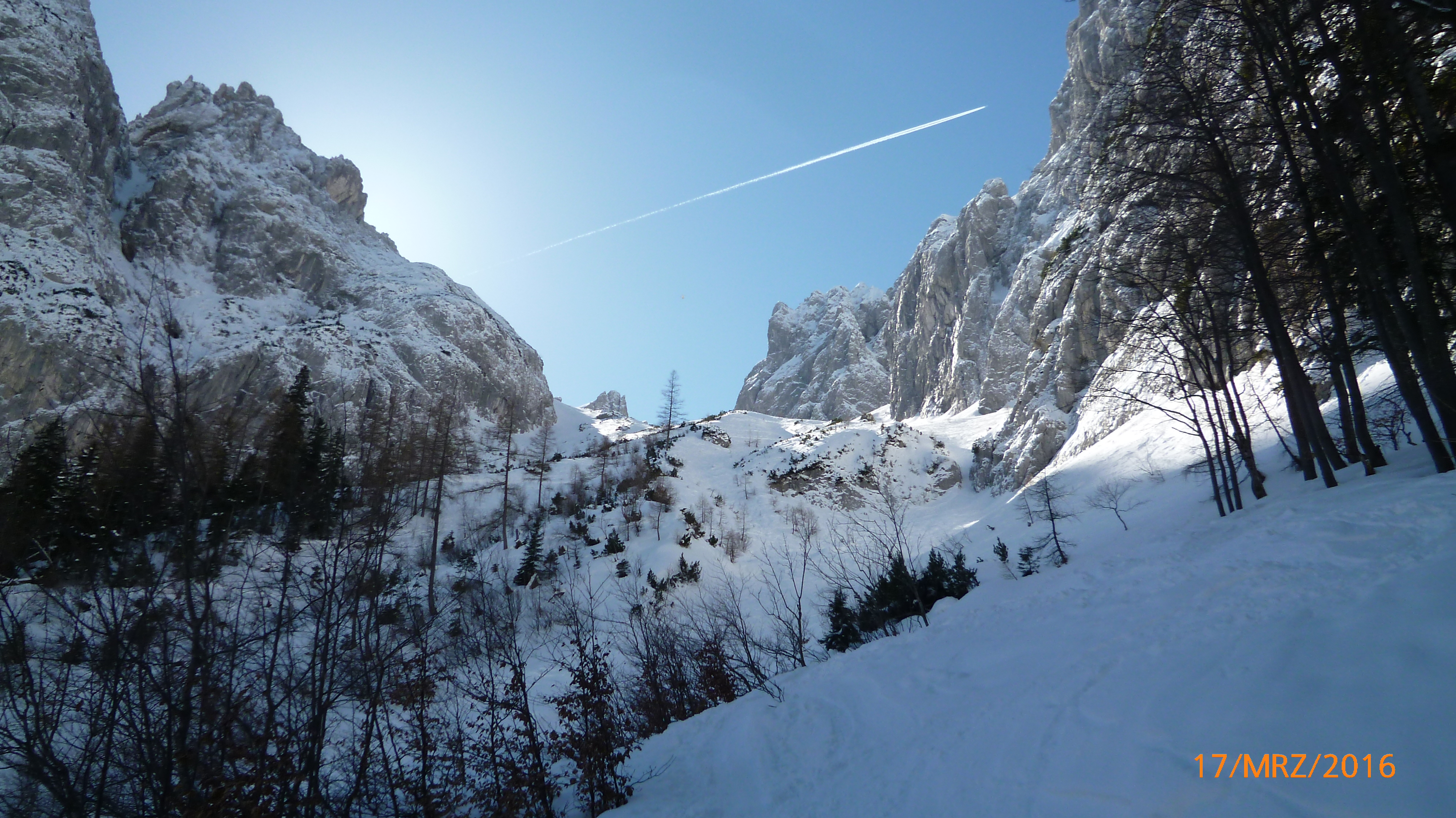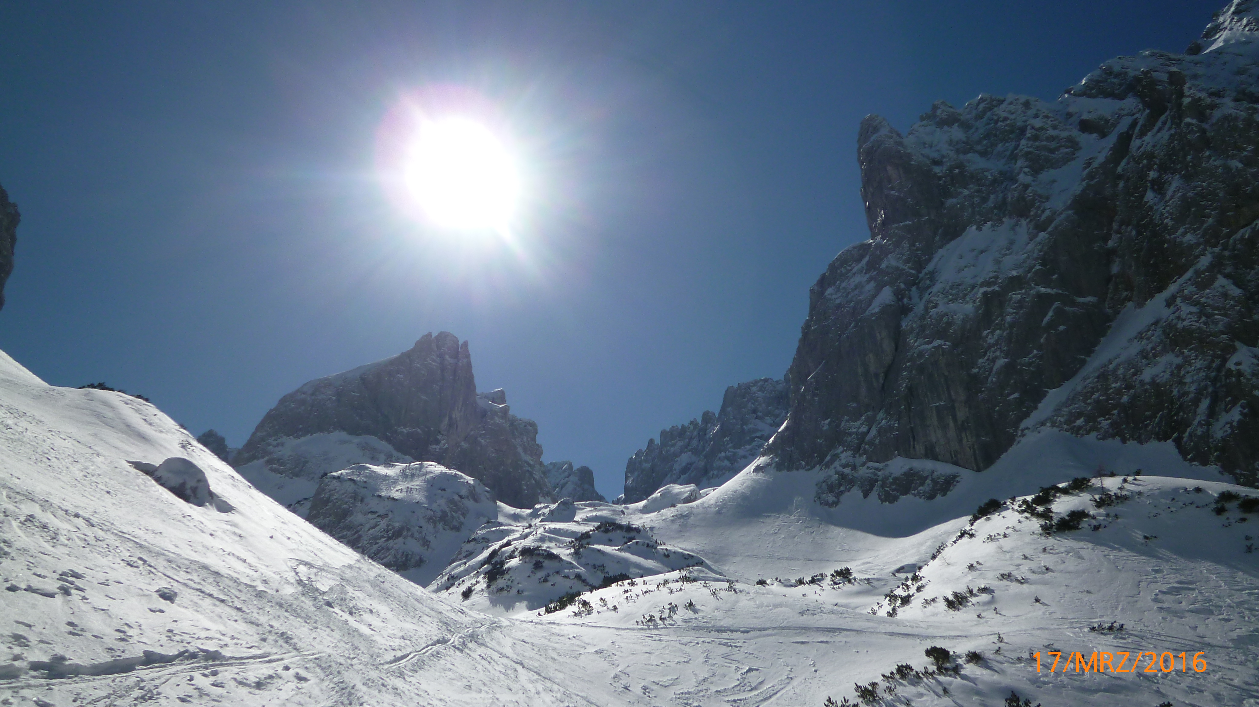Abfahrt anfangs entlang der Aufstiegsspur, dann westlich haltend, nahe der Felswände, wo sich der beste Pulverschnee, ca. 30 cm, befand. Aber etwas Abstand halten, weil immer wieder aus den Wänden Schneerut-