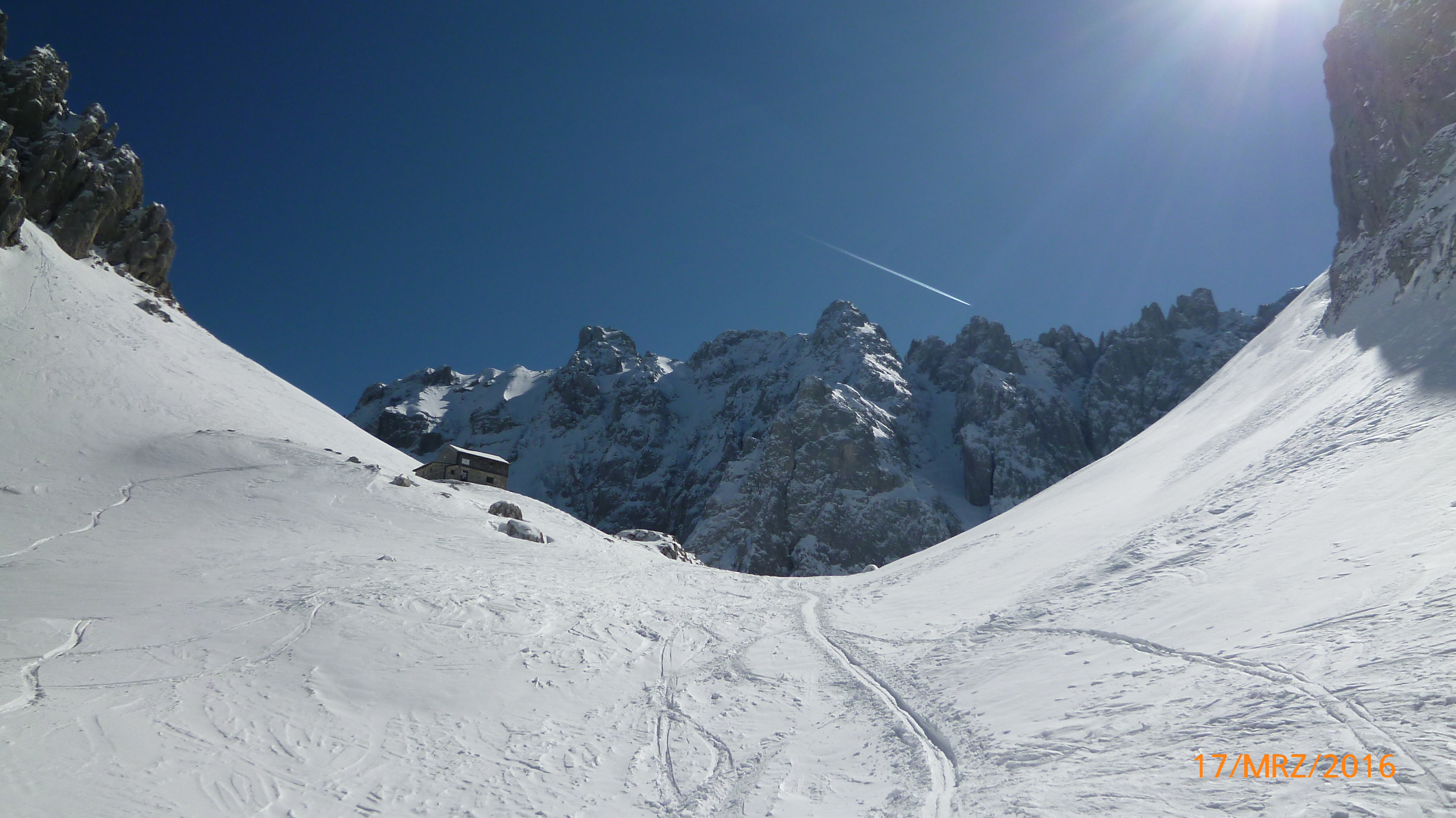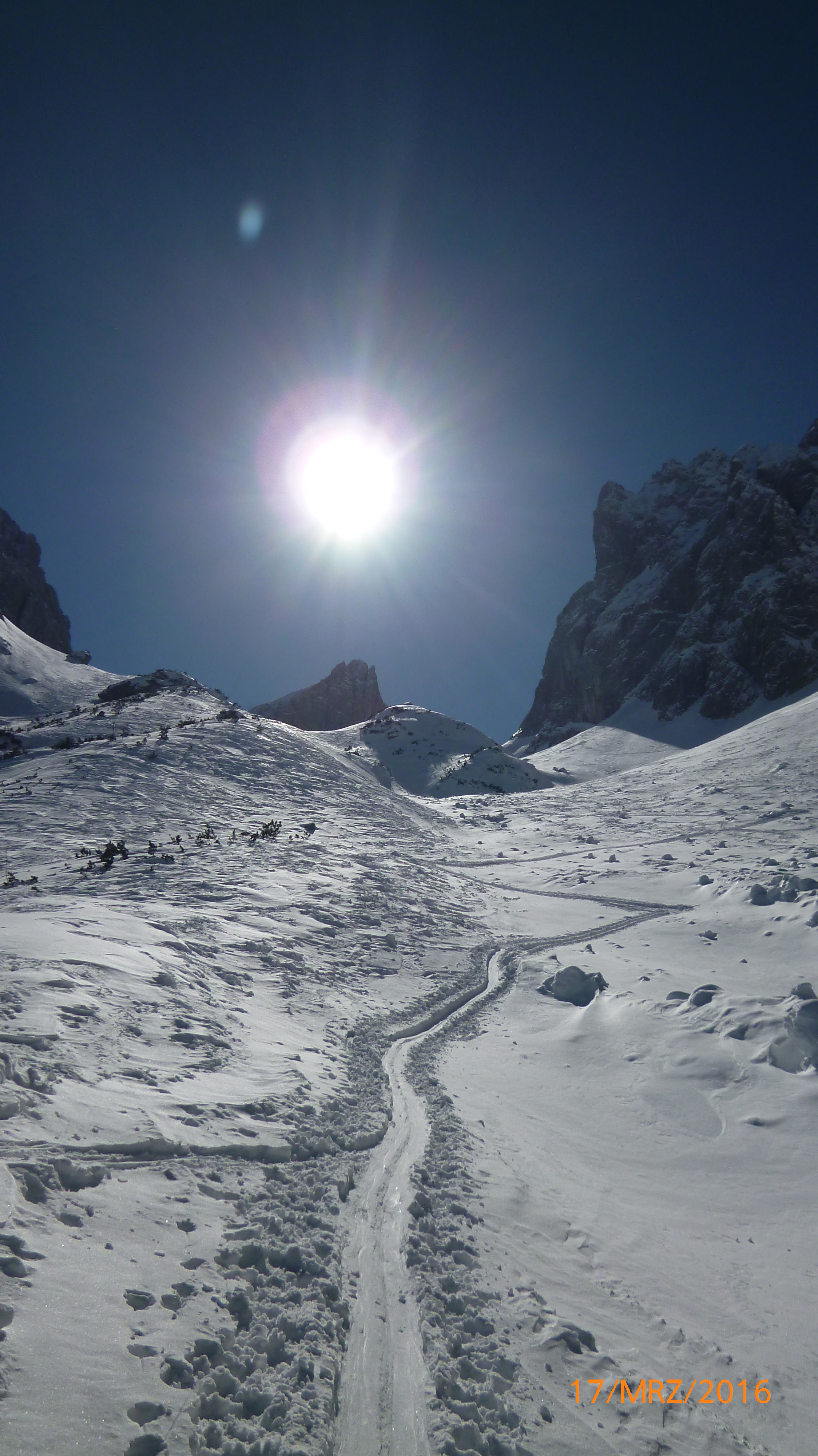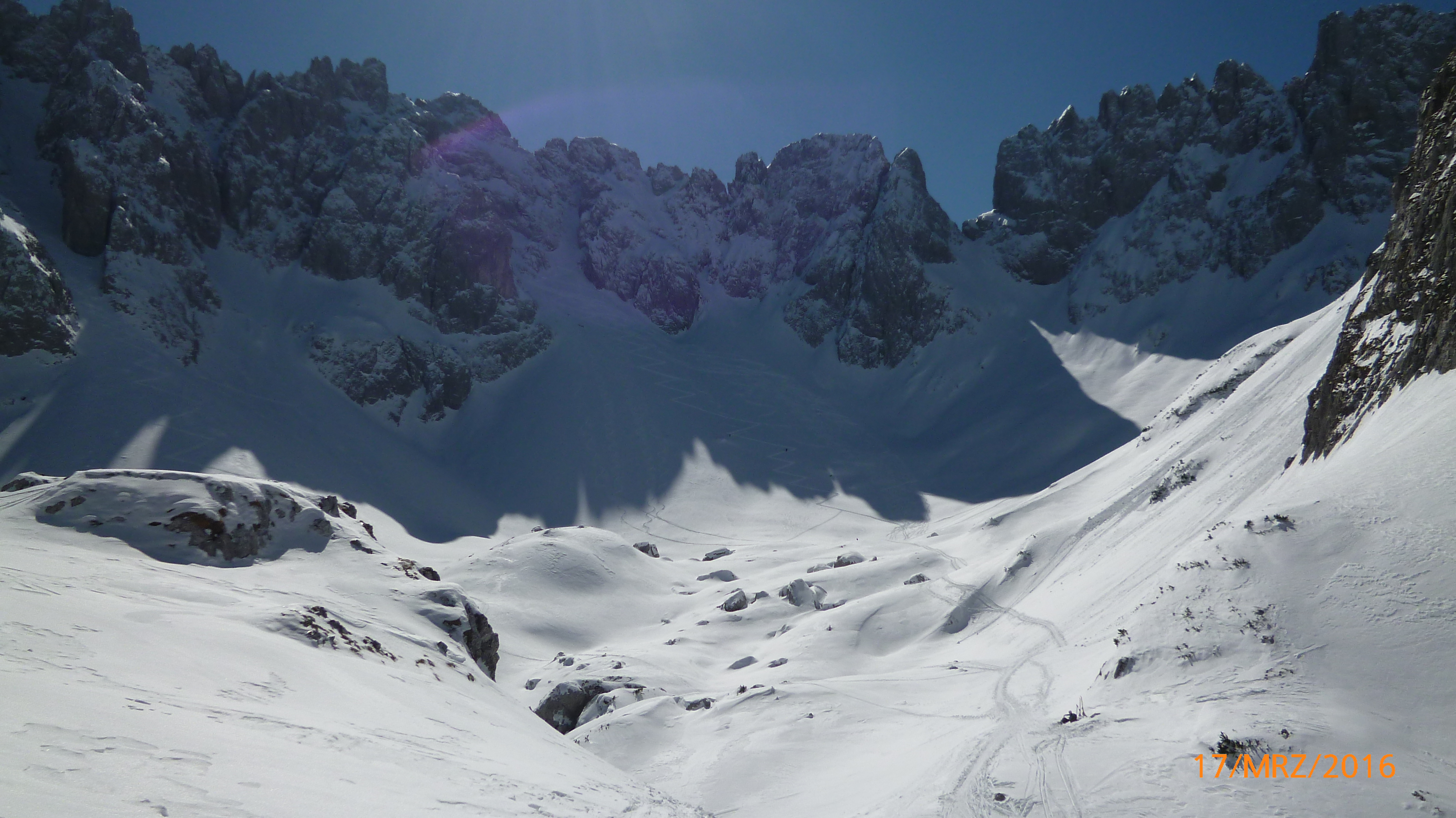 In der Karmitte Bedingungen etwas schlechter durch windverspressten Schnee und Lawinenboller.