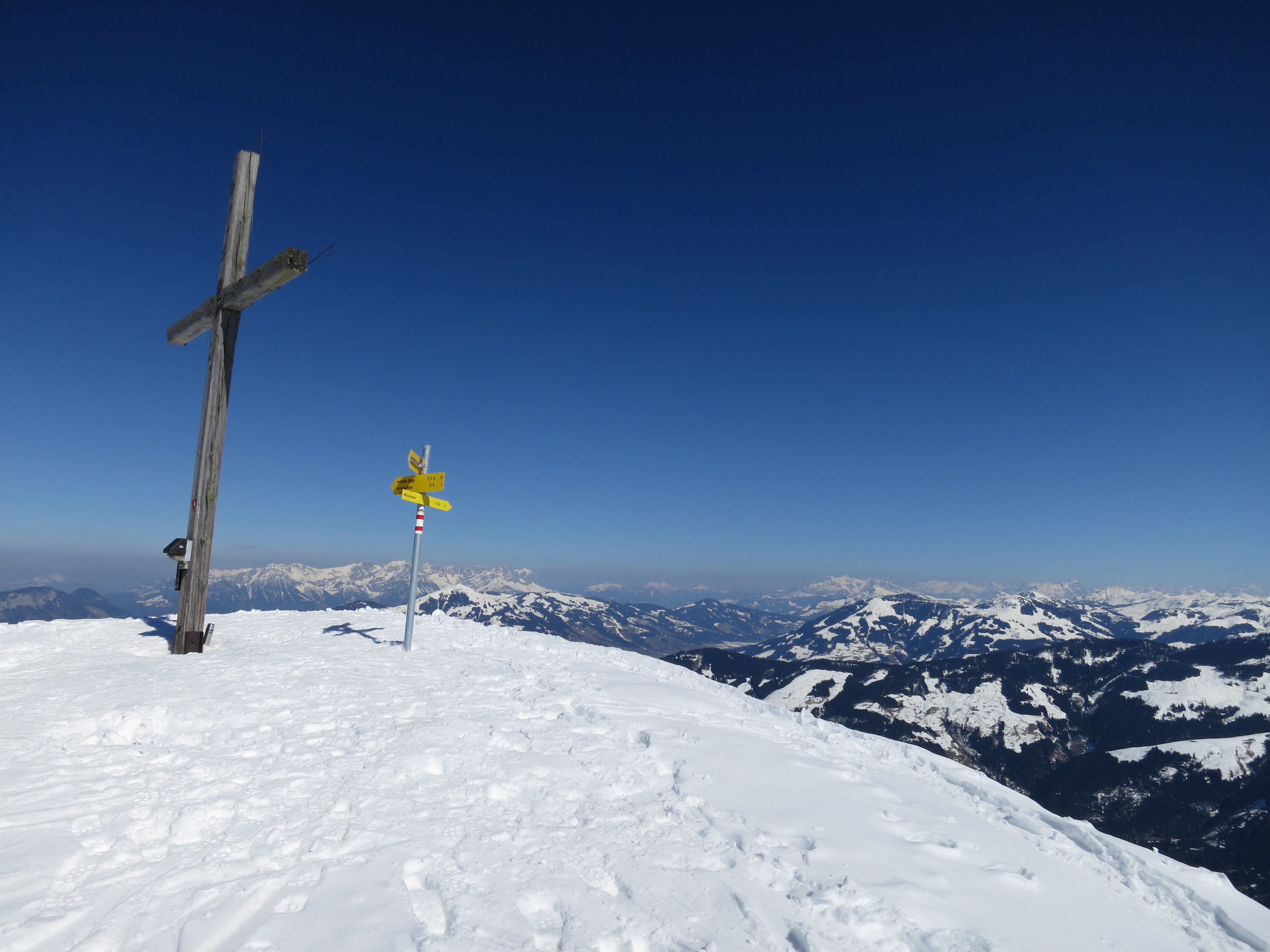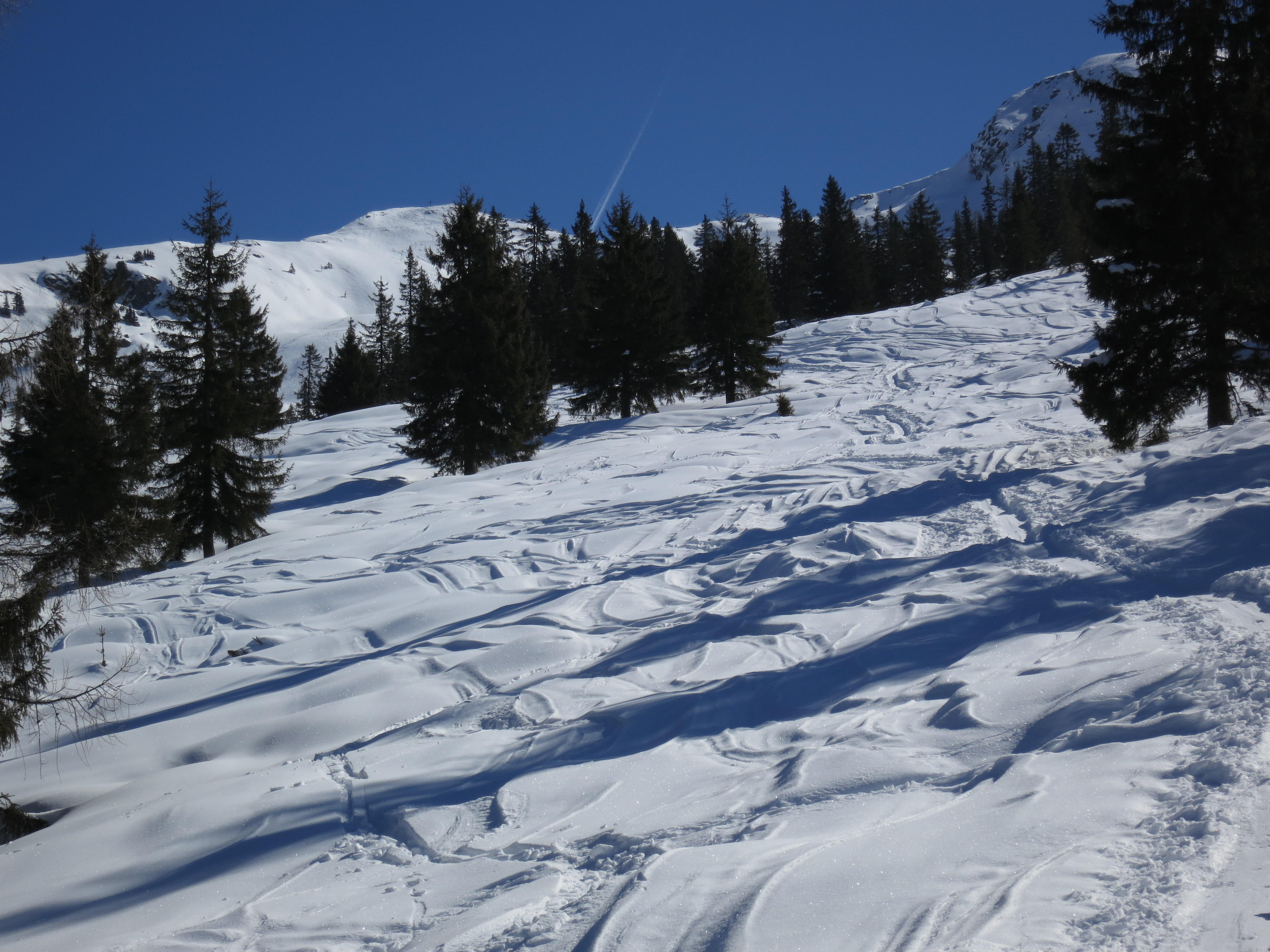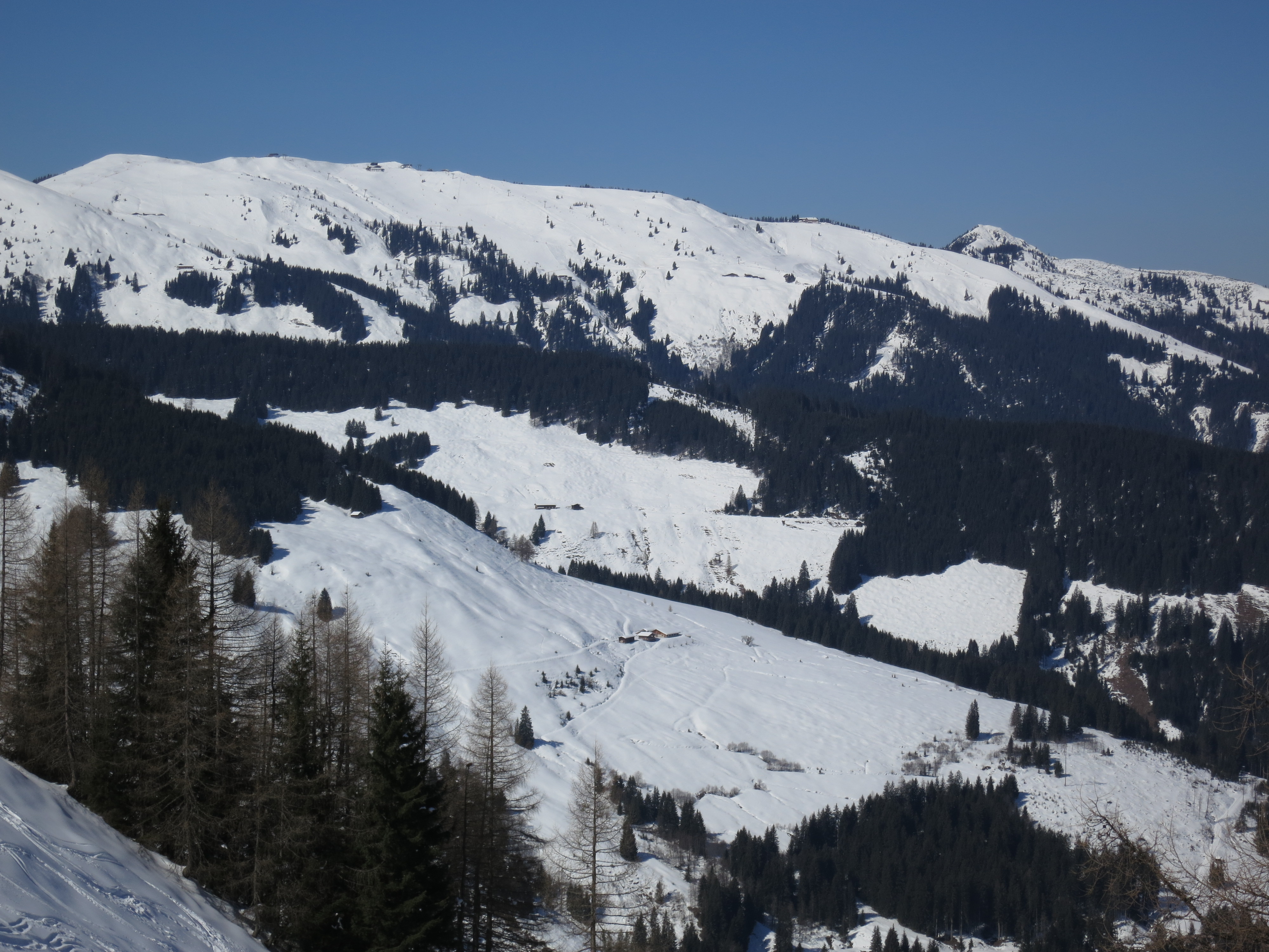 Tourenverhältnisse: recht gut. Von der Brücke über eine geräumte Fahrstraße und weiter durch den Wald zur Koberalm. Ab hier über freies Gelände zum Gipfel. Abfahrt in etwa der Aufstiegsspur folgend zur Kober Alm. Weitere Abfahrt dann aber nicht in Richtung Wald, sondern nach Westen über baumfreie Hänge und kurzen Forststraßenabschnitten bis zueiner Furt am Parkplatz beim Weiher (den sollte man gleich für den Aufstieg vorsehen). Nun ca. 1 km zum Parkplatz an der Brücke. Schneeverhältnisse: eigentlich alles außer Bruchharsch (den hatte die Sonne schon aufgeweicht)
