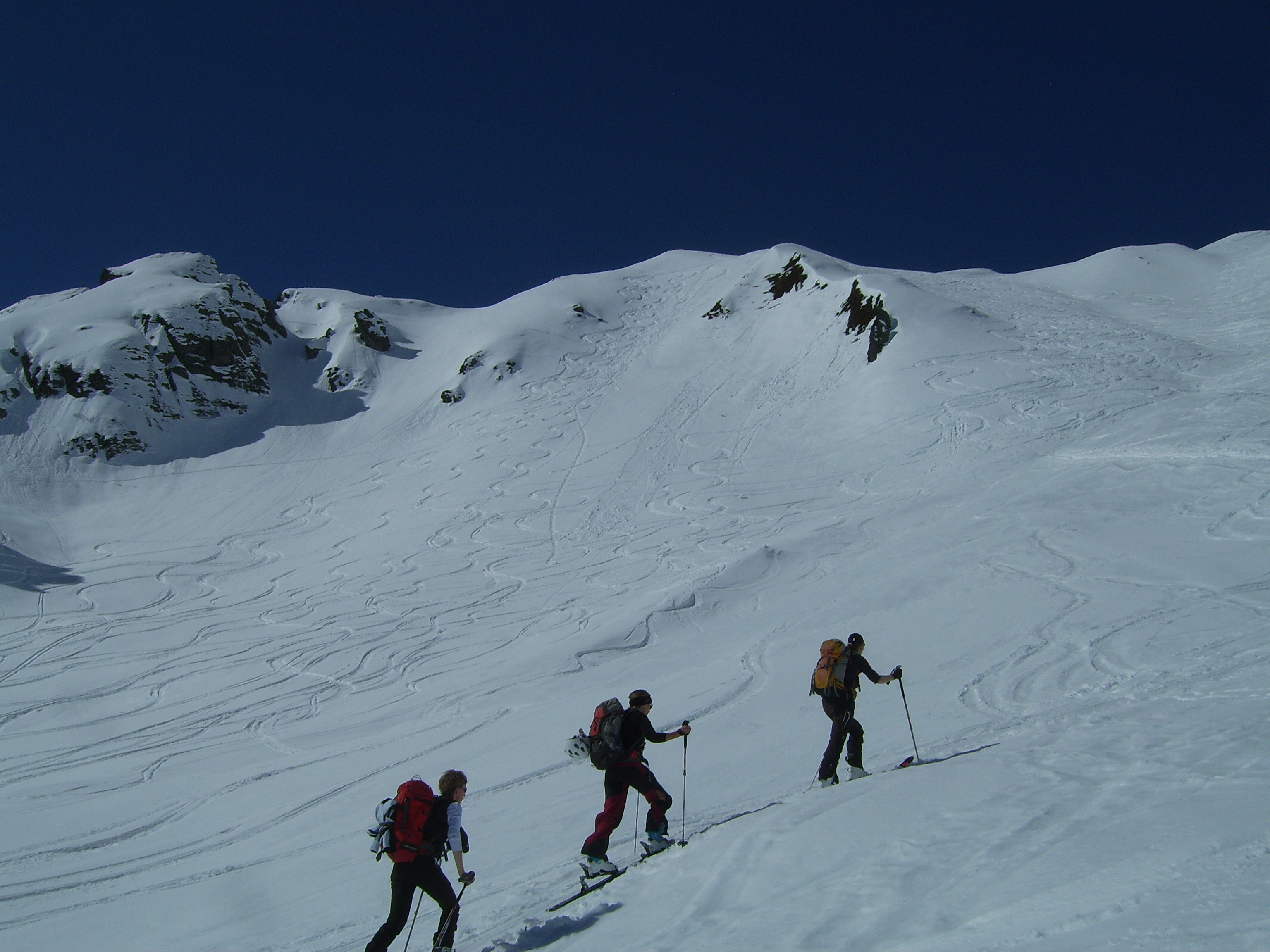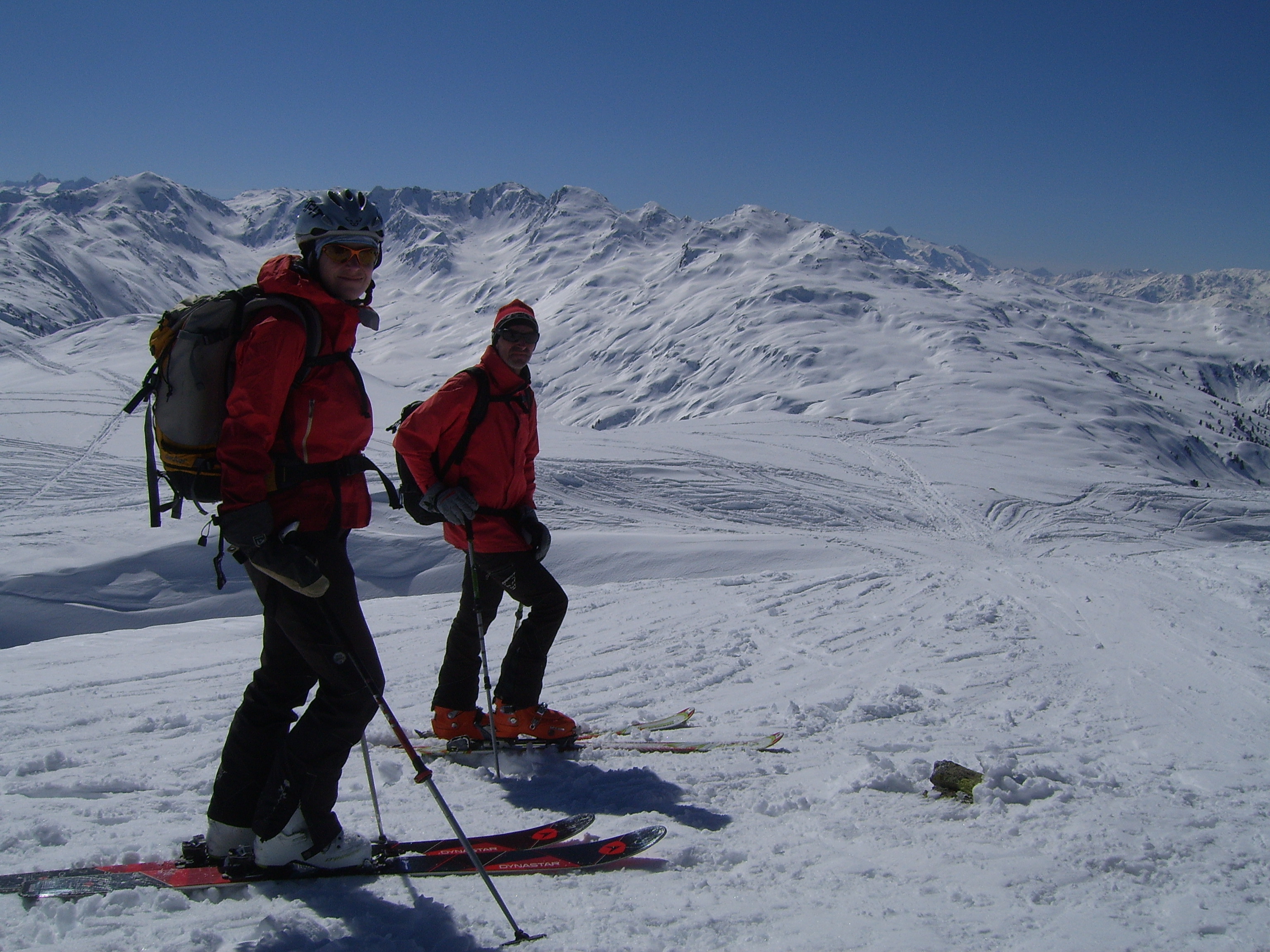 Tourenverhältnisse: trotz deutlichen Minus-Temperaturen am Ausgangspunkt gings in der Früh schon gut ohne Harscheisen. 2 Bachüberquerungungen erfordern jeweils kurzzeitiges Abschnallen. Erstaunlicherweise blieb uns trotz der relativ hohen Tagestemperatur bei der Abfahrt gegen Mittag ein 'Absaufen' der Ski erspart. In der Summe a 'gführiger' Firn, im Kar oberhalb der Seefeldalm haben wir sogar noch (etwas schwereren) Pulver gefunden. Heute relativ wenig los auf dieser Tour (P war voll), obgleich die Hänge schon ziemlich zerfahren sind. Heute natürlich fantastische Fernsicht. Abfahrt bis zur Erla-Hütte noch sehr gut möglich.