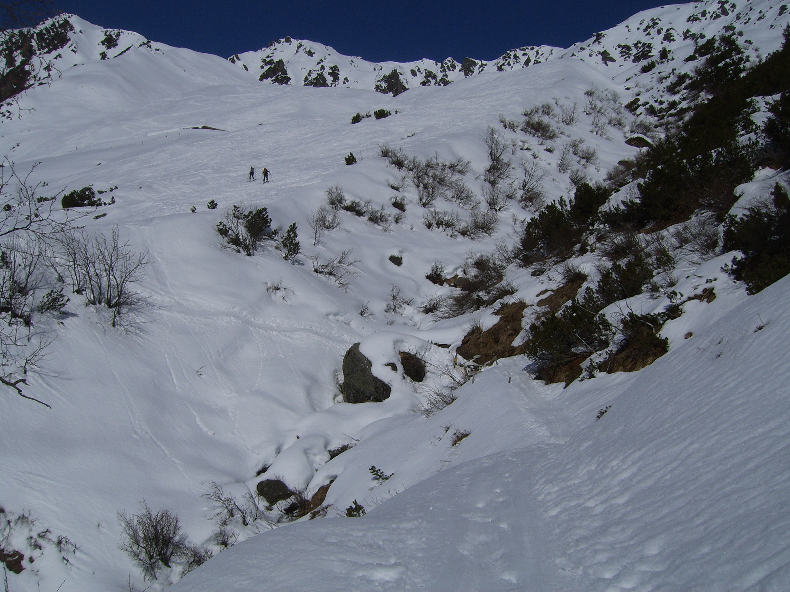 Prognose: die Schneeschmelze schreitet bei diesen Temperaturen sichtbar voran, so dass die kleineren Rinnsale gerade im unteren Bereich der Tour auch allmählich frei werden. Insgesamt im Langen Grund aber noch sehr gute Schneeverhältnisse.