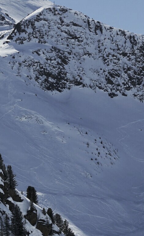 Frisches, durch Freerider ausgelöstes Schneebrett unterhalb der Mute im ca 35° steilen Gelaende: