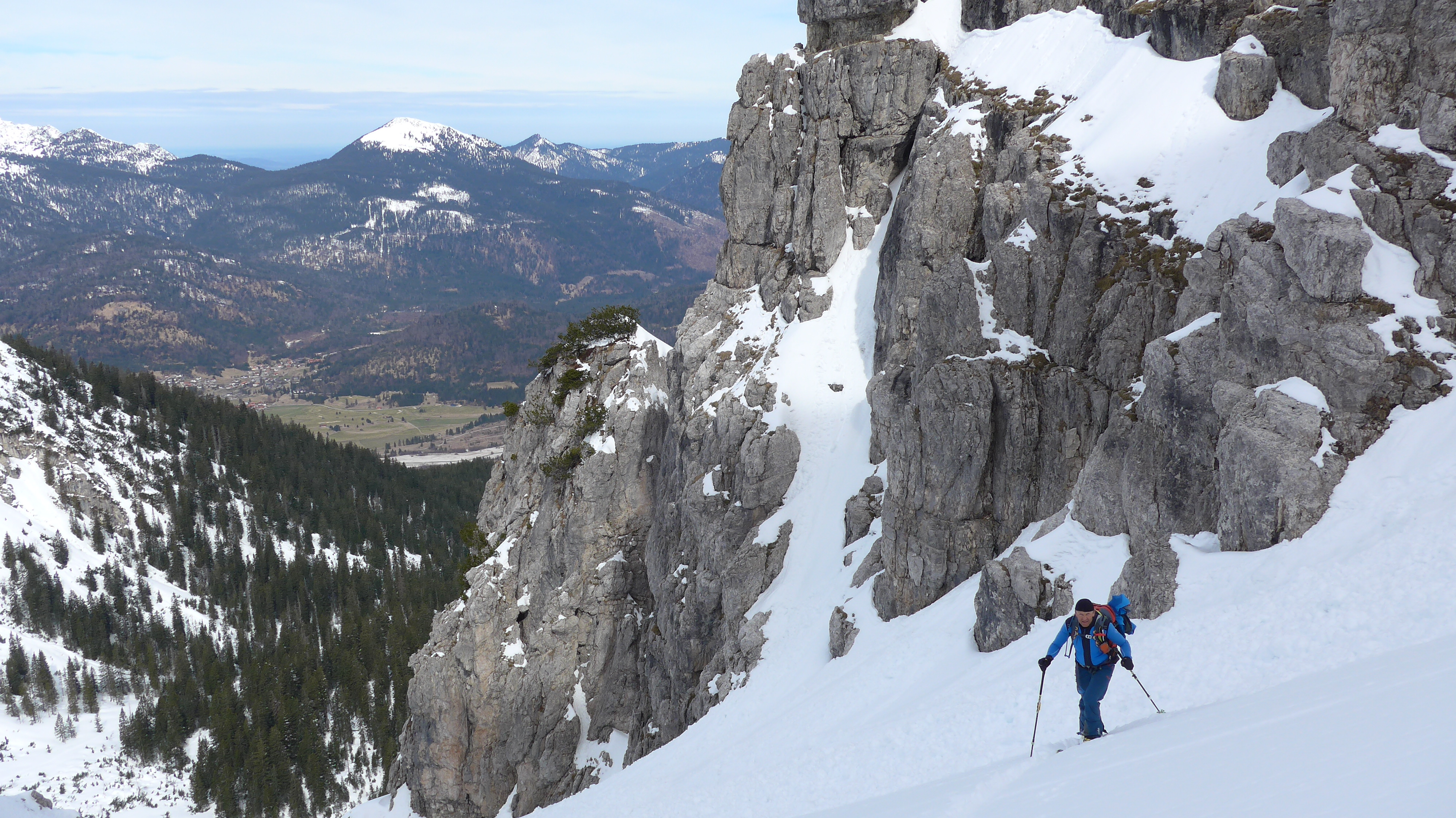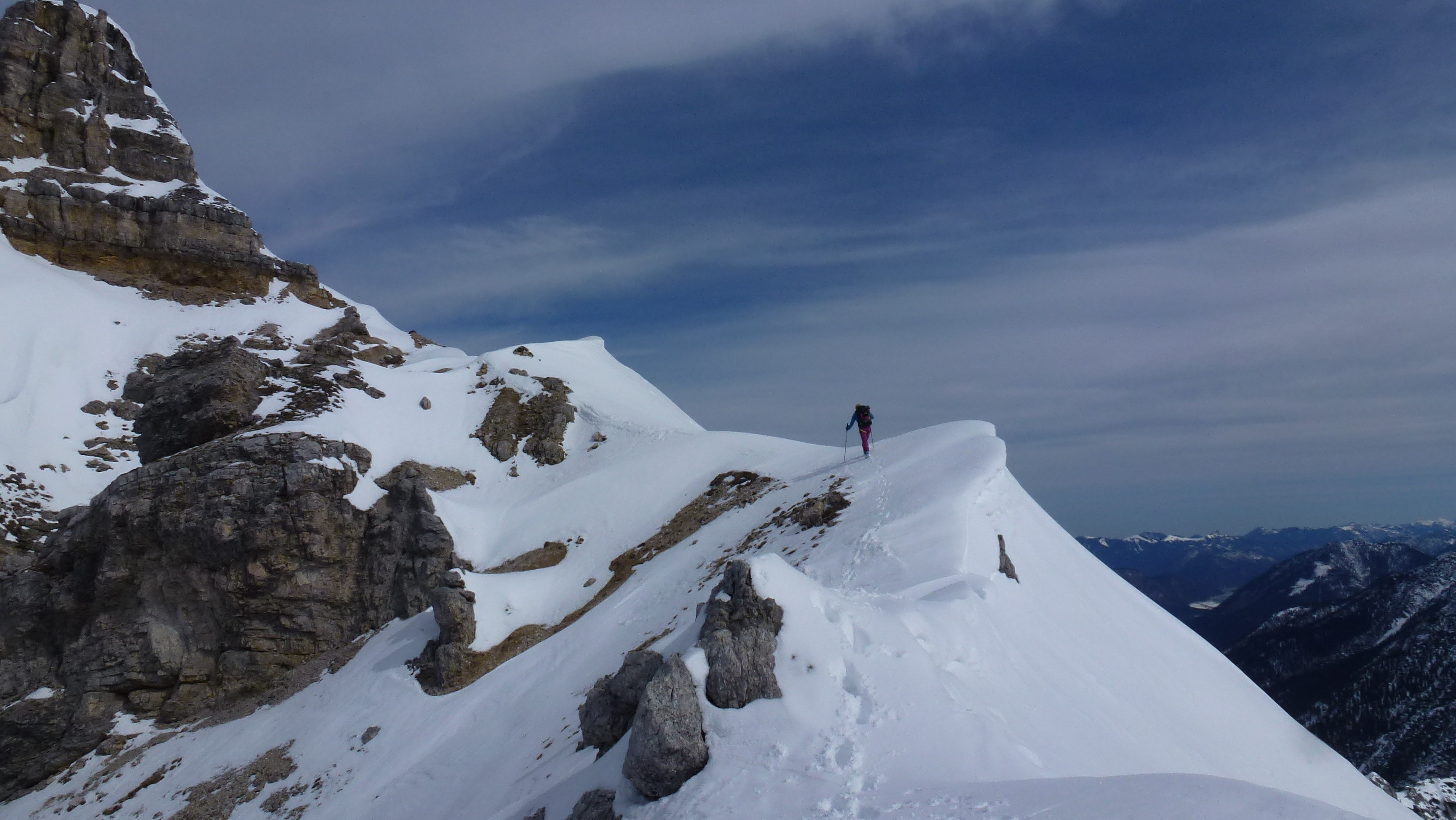 Den leicht überwächteten Grat zur heiklen Querung kurz unterhalb der Schöttelkarspitze begangen. Die Querung war uns zu spannend, bei dem Absturzgelände und der aufgeweichten Schneeauflage. Wendepunkt!