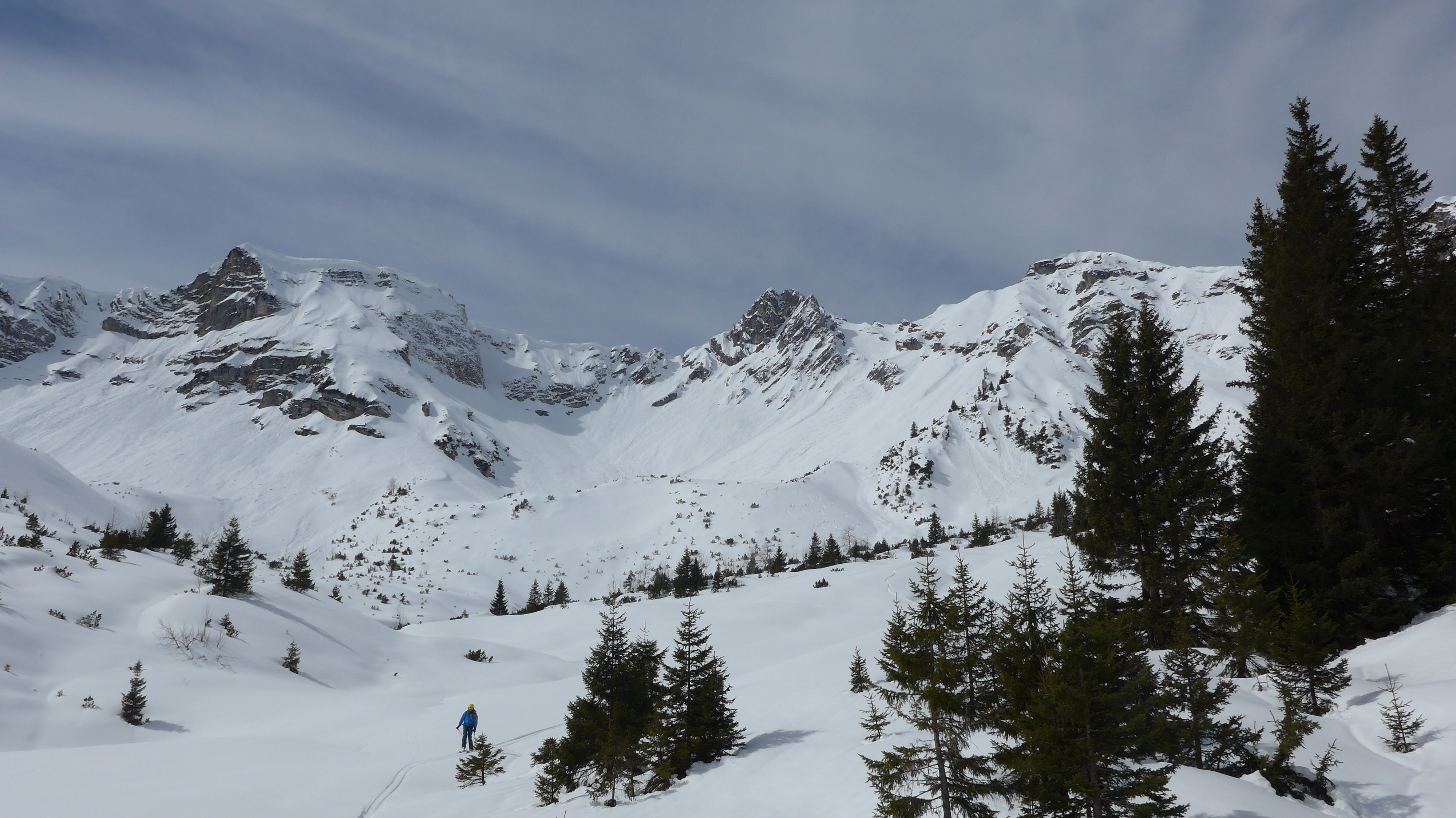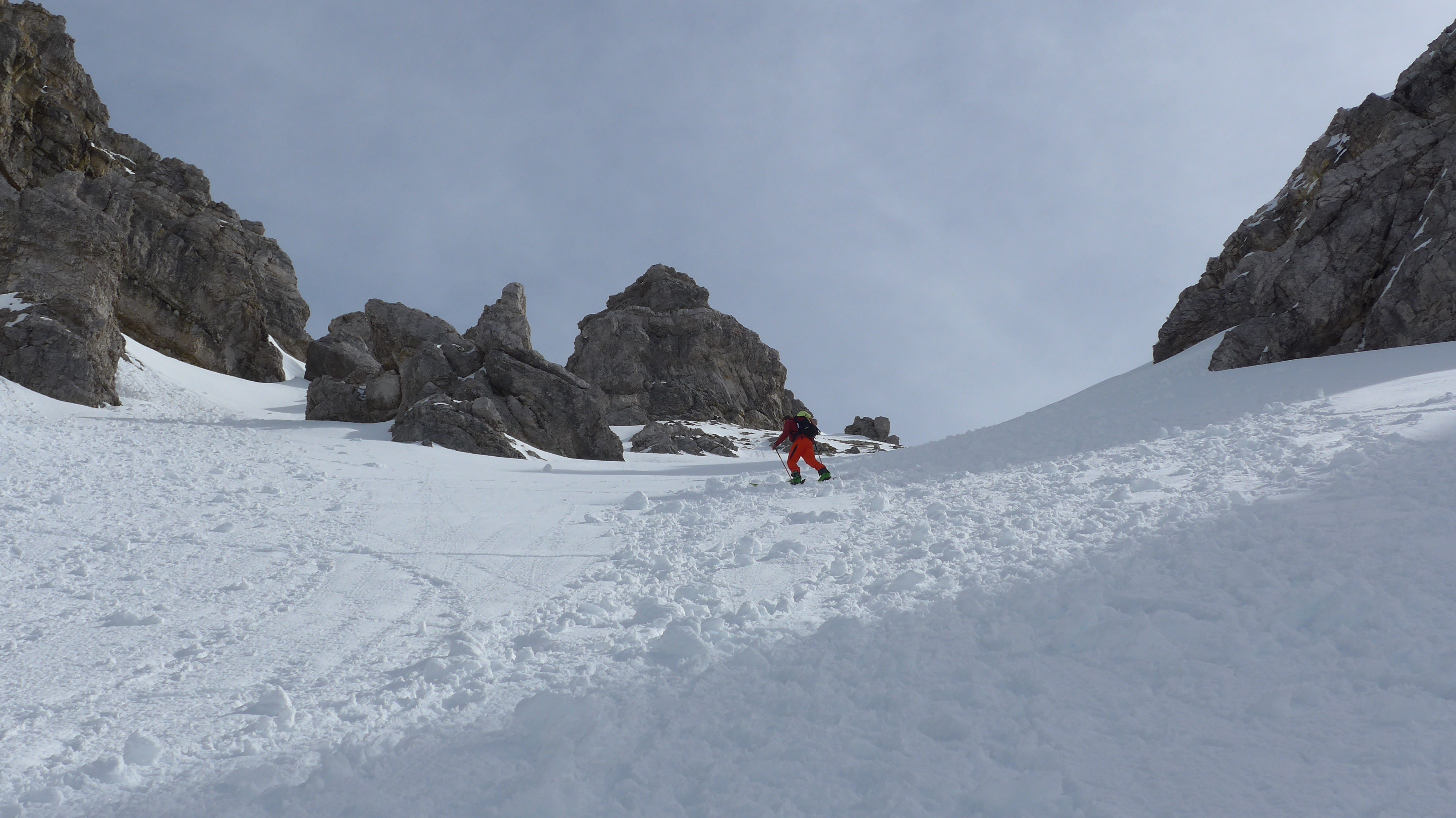 Tourenverhältnisse: 45 min. Ski tragen - apere Forststraße Richtung Fischbachalm. Abzweig zum Schöttelkar genommen. Die sehr steile Rinne (ca. 37 °) zur Scharte hinauf. Erhoffte mir Pulver in der Rinne... Realität: Bruchharsch, breiter Lawinenbollerkegel + ein kurzes Stück schmaler Pulverkorridor. Na, das wird keine erfreuliche Abfahrt geben. Kaum Wind.