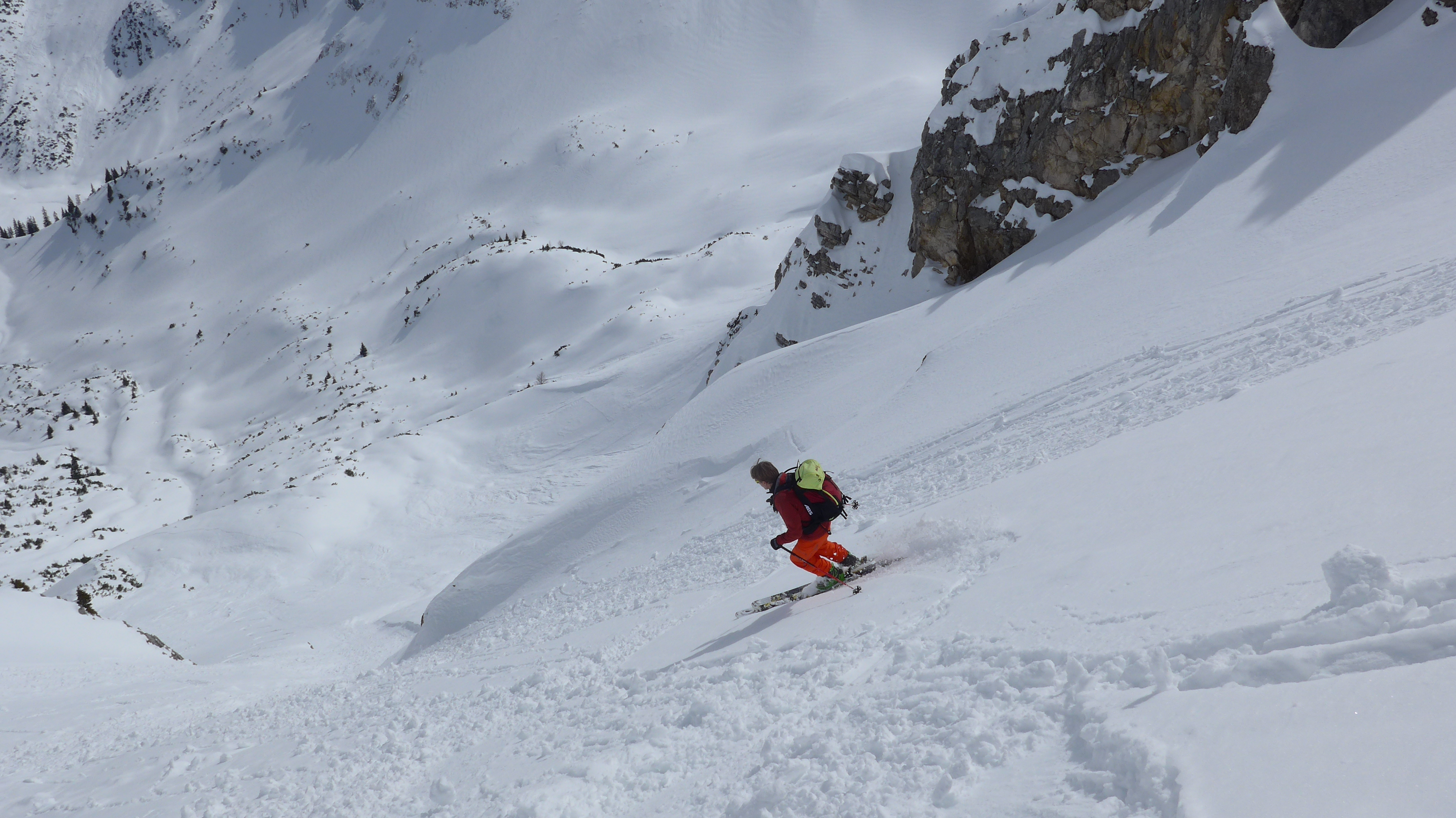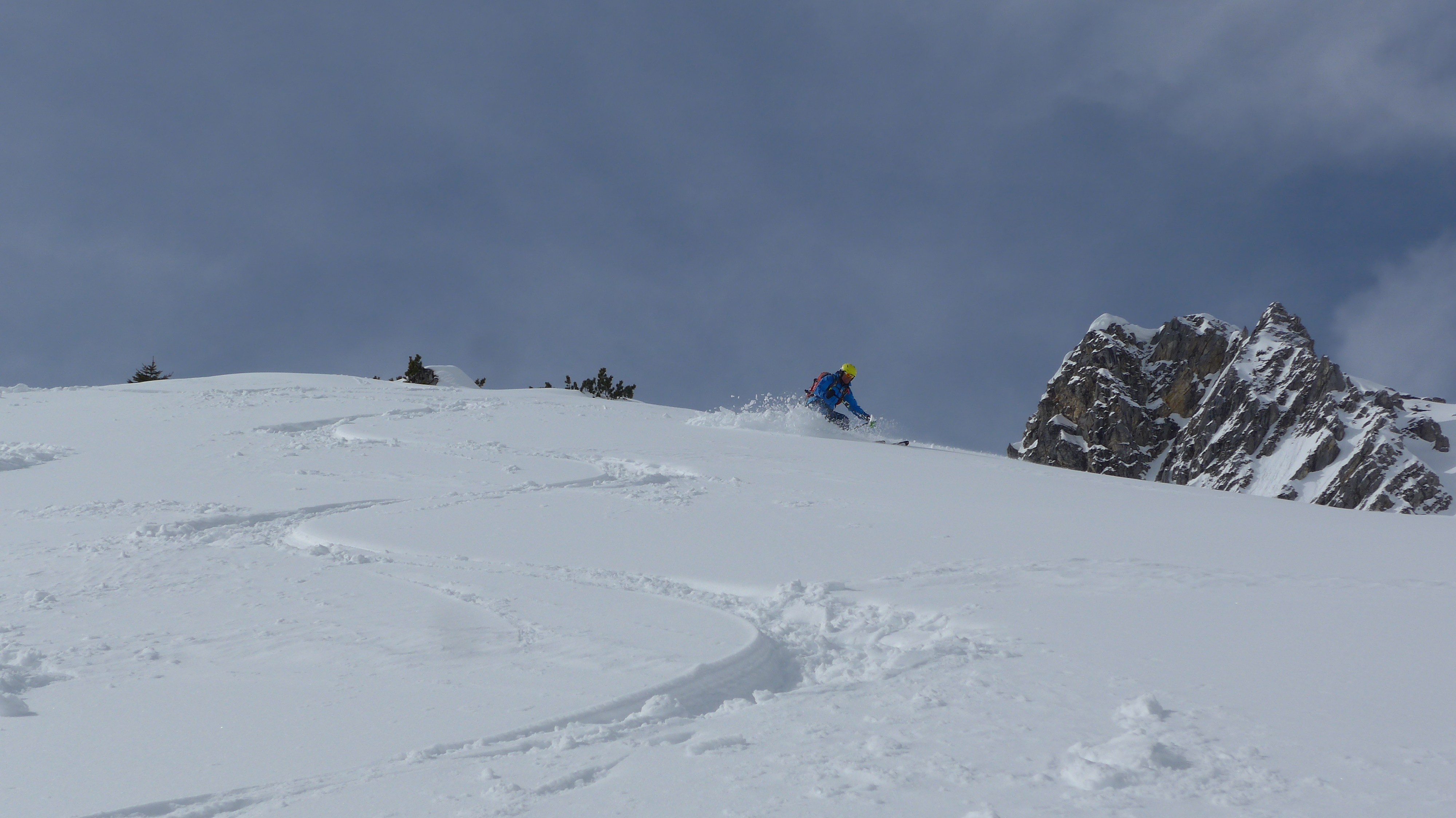 Umdisponiert! Die Ostabfahrt lockte mit einer schönen steilen Abfahrt im "Smoothie"-Schnee (noch kein Firn) zu den Soiernseen (recht windig). An der Bergwachthütte ein toller Rastplatz mit phenomenalem Ausblick.