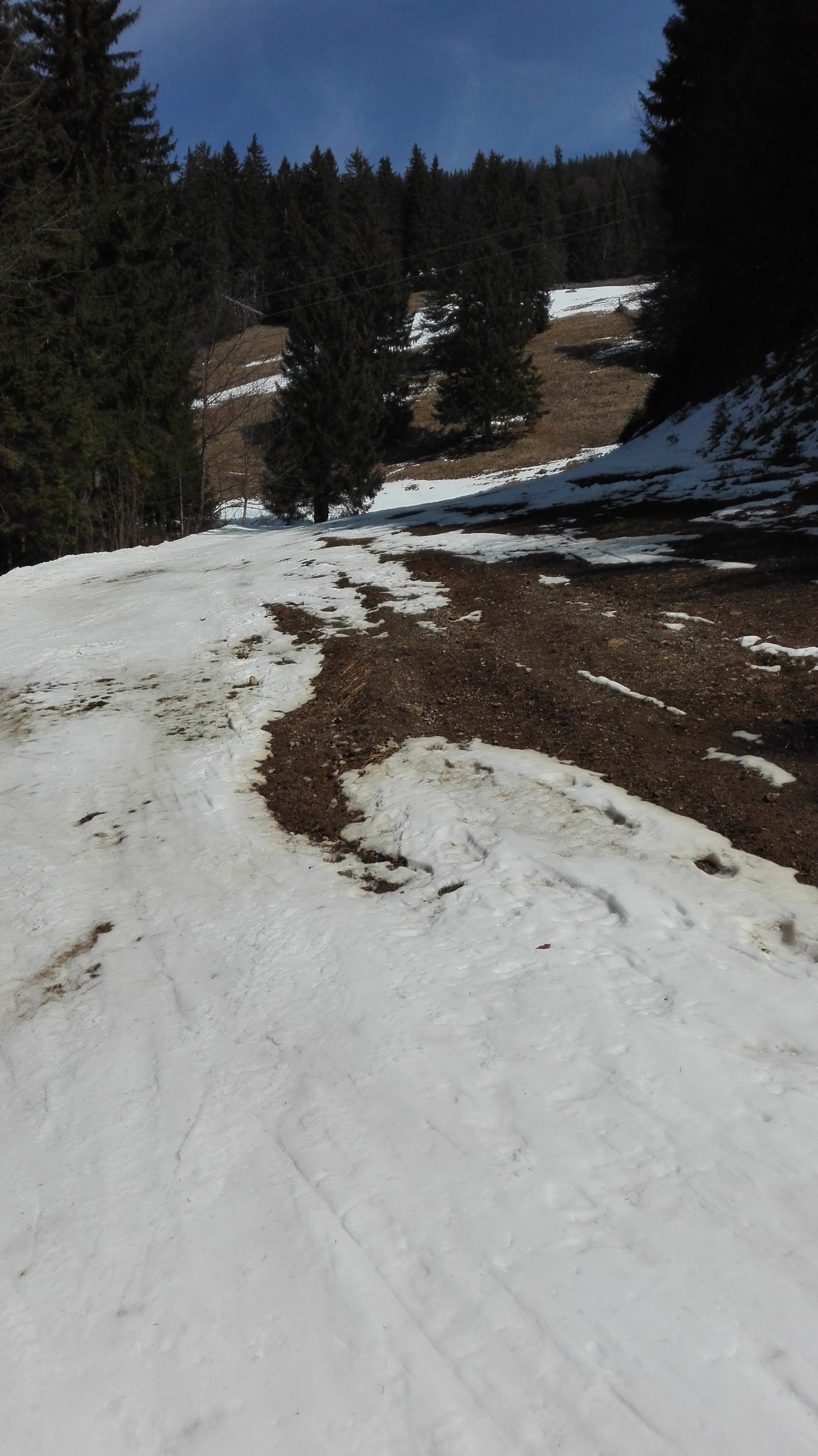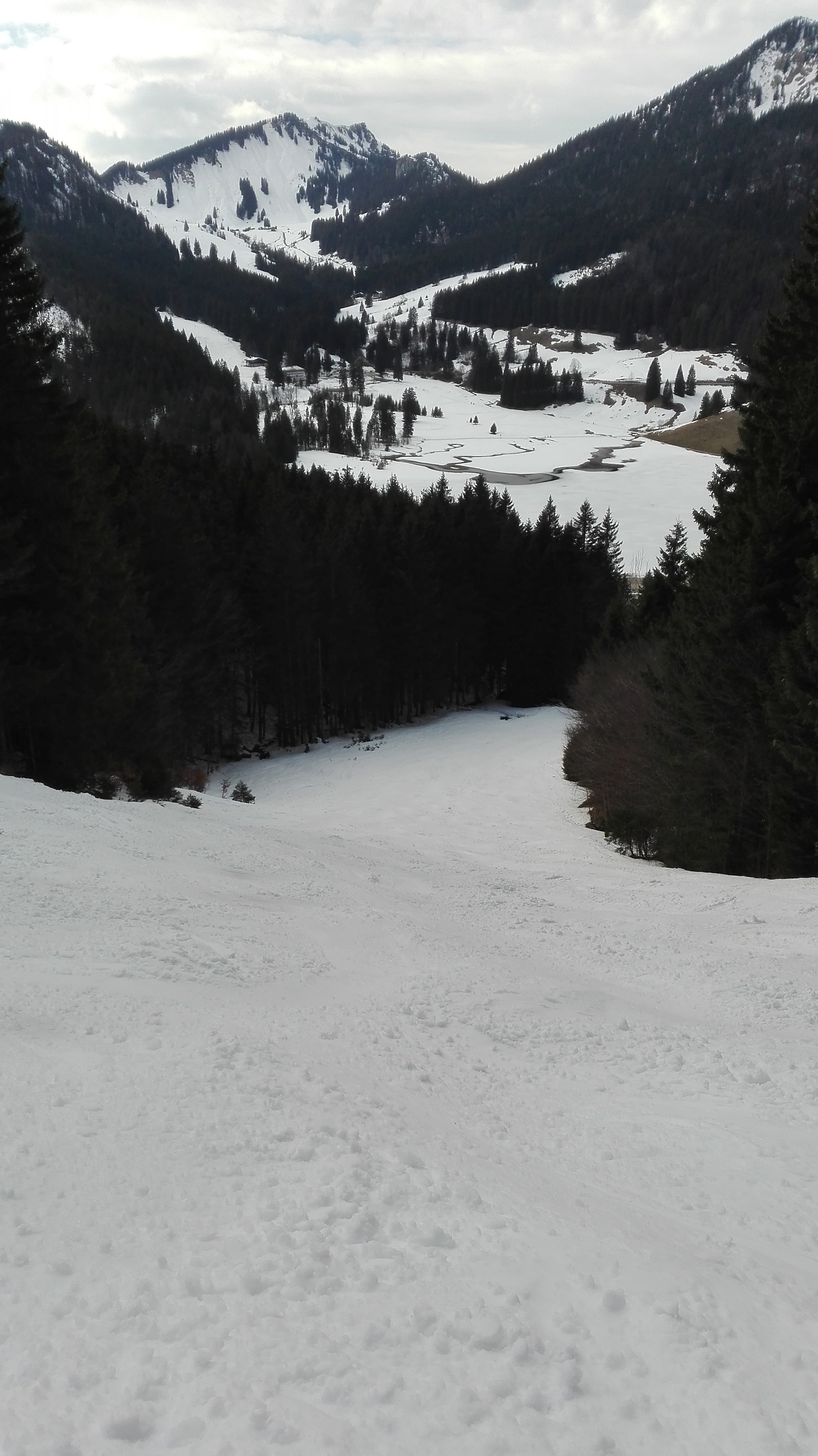 Prognose: bleibt insgesamt noch so, bei der kurzen Querung am Ende des Unteren Lochgrabens wird das Schneeband allerdings zunehmend schmäler und der Dreckfleck größer