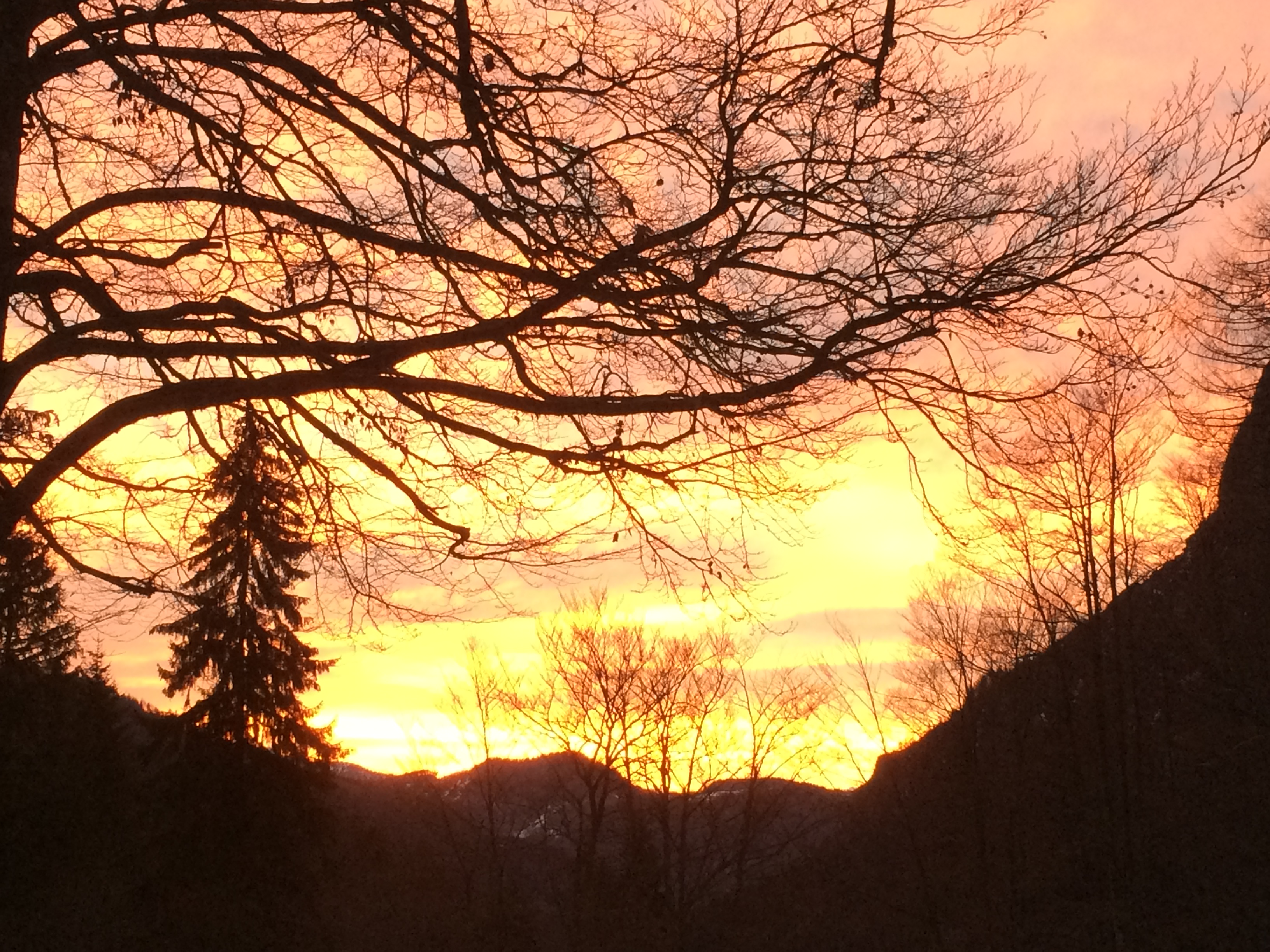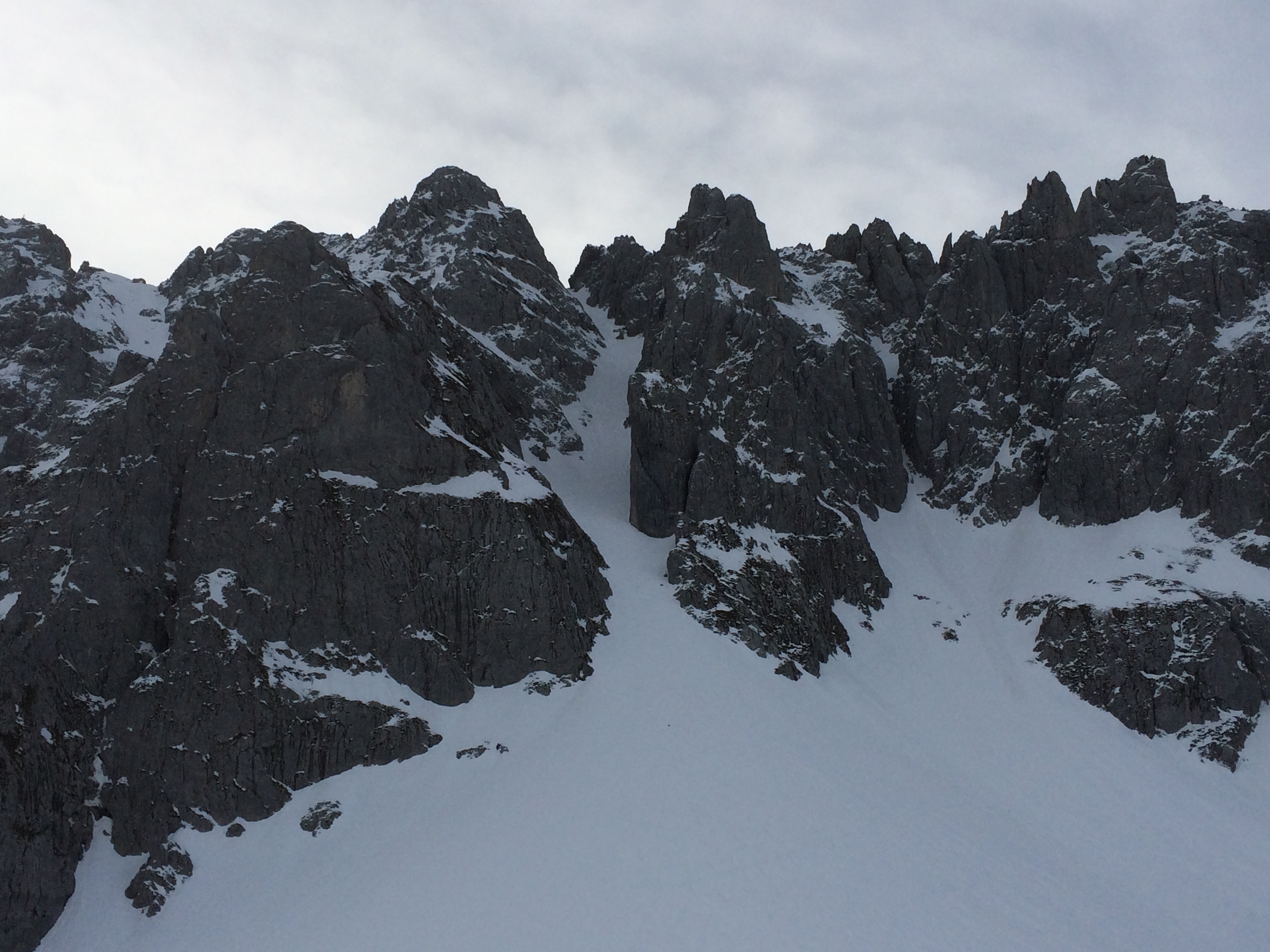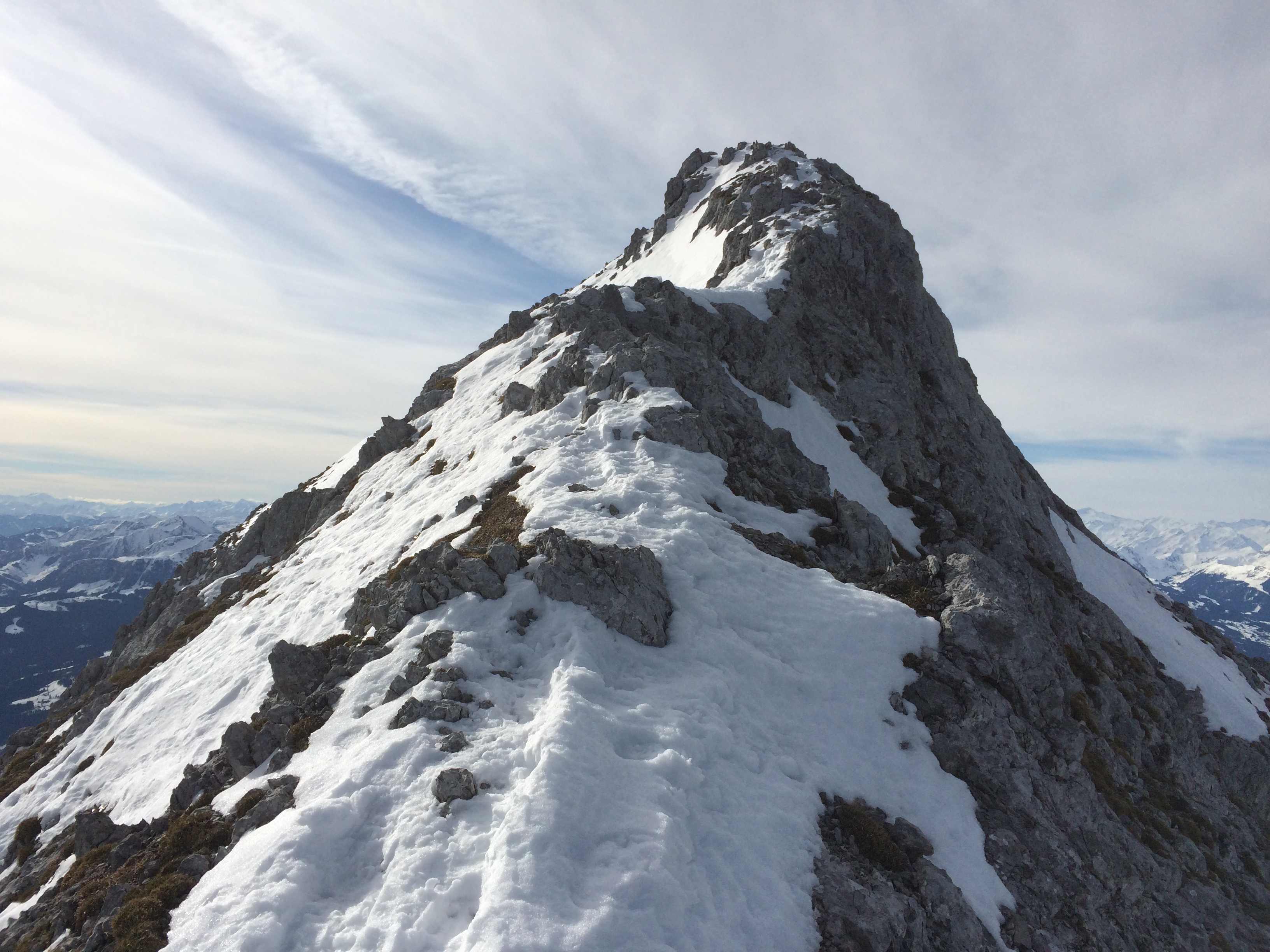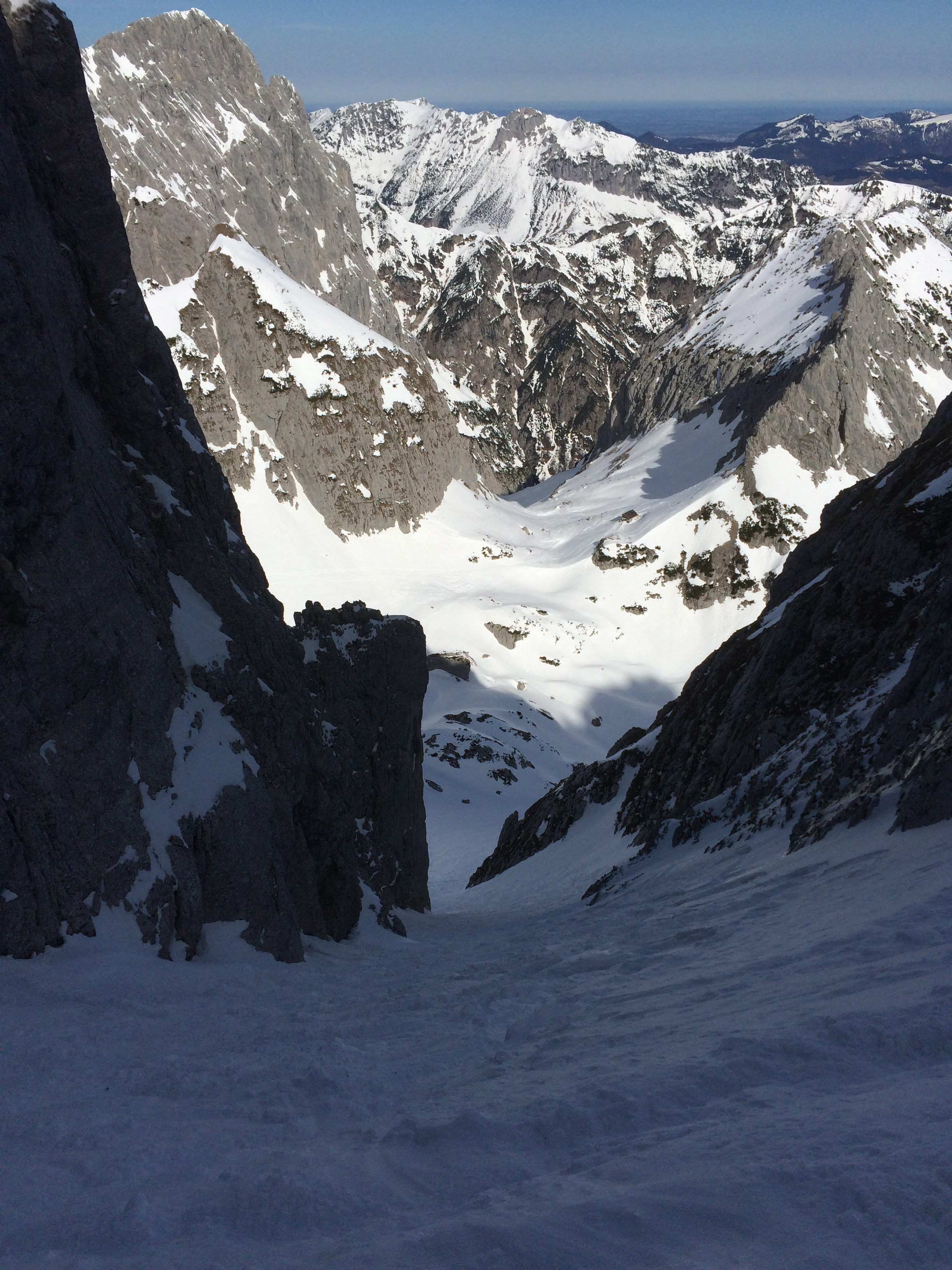 Tourenverhältnisse: Schneequalität war erwartungsgemäß mau: Temp. beim Loslaufen um 6:30 Uhr 3 °C, es hatte Schleierwolken, d.h. eine Abstrahlung war nicht möglich gewesen. Die Schneedecke war gefroren ab ca. 100 Hm unter der Fritz Pflaum-Hütte 1865 m. Ab da und die Rinne hoch ins Schönwetterfensterl dann hart, d.h. Harscheisen waren erforderlich. Aus dem Fensterl konnte man gut bis auf den Gipfel. Steigeisen ggf. hilfreich. Bei der Abfahrt in der Rinne unter dem Fensterl hart und zerfahren. Ab Fritz-Pflaum-Hütte (sehr) weich. Schneemenge: Ab Parkplatz konnten die Ski angelegt werden. In der ersten Waldpassage wird es langsam eng. Wetter, Aussicht und Umgebung waren gigantisch.