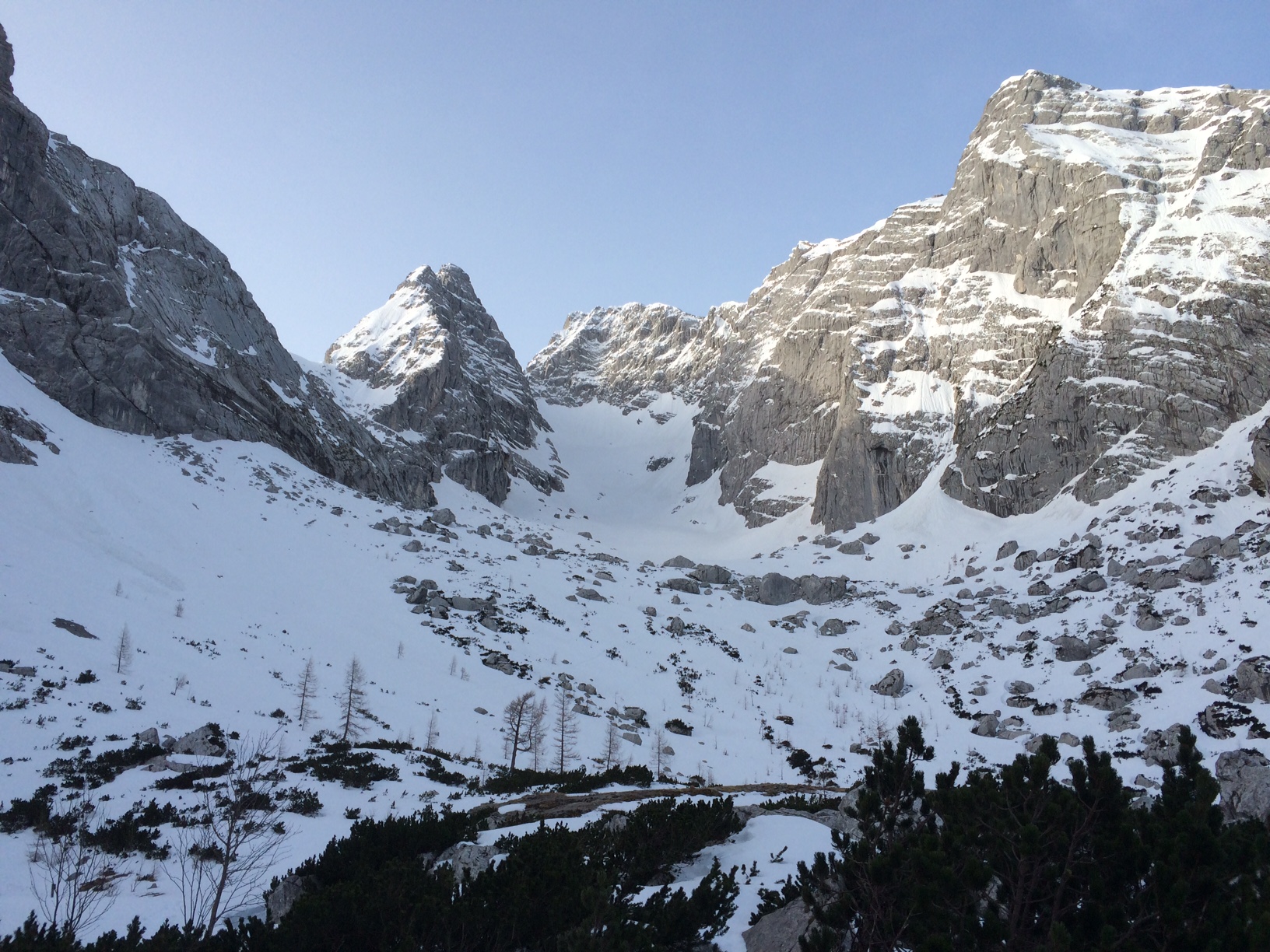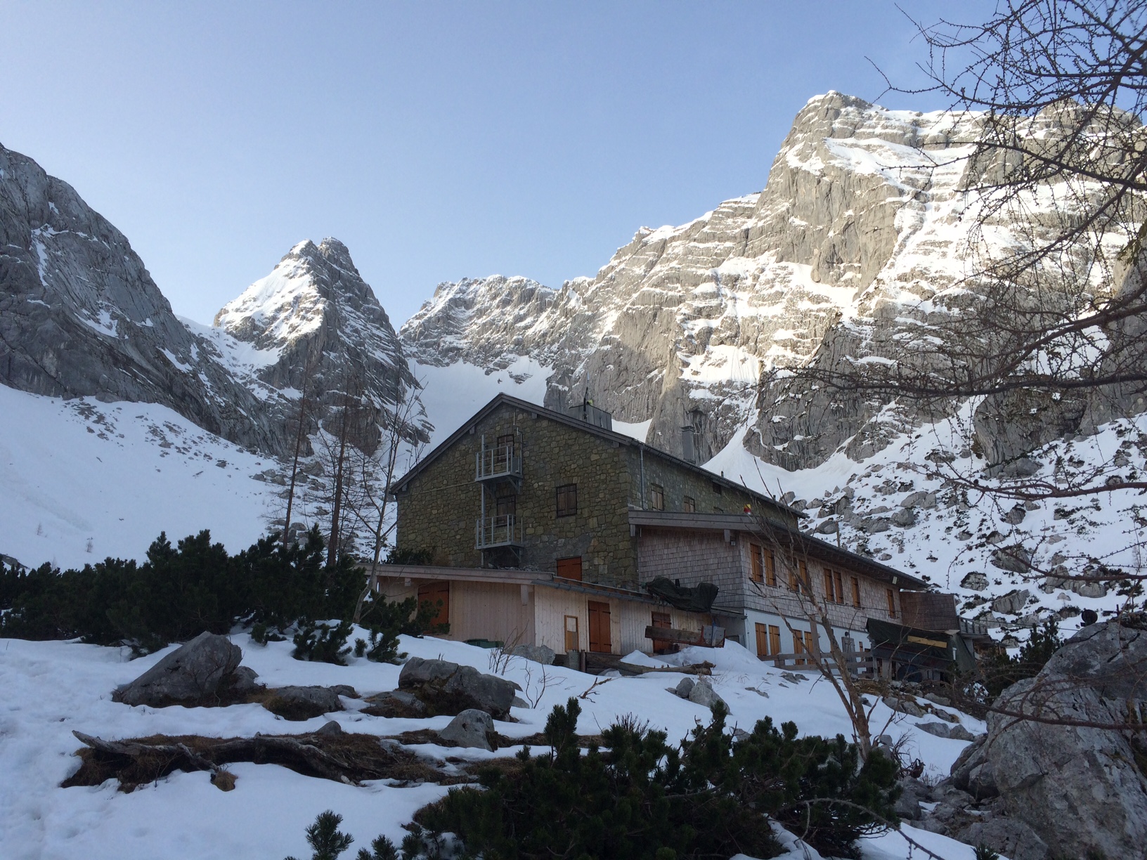 erste Schneeflecken eingangs in das Blaueistal, ca. 1400m; Blaueishütte mit Blaueis und Blaueisspitze;