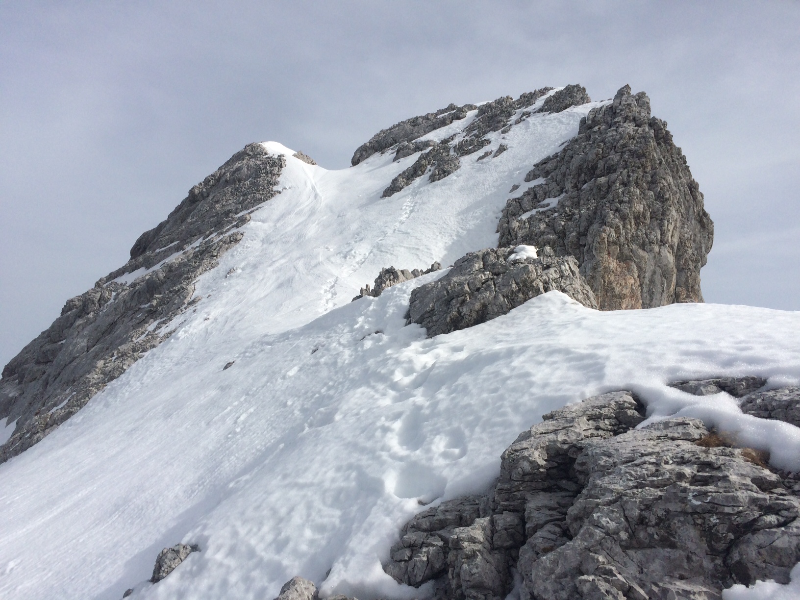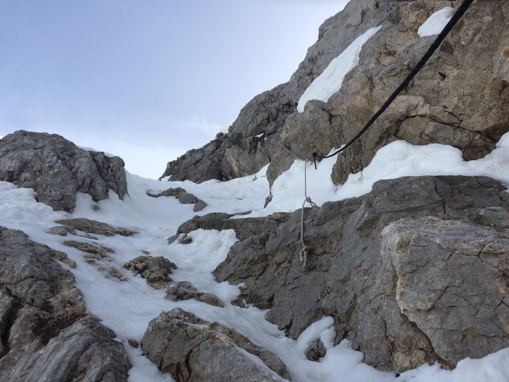 Tourenverhältnisse: Temperatur am P um 6:00 Uhr 5 °C. Zunächst mussten die Ski (für mich) überraschend weit getragen werden: ca. 660 Hm bis zum Materiallift der Blaueishütte (1440 m). Der Schnee dann zunächst weich, ab der Hütte dann meist tragend. Ca. 200 Hm unter der Blaueisscharte wechselten die Verhältnisse: der Schnee hatte nun einen Deckel und einen losen Unterbau. Zum Teil hat der Deckel getragen, zum Teil nicht. Das Gelände steilt sich zur Scharte hin stark auf und es wurde recht mühsam mit Skiern. Zu Fuß starkes Einsinken. Skidepot rund 60 m unter der Scharte. Zunächst 20 m im steilen Firn zu Fuß bis zu einem Seil, dann mit Hilfe des Seils 20 m über vereiste und verschneite Felsen, schließlich wieder zu Fuß im erst steilen dann flacher werdenden Firn in die Blaueisscharte. Hier Pickel erforderlich und Steigeisen hilfreich. Von der Scharte unschwierig über Schnee und Felsen zum Gipfel.