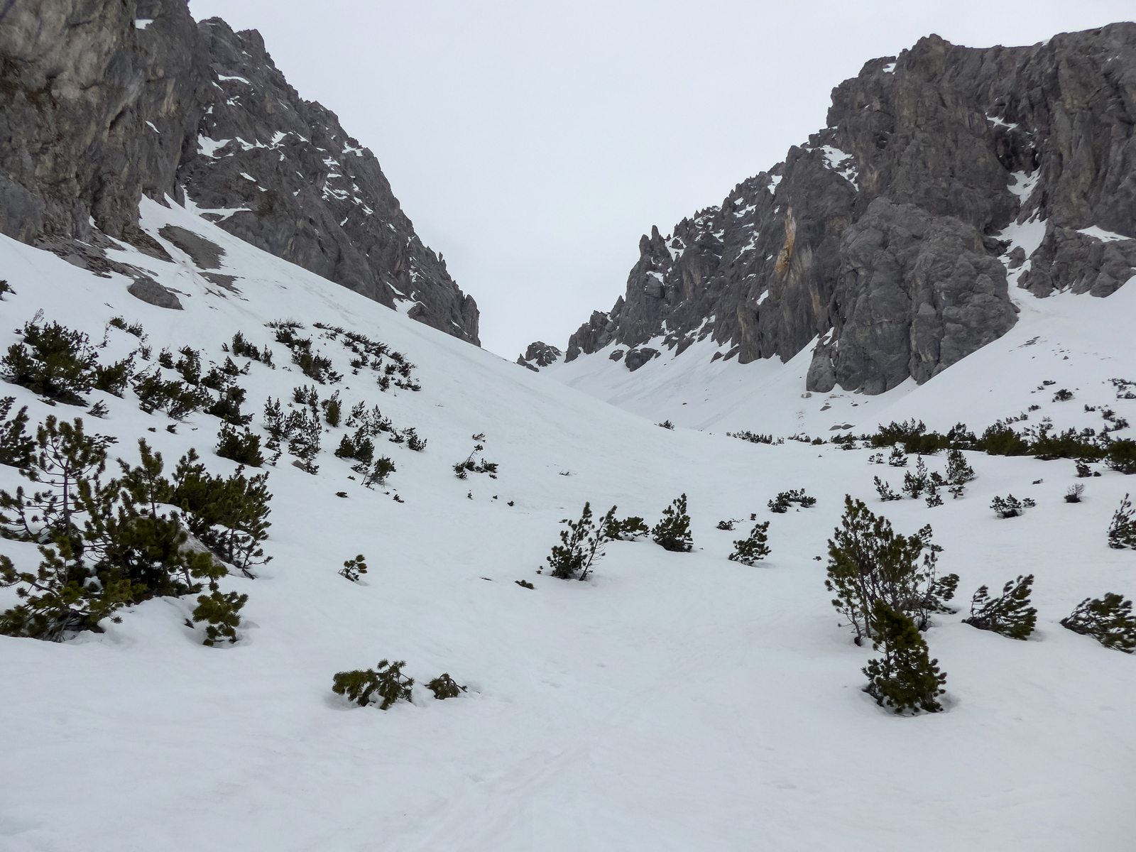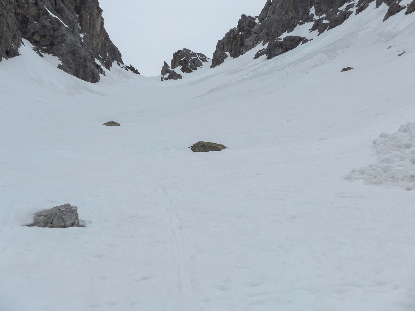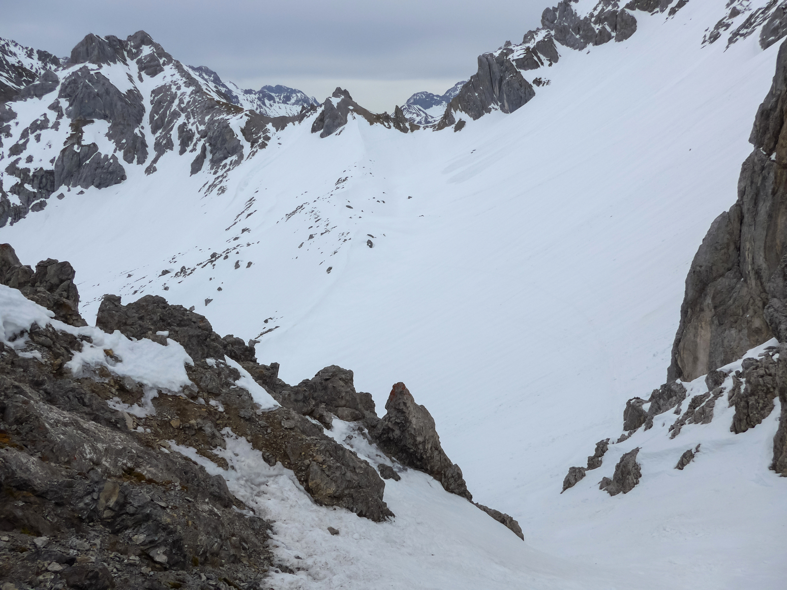 Gefahreneinschätzung: Gering. Entweder hart gefroren, zu wenig Schnee für eine Lawine, oder schon abgegangen.