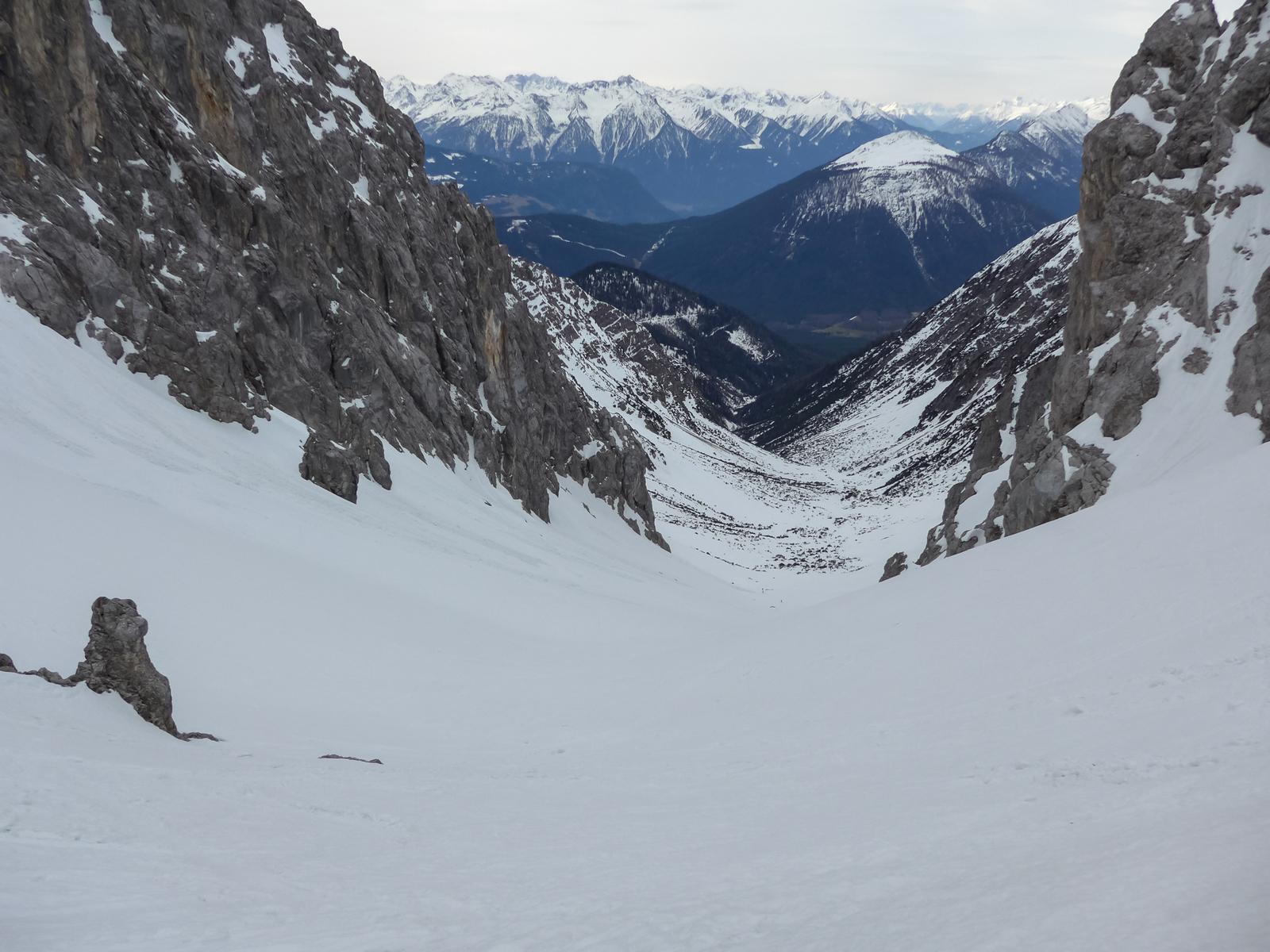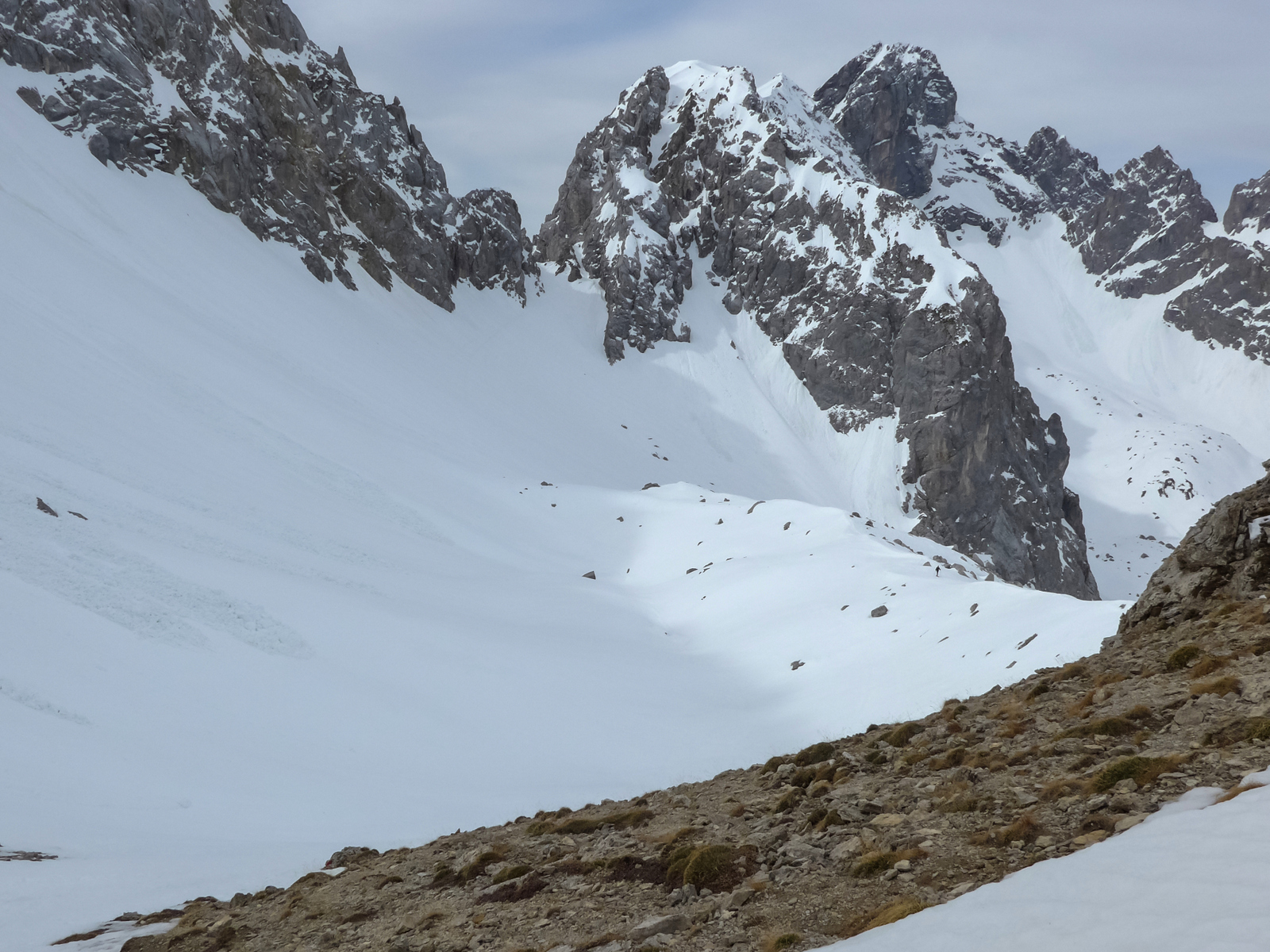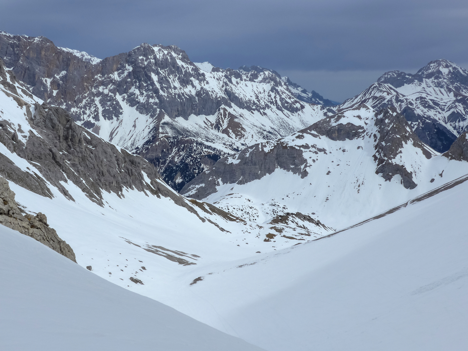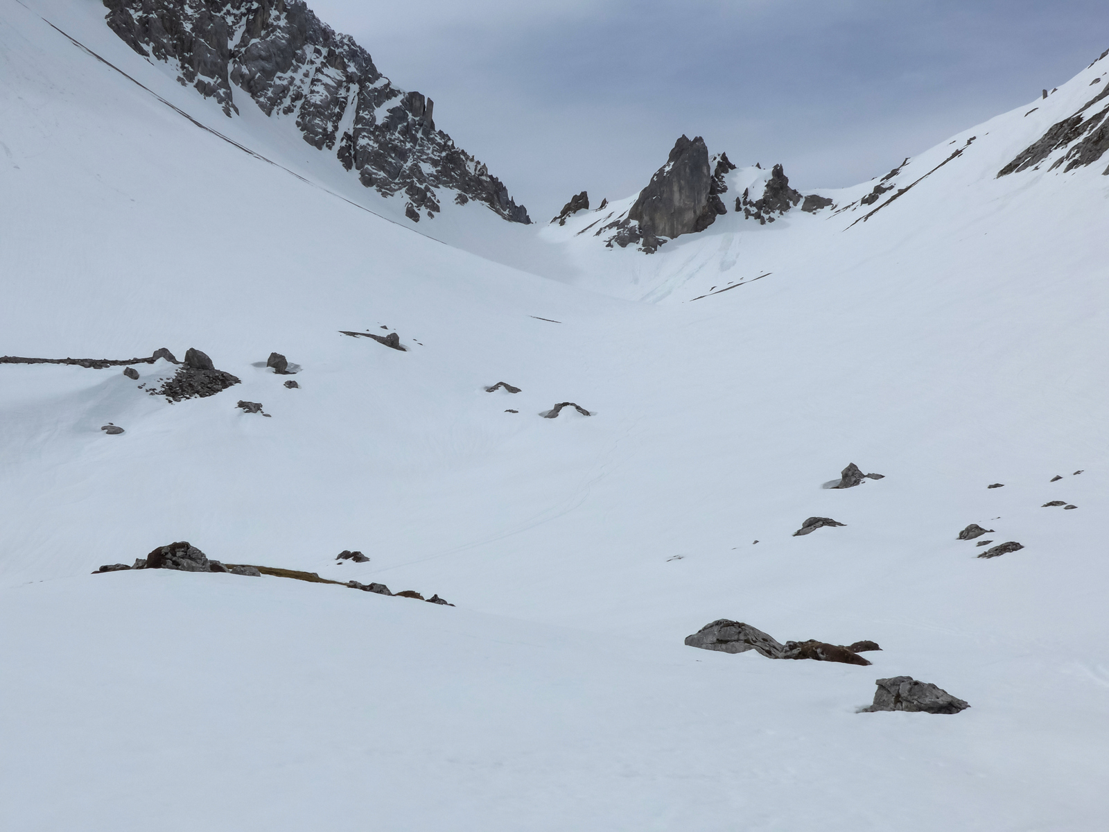 Gefahreneinschätzung: Gering. Entweder hart gefroren, zu wenig Schnee für eine Lawine, oder schon abgegangen.
