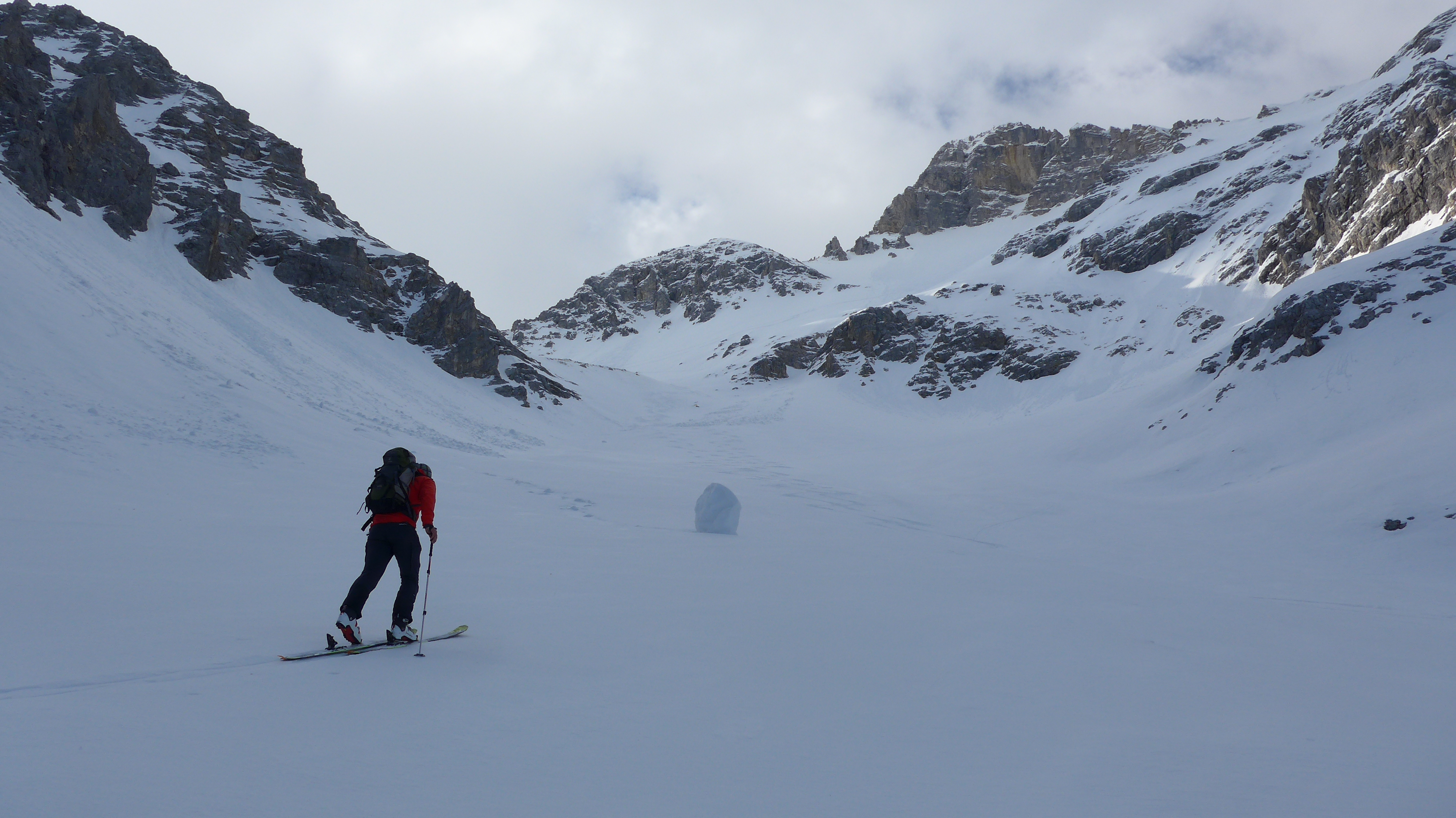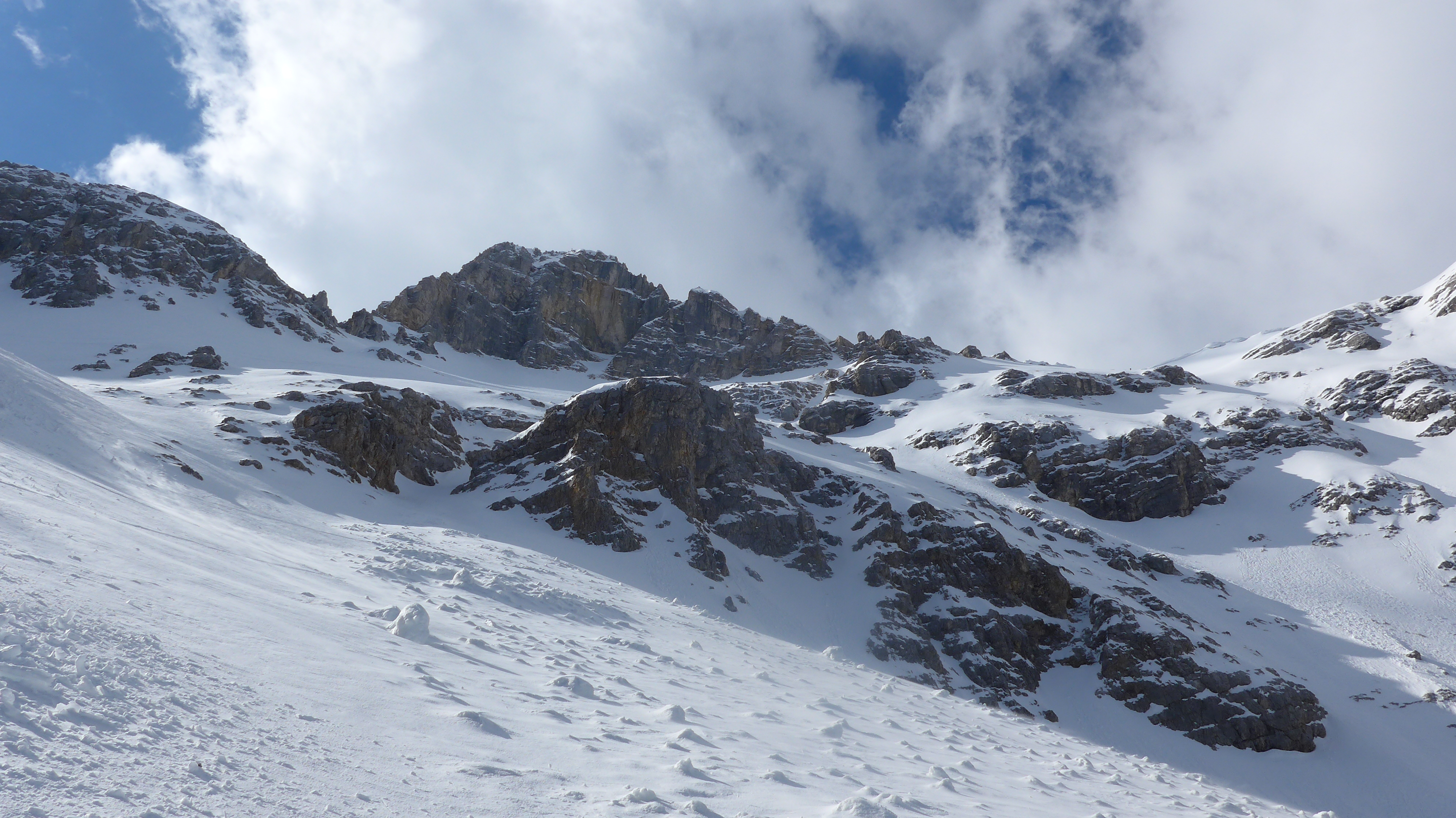 Start 6:50 Uhr. Fast klar. recht windig. Unverspurte Hang zur Lawinenverbauung - unangenehm! Sehr steil - Absturzgelänge. Sehr feuchter Schnee, aber noch kein Faulschnee. Ab der Wegquerung mit Ski gut zu gehen - 2 x kurz abschnallen (aper). Im Kar Schneedecke dann tragend. Tolles Kar!! Kaum Wind.