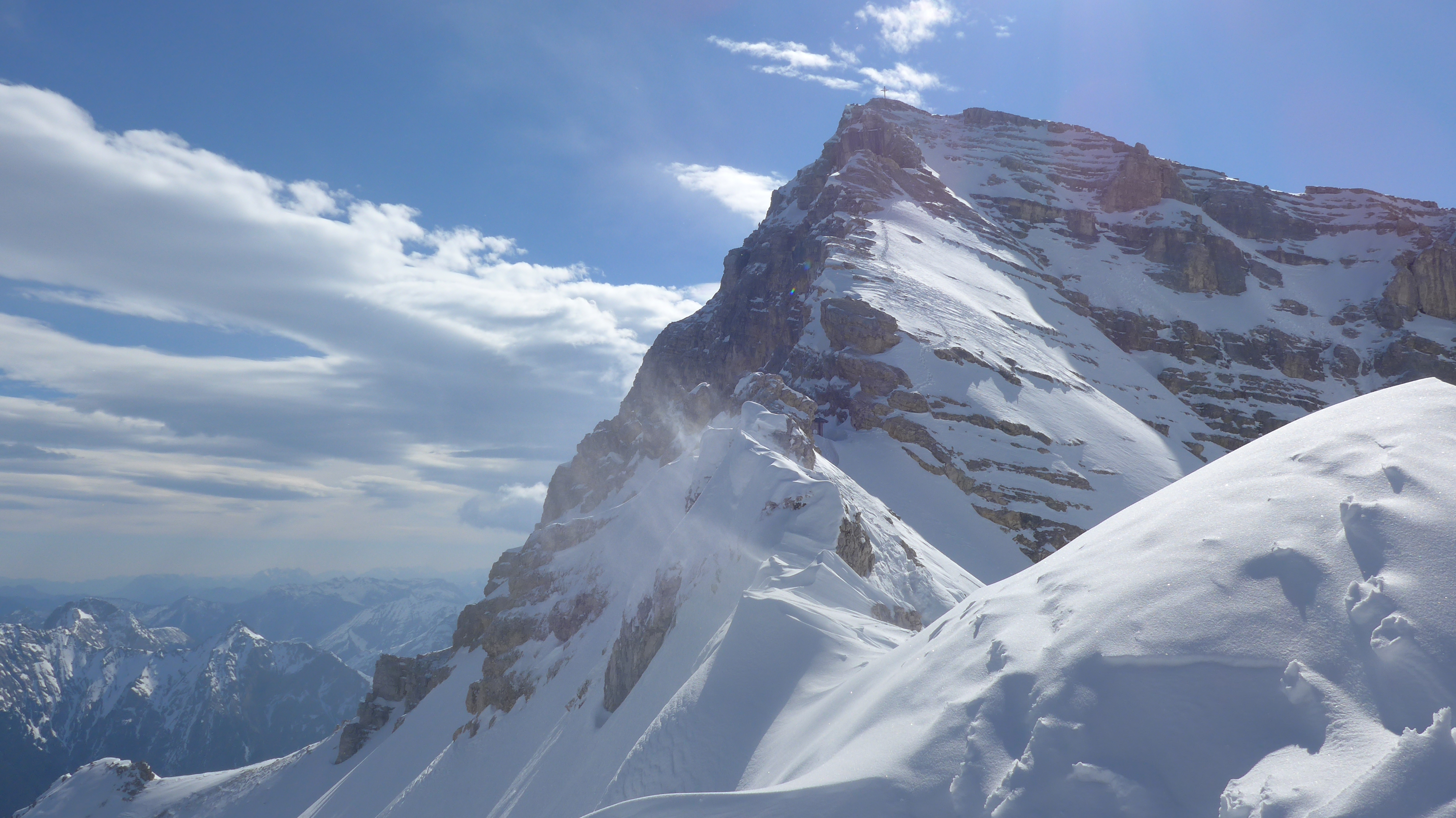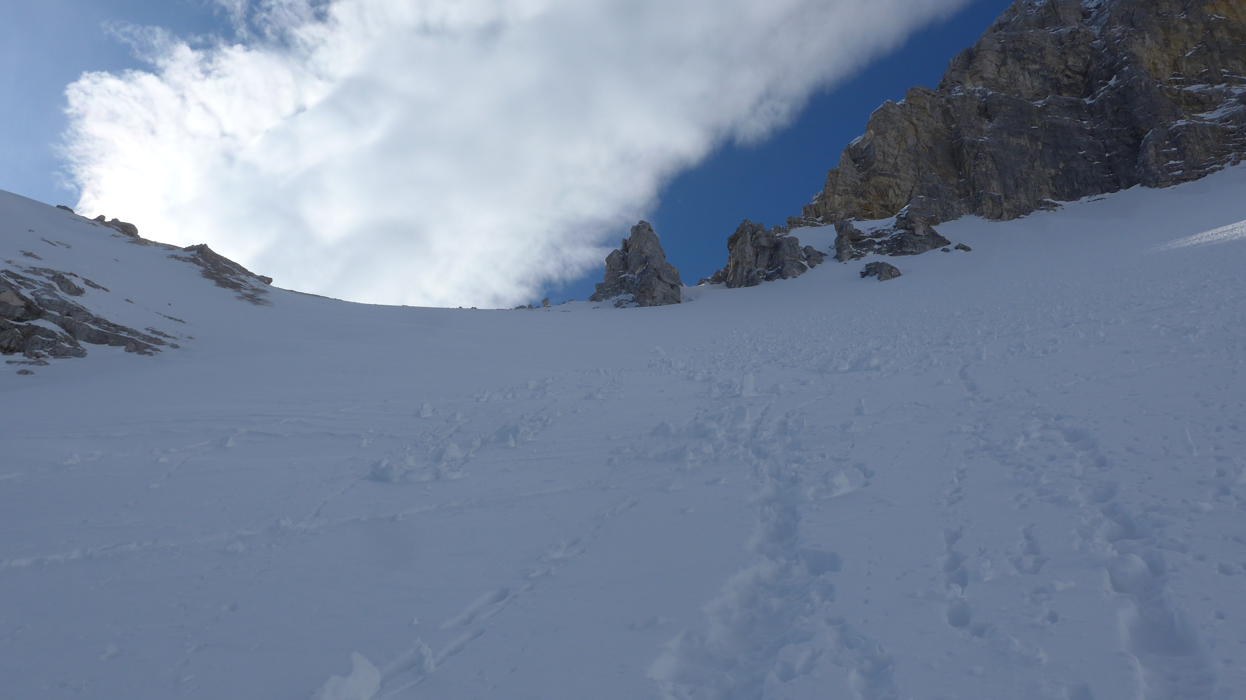Die letzten 2 langen Steilstufen (ca.40 °) mit 15 cm Neuschnee. Spur verweht. Windbeeinflusster Schnee. z.T. schollig. Verbindung zum Altschnee hier mäßig - gut. Wächte ließ sich relativ gut überwinden.