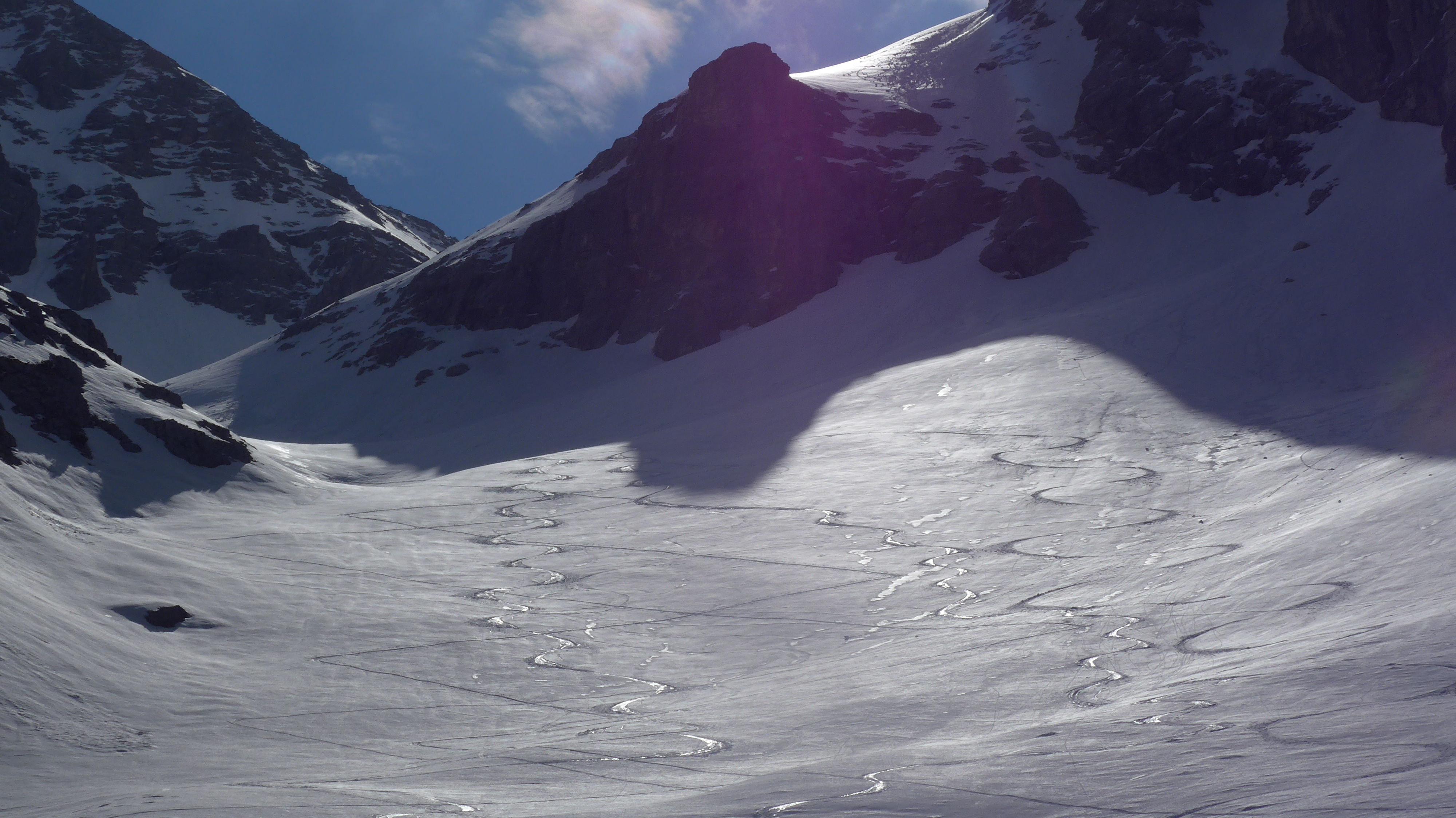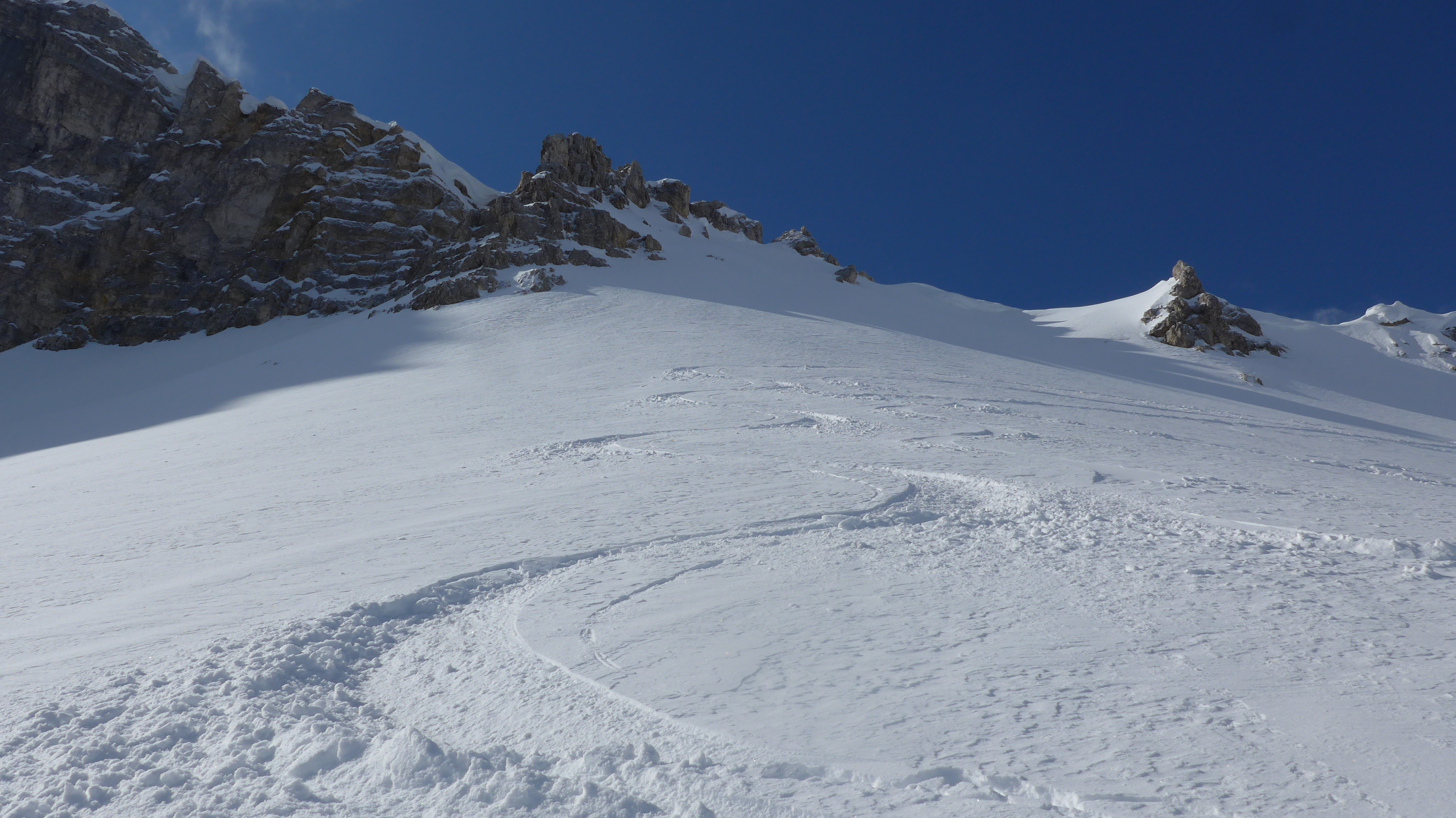 Tolle steile Abfahrt in herrlichem alpinen Ambiente auf tragendem Schnee. 7 weitere Aspiranten getroffen. An der Botanikgrenze wurde der Schnee sehr weich noch halbwegs passabel zu fahren. 2 x Ski abschnallen. Gehaxel mit Latschen. Noch ok. Schneehasen gesehen! ![]()