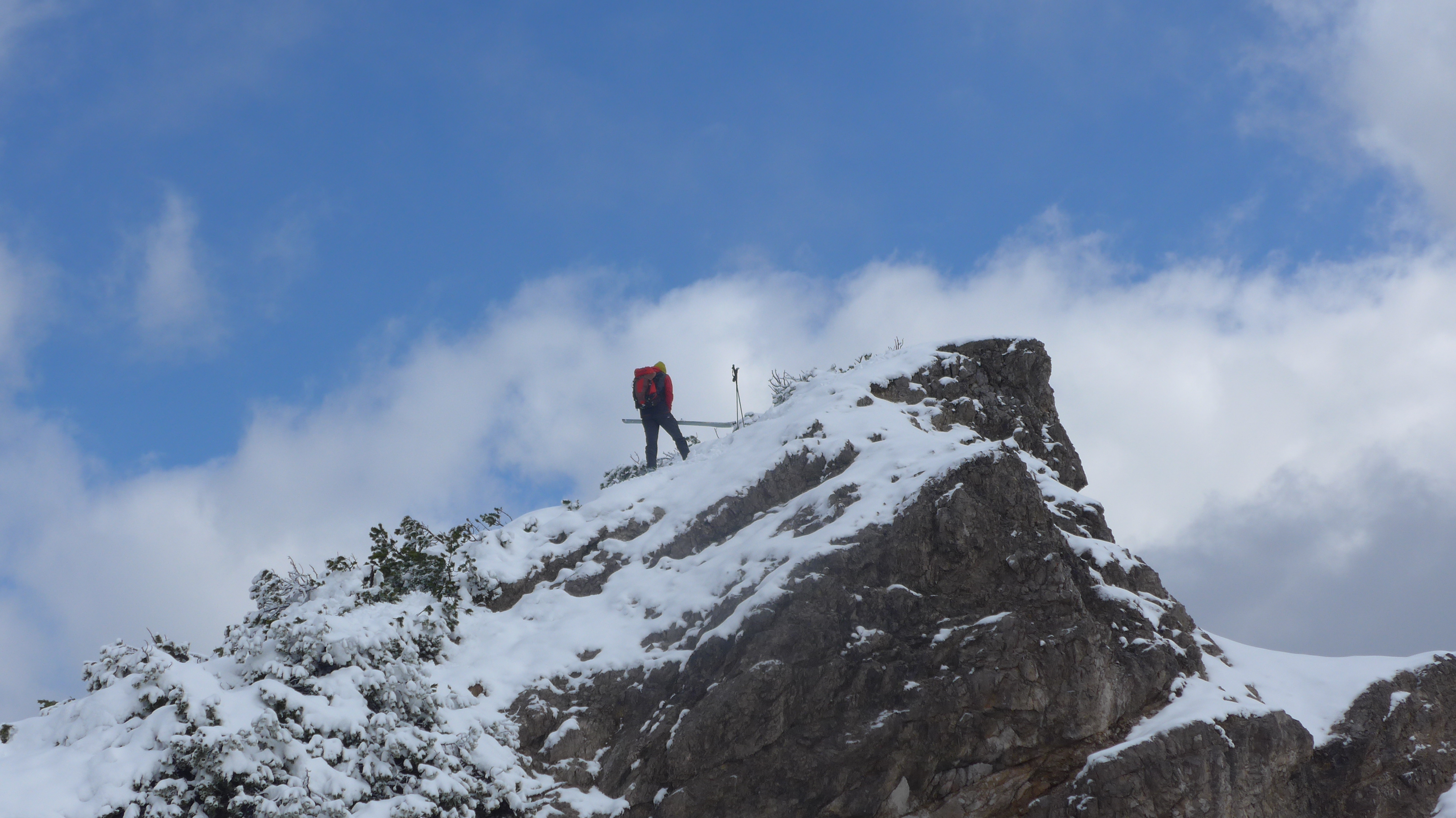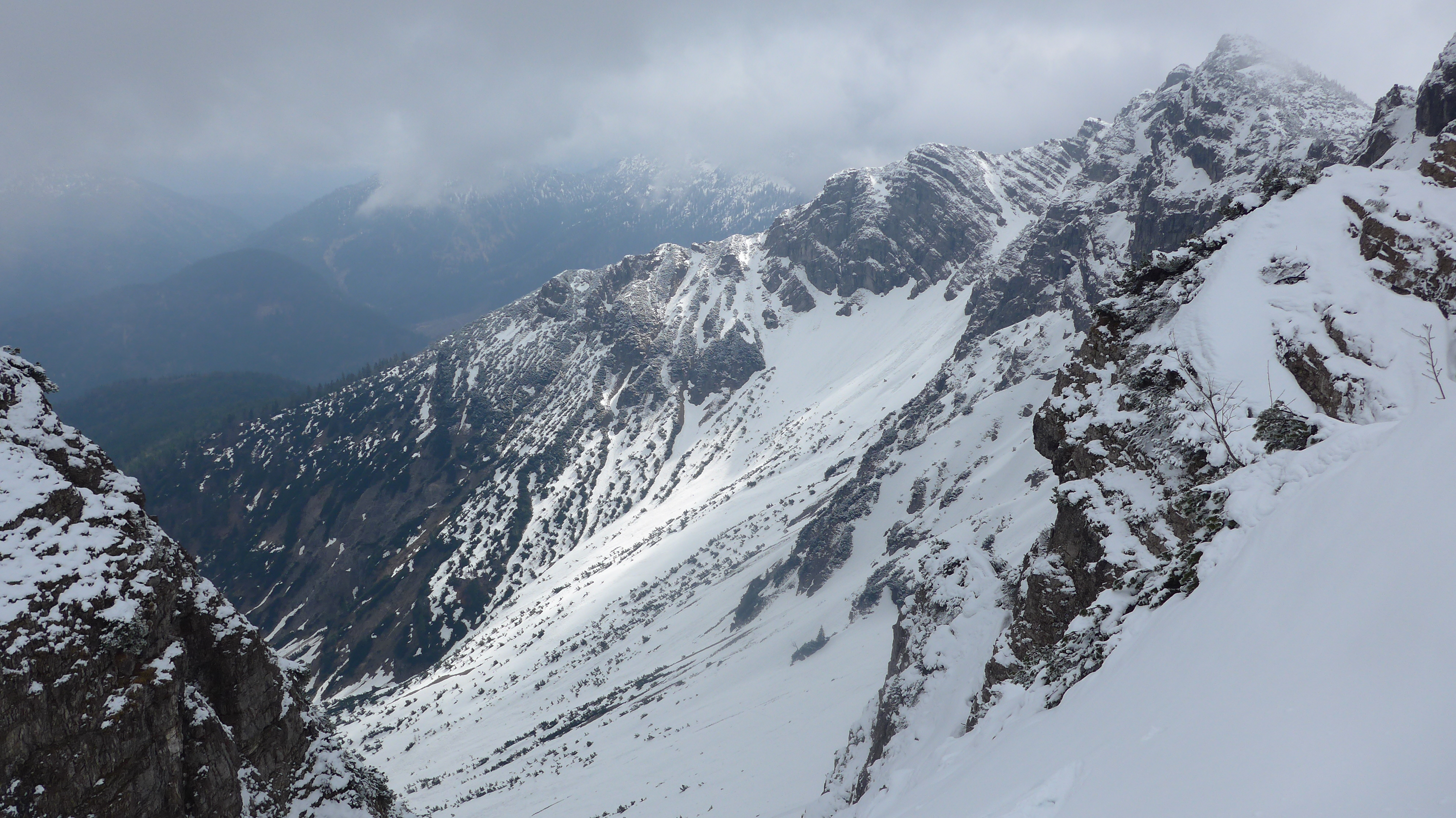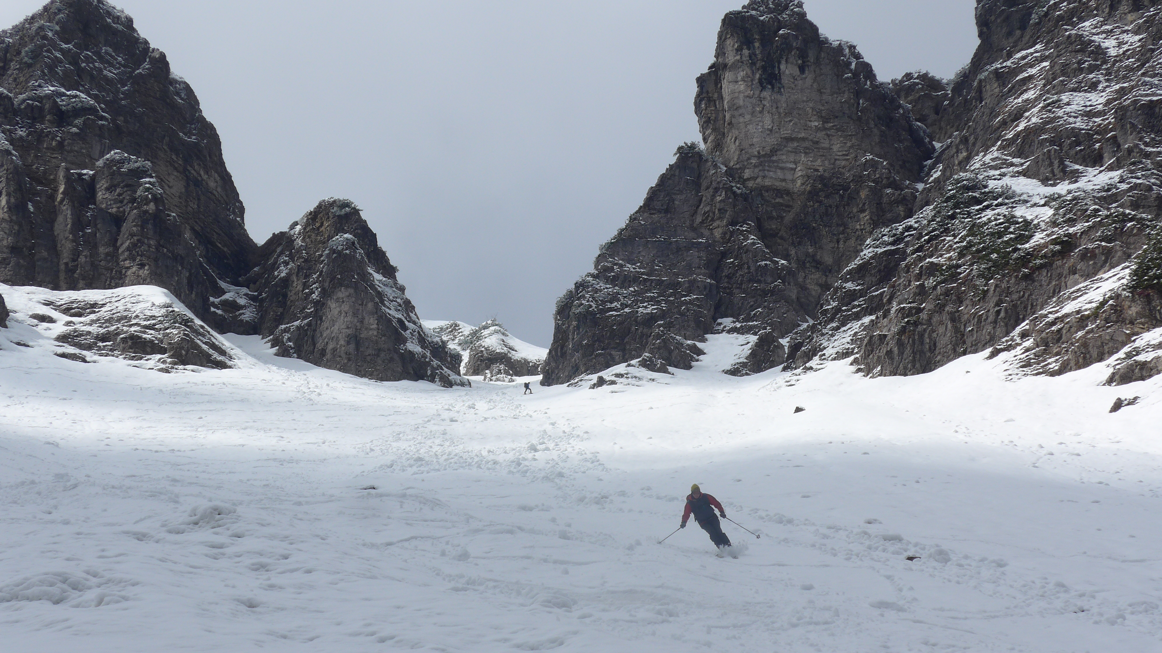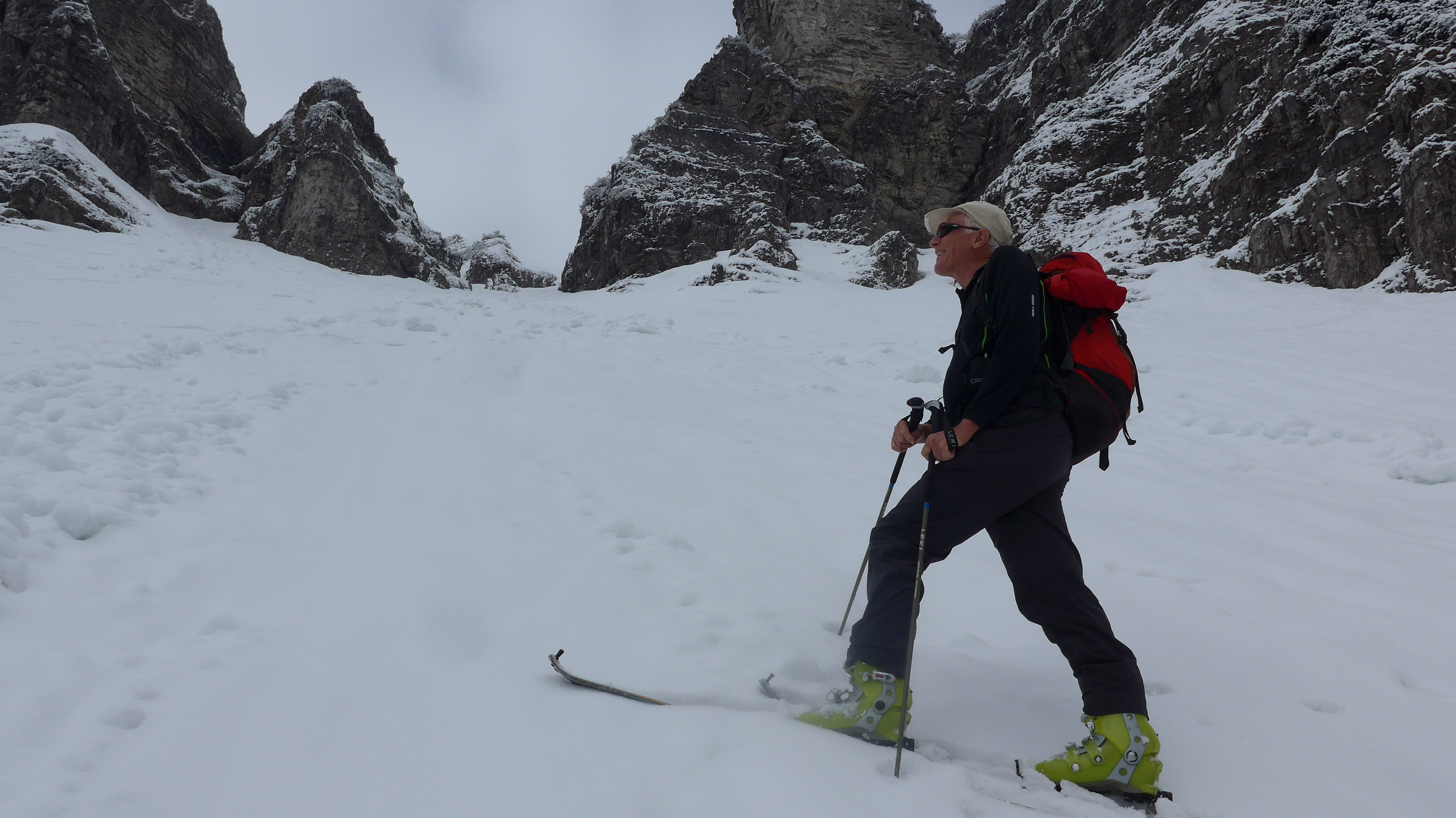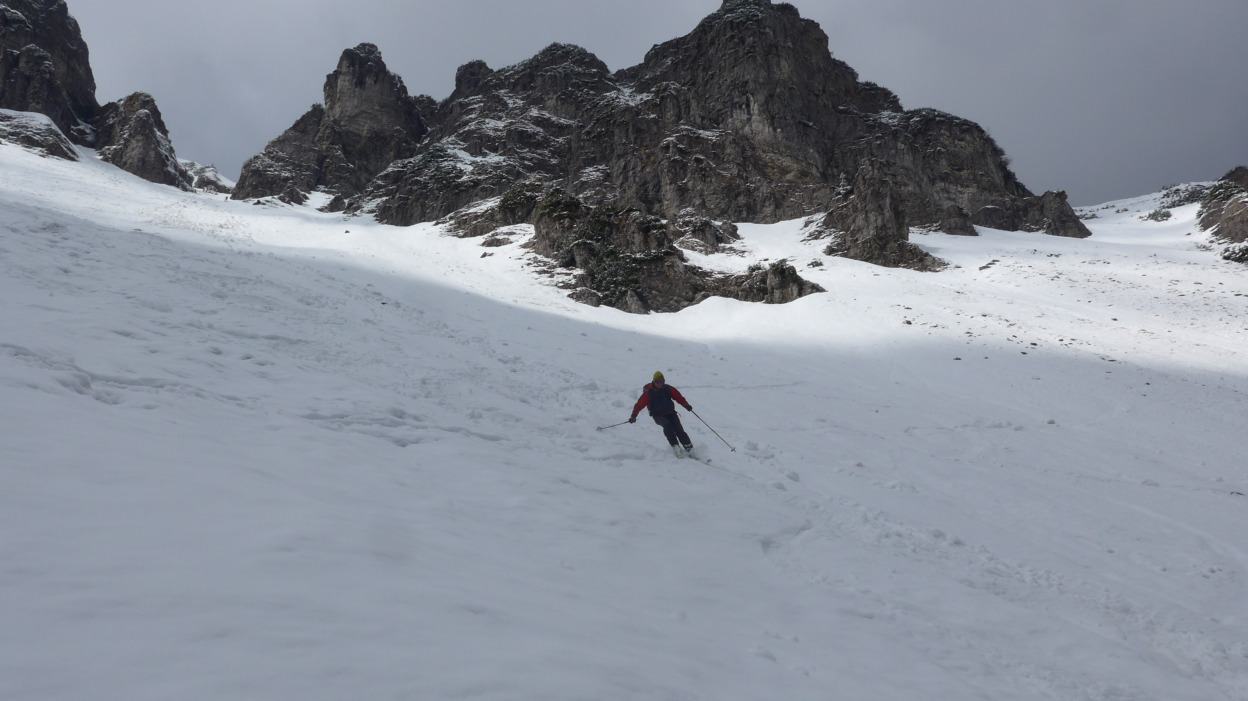 Westl. Variante, wie in der AV-Karte eingezeichnet gegangen (2 x Ski kurz abschnallen). Im Schartenbereich nur 10 cm Schnee - Steinkontakt. Hier nach 4 "Abfahrten" ziemlich abgeschrubbt.