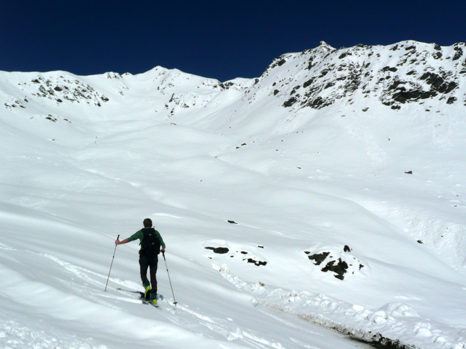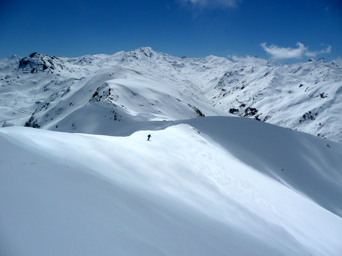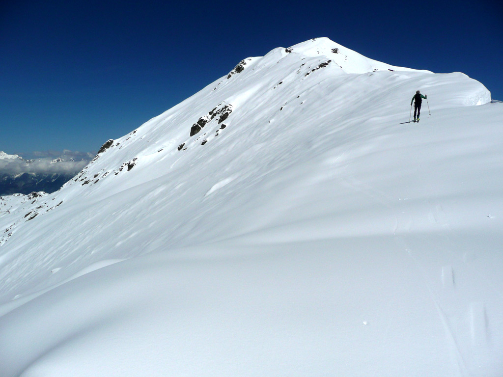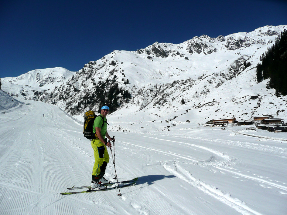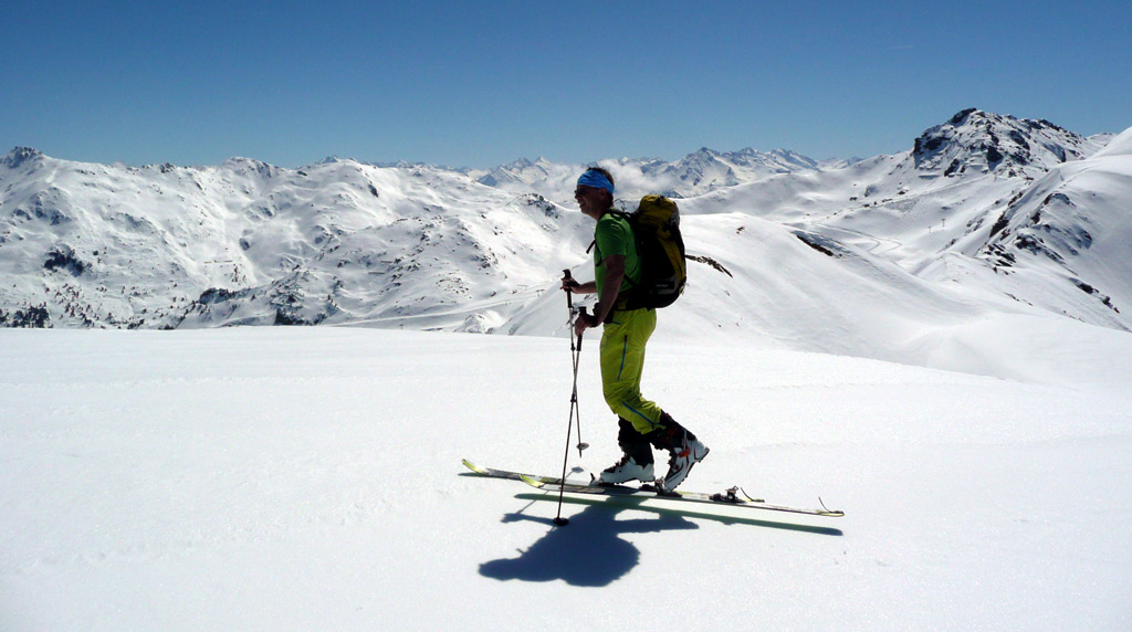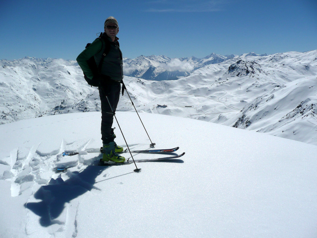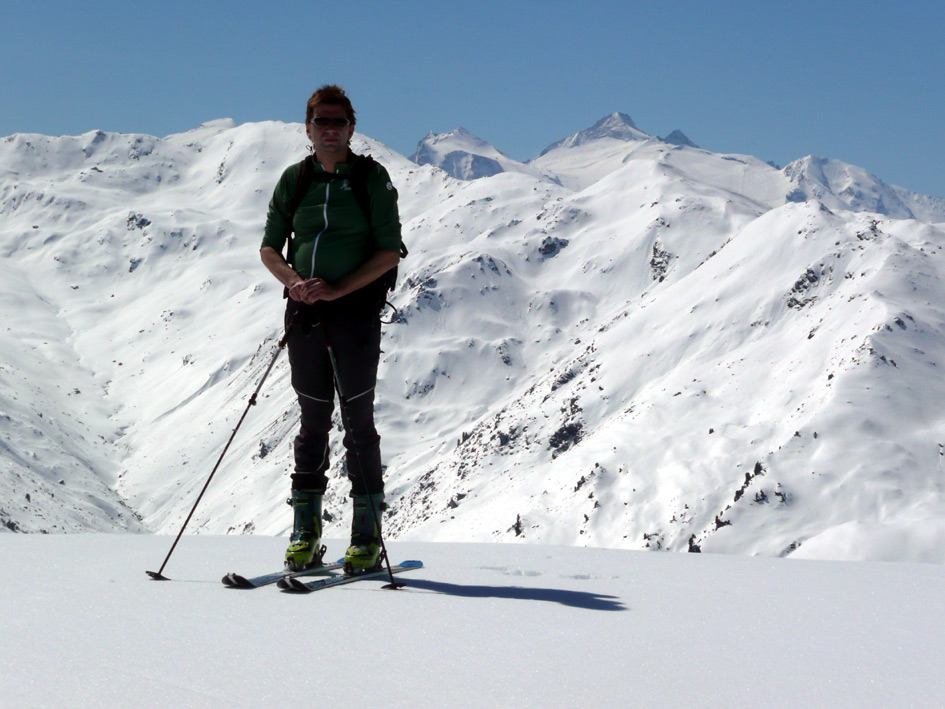 Tourenverhältnisse: Mit Sommerreifen problemlos nach Hochfügen und dort einen Meter neben dem Schnee parken. Piste zur Lamarkal unten bestens (wurde sogar nochmal präpariert). Weiter oben ca. 40 cm Neuschnee, Verhältnisse teils auf wenigen Metern variierend zwischen Schon-Firn oder Noch-Sumpf. Ab Nonsjöchl den Grat entlang, die Seite zum Inntal hin recht hart.
