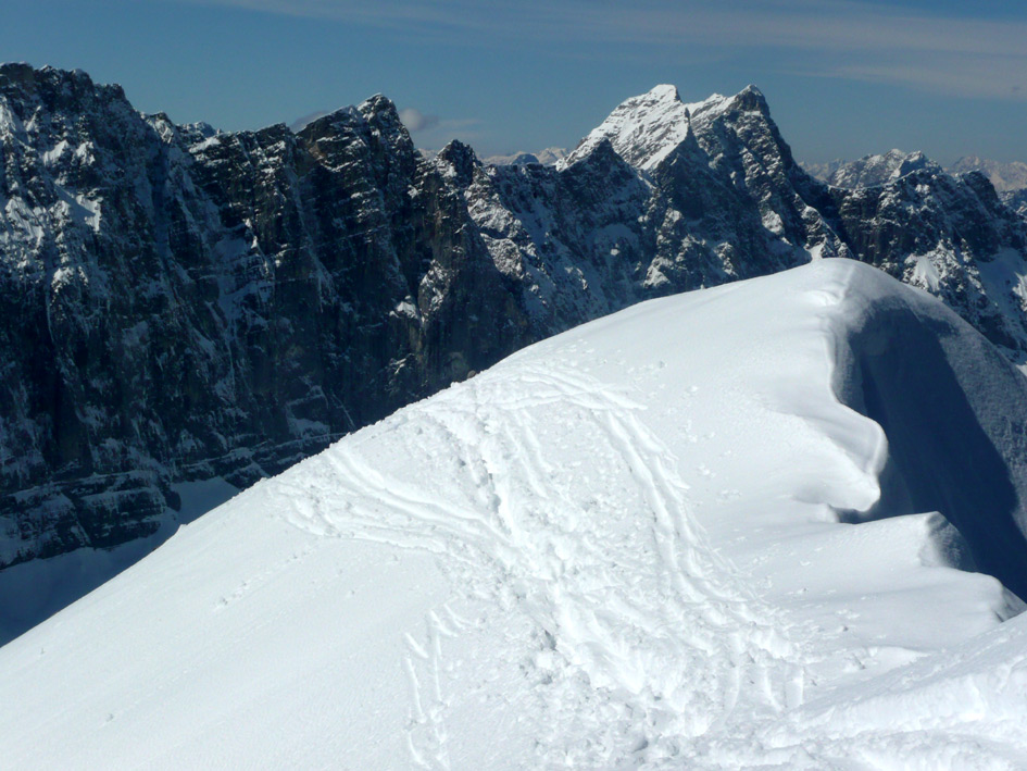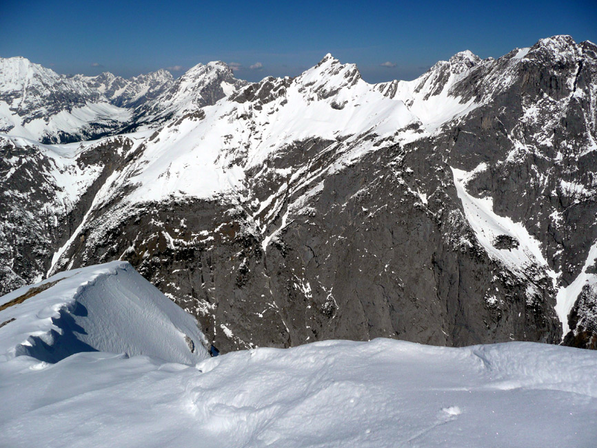 Gefahreneinschätzung: LWS 1-2, Lawinengefahr heute gering; eher das Problem, im Latschenverhau bei der Abfahrt ins Laliderer Tal einzufädeln.