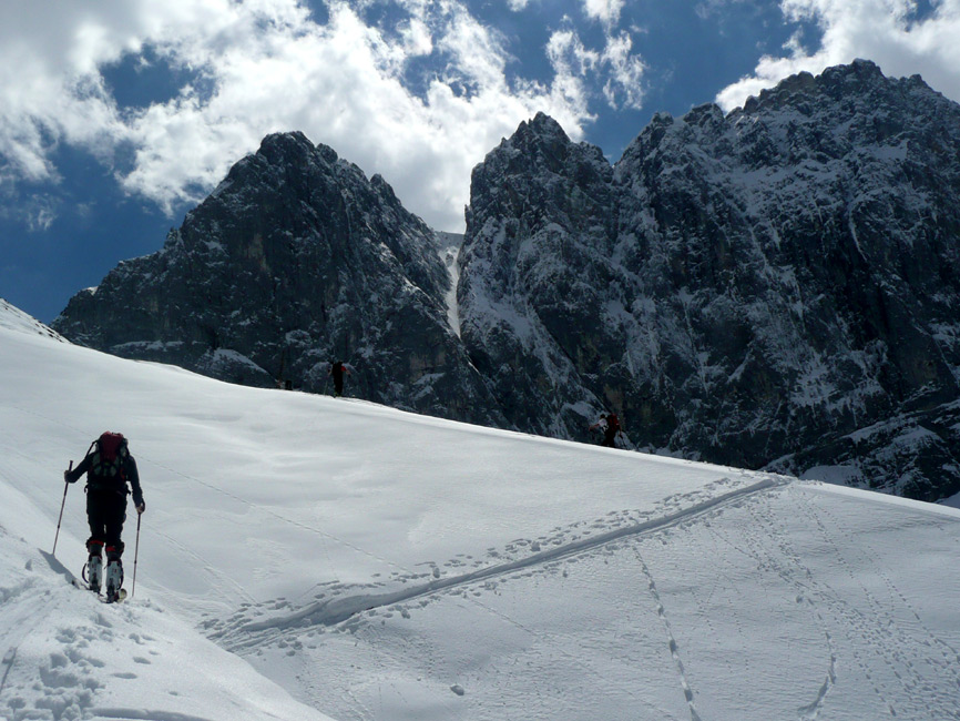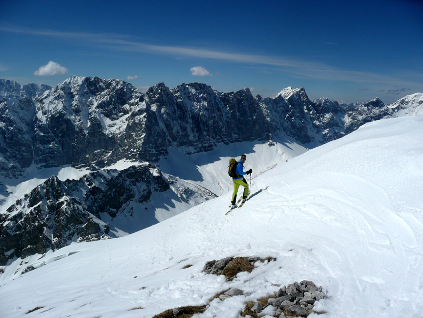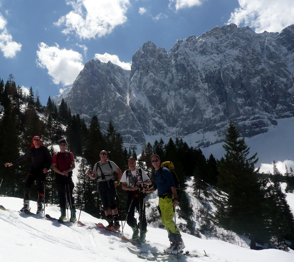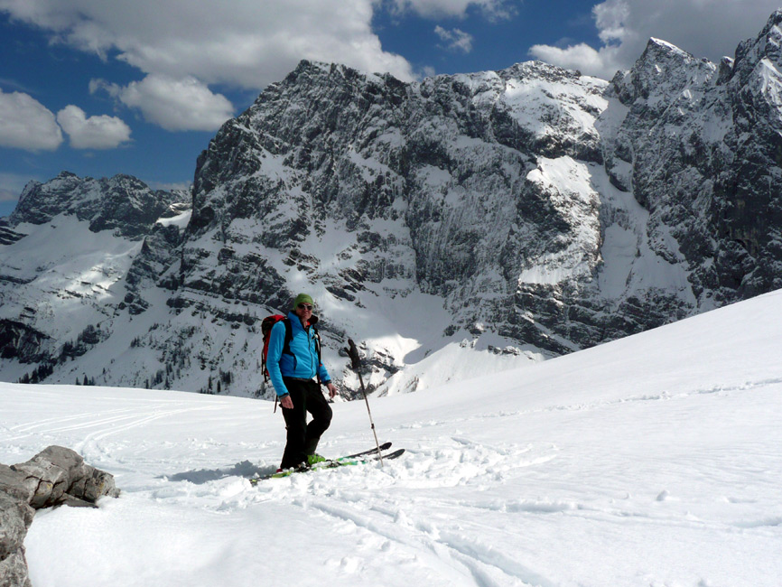 Tourenverhältnisse: Ca. 40 MInuten Ski tragen bis zum Anfellen (beim Gamsjoch ist das zu dieser Jahreszeit eher wenig). Danach durchgehende Schneedecke bis zum Gipfel. Wechte am Joch kein Problem, Harscheisen im Gipfelhang angenehm. Oberster Gipfelhang bei Abfahrt gegen 11.15 Uhr super, weiter unten muss man etwas weicher fahren. Abfahrt ins Laliderer Tal zunächst gut, auf den untersten 250 Hm mühsamer Latschenkampf (teils grundloser Schnee, viele Steine, geht aber mit Umsicht). Aufstieg zum Hohljoch, Abfahrt Richtung Enger Grund (etwas tiefer Neuschnee, Steine meist gut erkennbar), rechts des Bachs kann man relativ weit rausrutschen. 15 Minuten finaler Fußmarsch zu den Eng-Almen.