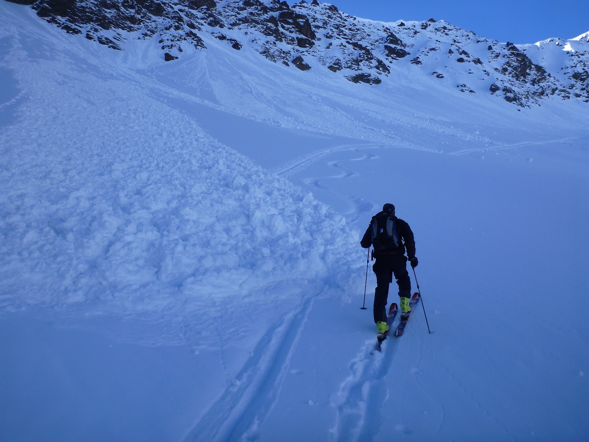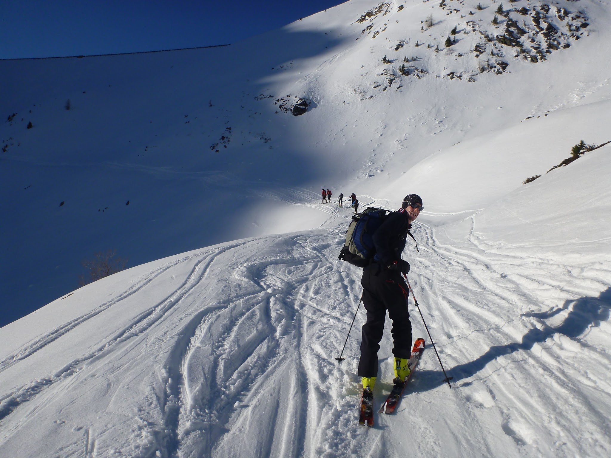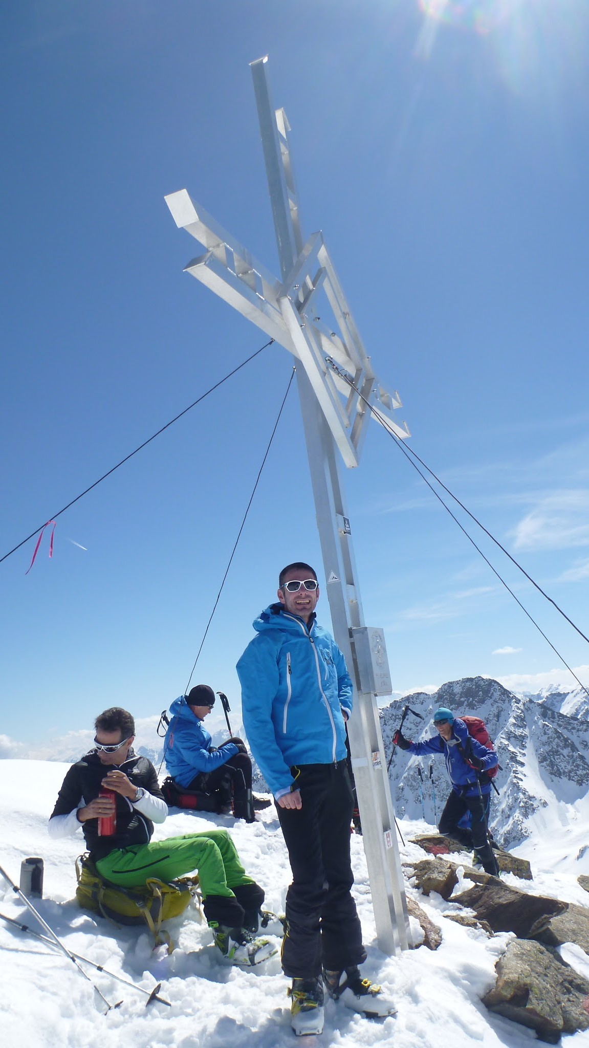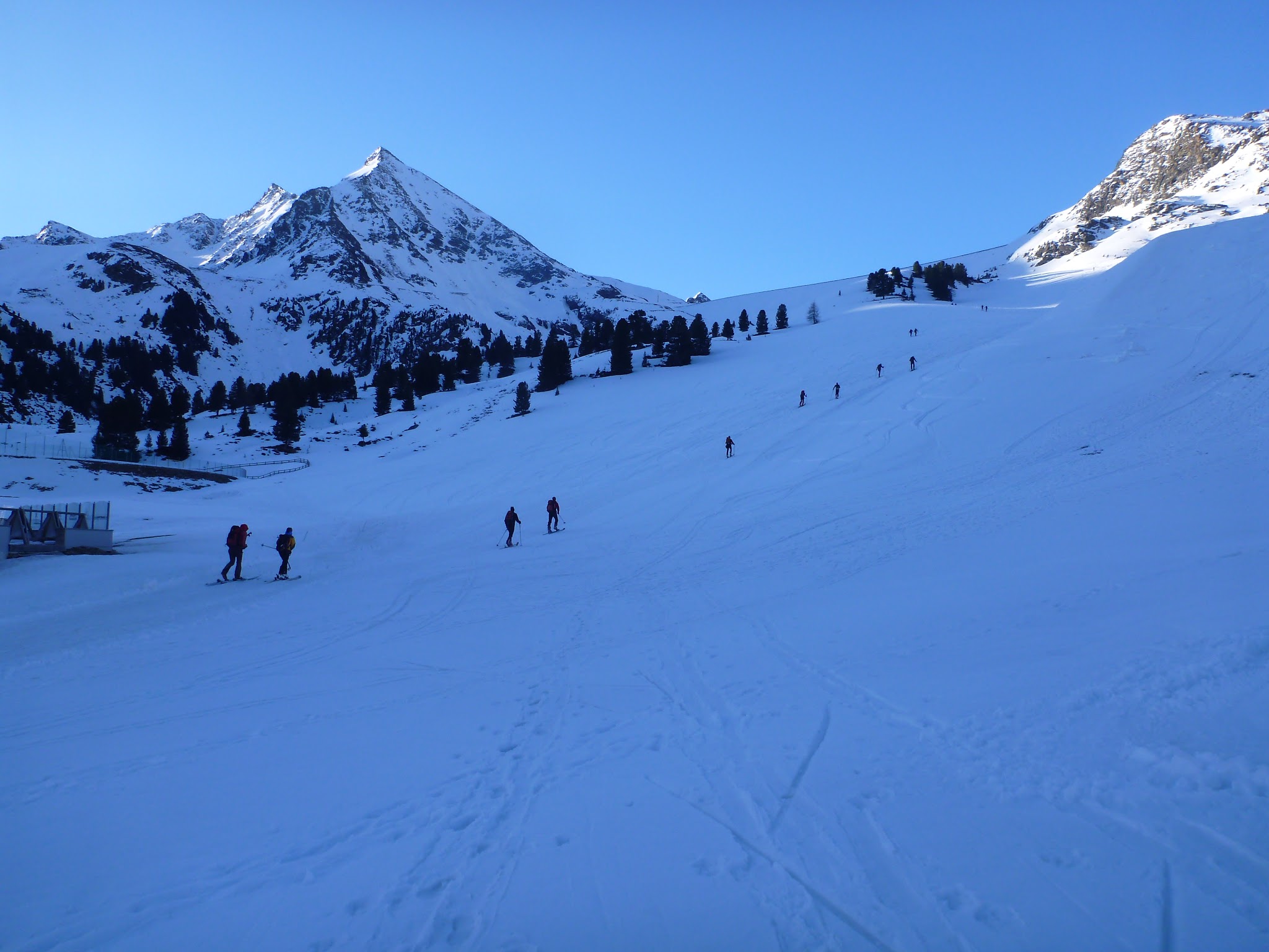 Sonstiges: Aufstieg vom Parkplatz über die Piste zur Versorgungsstraße und weiter über die Staumauer zur Dammkrone. Entlang des Sees über die obere Spur zum Südende, dort ziehen die Massen weiter zum Sulzkogel. Weiter über den Schafleger nach Südosten, einige Lawinenkegel vom Vortag passierend über die steile Querung zur Finstertaler Scharte. Schöne südseitige Abfahrt bis zur Spur, die von der Schweinfurter Hütte hoch kommt. Von dort Aufstieg über den Südhang zum Gipfel der Kraspesspitze.