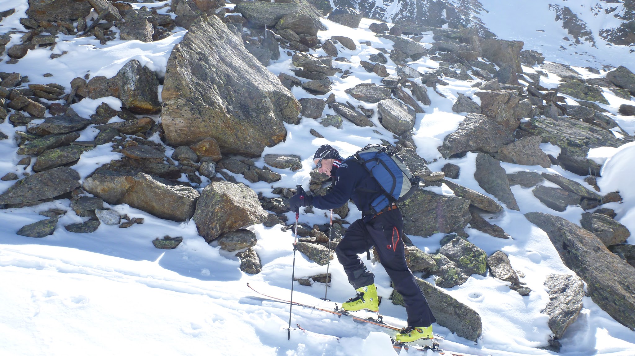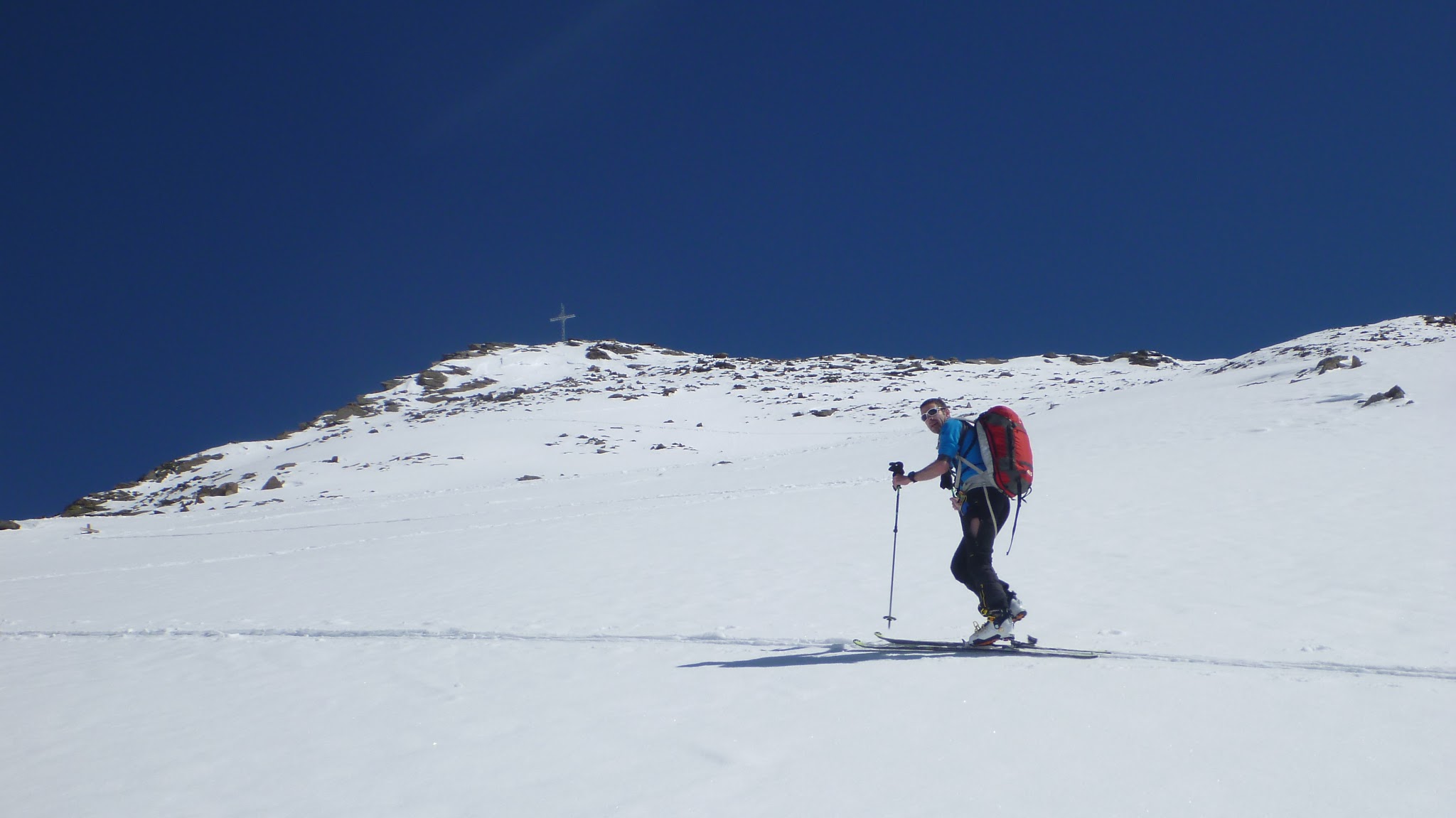 Tourenverhältnisse: Sehr gute Verhältnisse, Nordseitig im Aufstieg Pulver mit Deckel, war aber in der Abfahrt aufgeweicht, Südseitig sowohl im Aufstieg als auch in der Abfahrt tragender Deckel