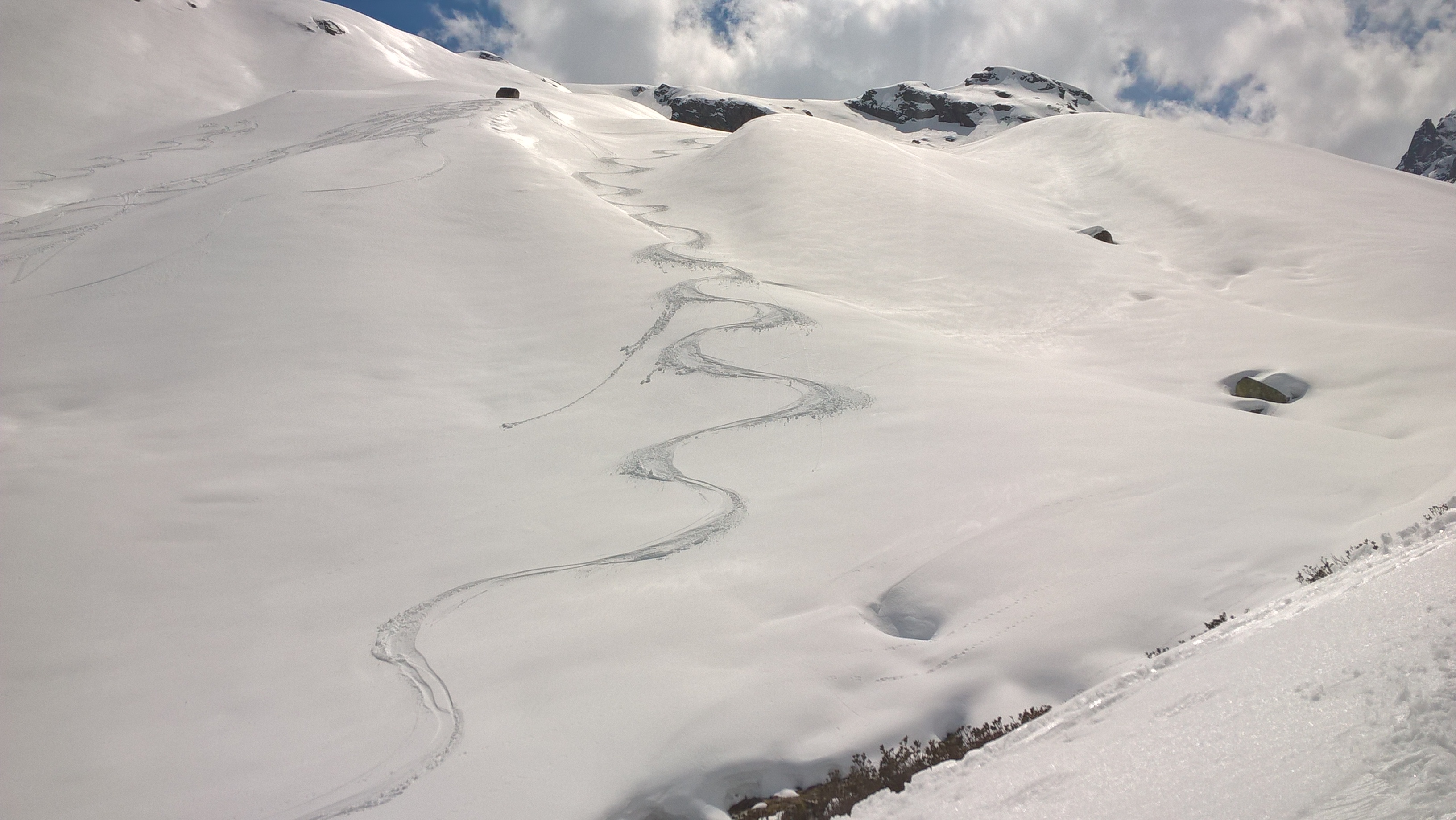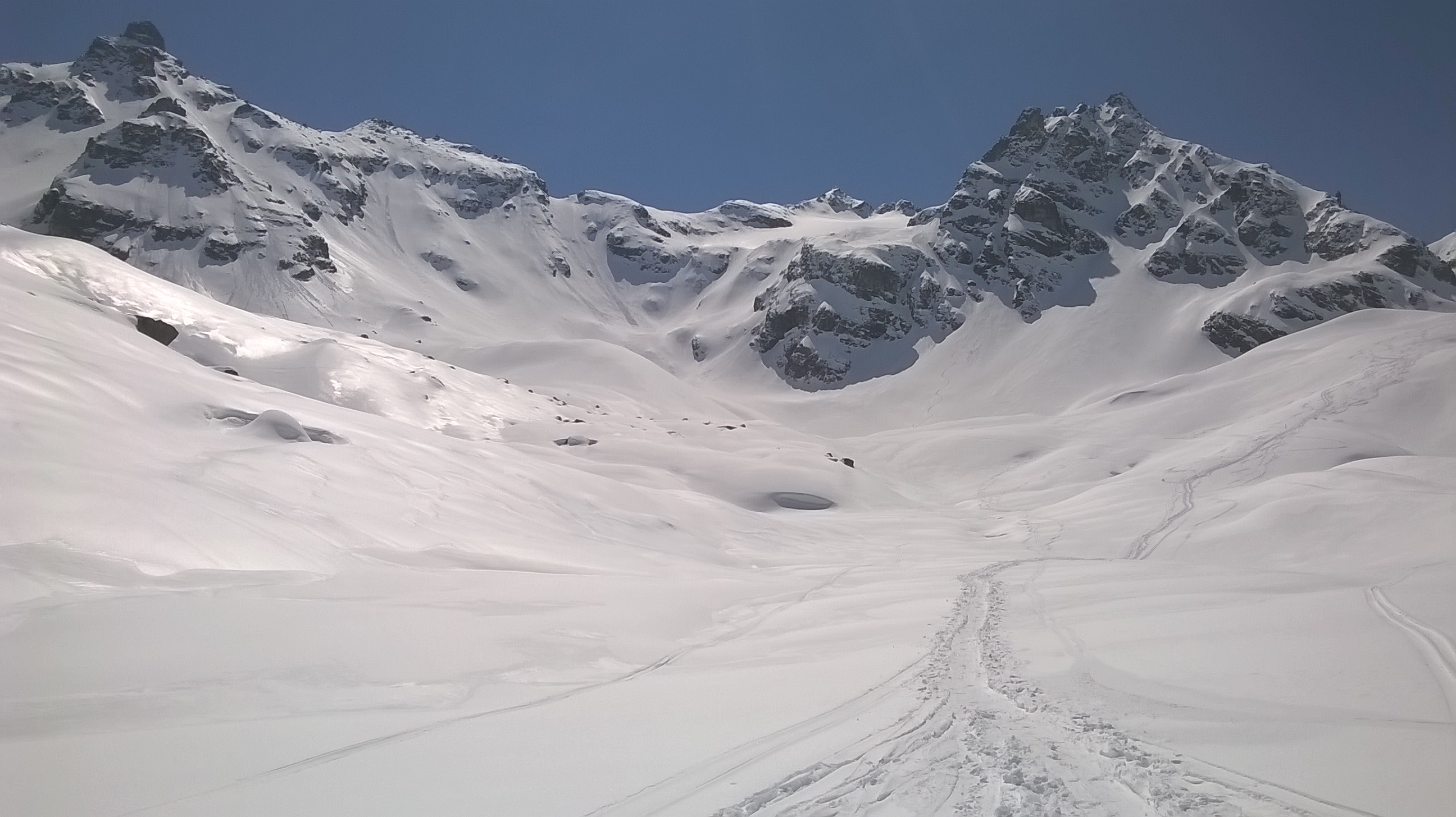 Vom Start weg genügend Schnee und schnell öffnet sich einem die herrliche Hochgebirgswelt. Auch die ersten Murmeltier konnten wir beobachten wie sie die noch verschneite Umgebung nach dem Winterschlaf erkunden. Die Tour ist wirklich herrlich, da nicht zu steil und aufgrund des großen Abstands zu den Steilhängen vergleichsweise lawinensicher. Wir sind mit der zweiten Kabine um 9Uhr los. Um 08:30Uhr sind wohl schon ein großer Schwung Leute gestartet die dann schon ein Stück weiter oben zu sehen waren. Tourenziele entweder Kromer Scharte rechts oder Seelücke bzw. Litznersattel vorbei an der Saarbrücker Hütte. Von dort natürlich viele Möglichkeiten für Rundtouren mit Firn bzw. Pulverabfahrten. Haben uns heute mit dem Anstieg bis zur Hütte begnügt. Bis dort garantiert keine Gletscherberührung. Die Abfahrt zum Saisonabschluss war toll. Wechselnder Schnee von Firn bis windgepressten Pulver alles dabei.