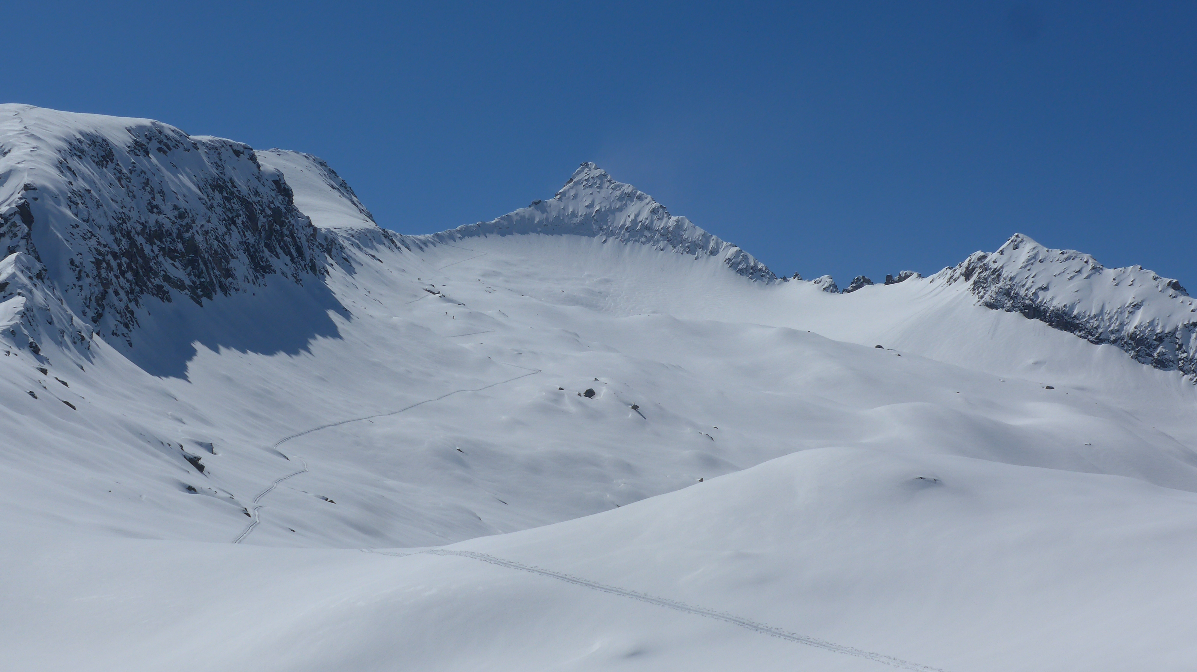 Der Grat wurde z.T. begangen - sehr viel Schnee! Für die Spurer war das Wühlerei. Wir sind 50 Hm unterm Gipfel auch umgedreht. Sind vom Grat noch ein wenig aufgestiegen und haben den Hang in voller Länge genossen (kurz angefellt) - statt der langen Querungs-Abfahrt.