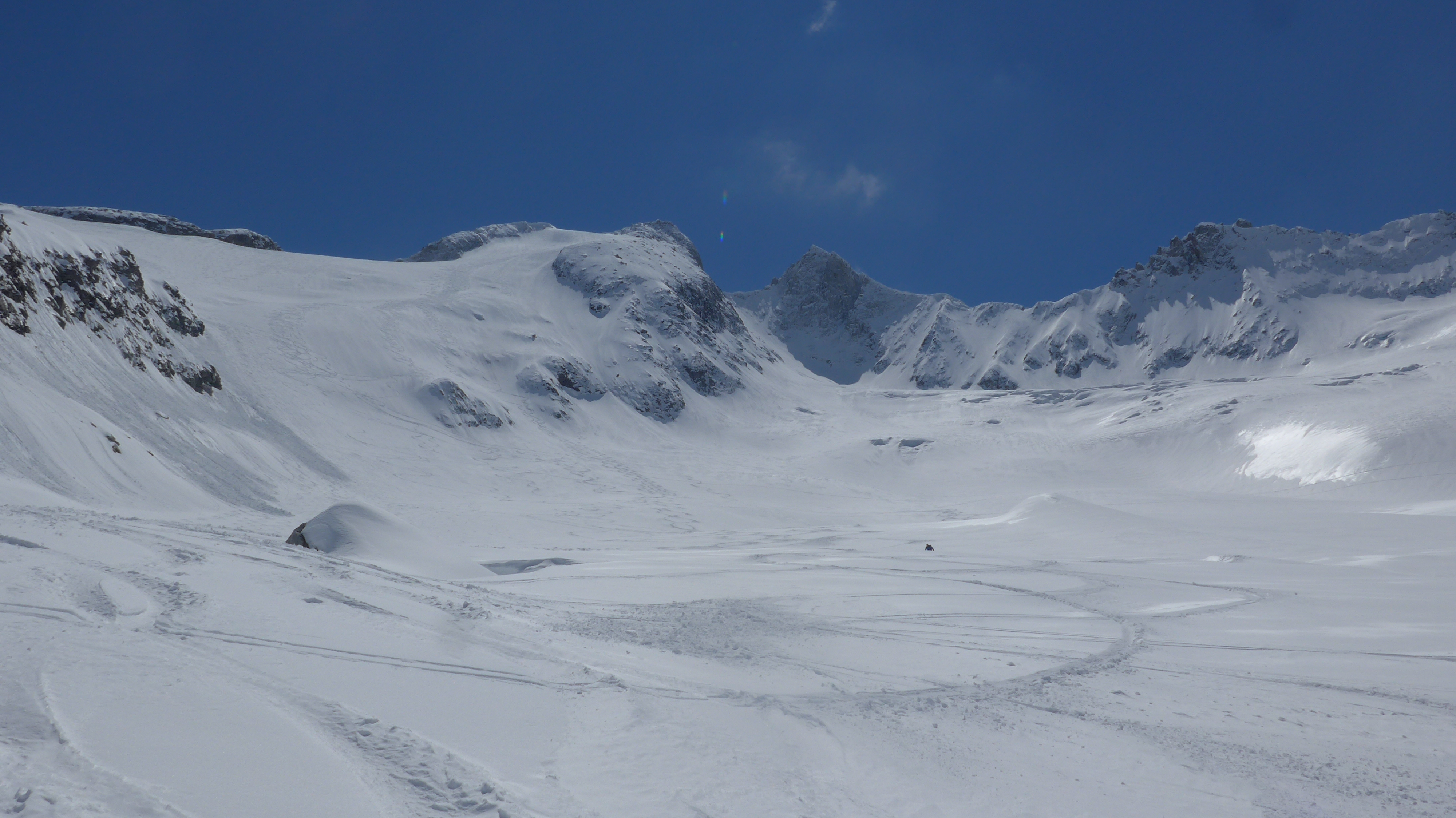 Geniale Abfahrt (12.15 Uhr) über die steileren Westhänge (Vorsicht mehr Spalten als östlich!) im feinsten Pulver! Jippie! Unten Sulz - noch gut zu fahren. Abfahrt 1 Std. früher (bei diesen Temp.) schadet auch nicht ![]()