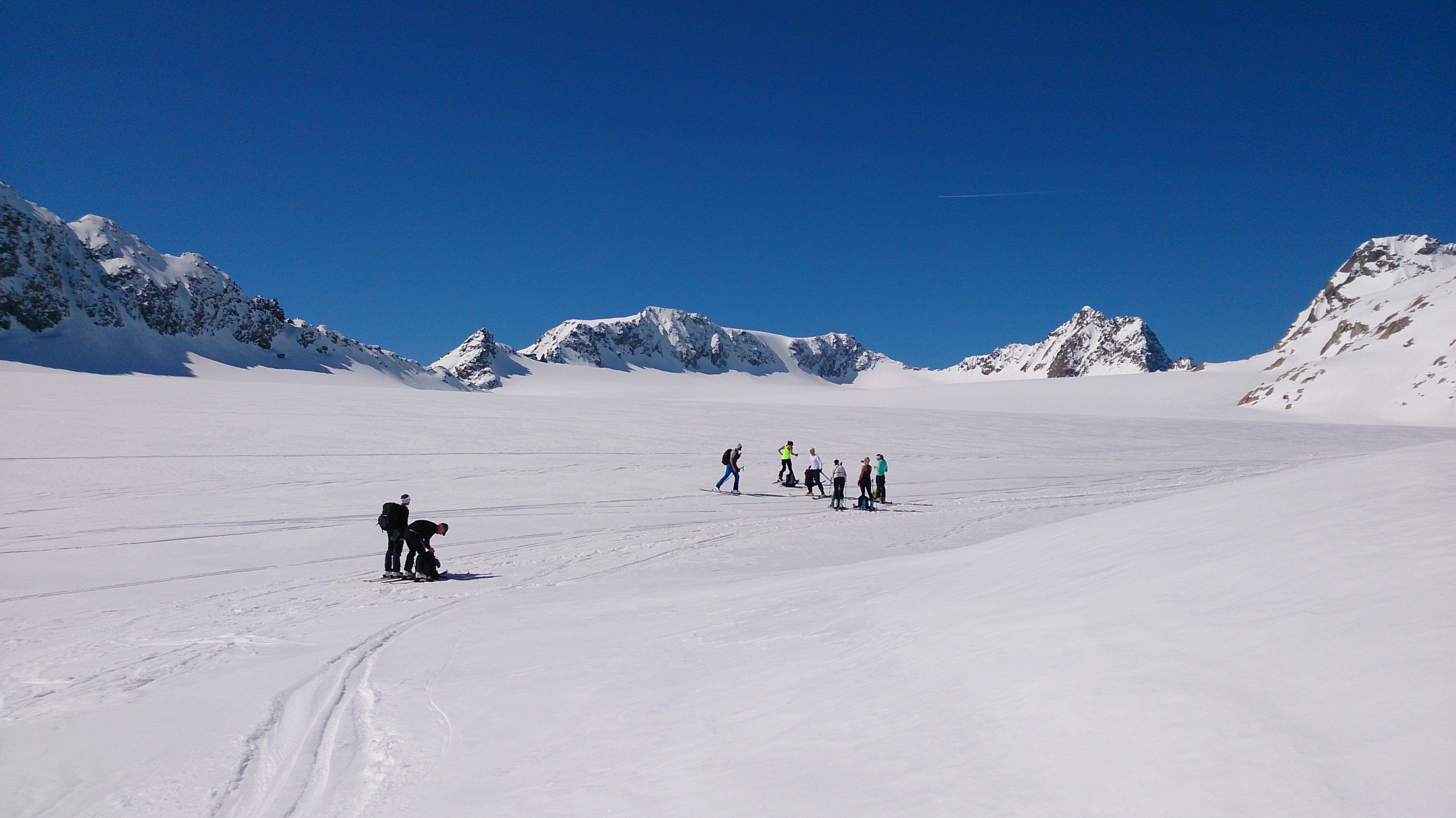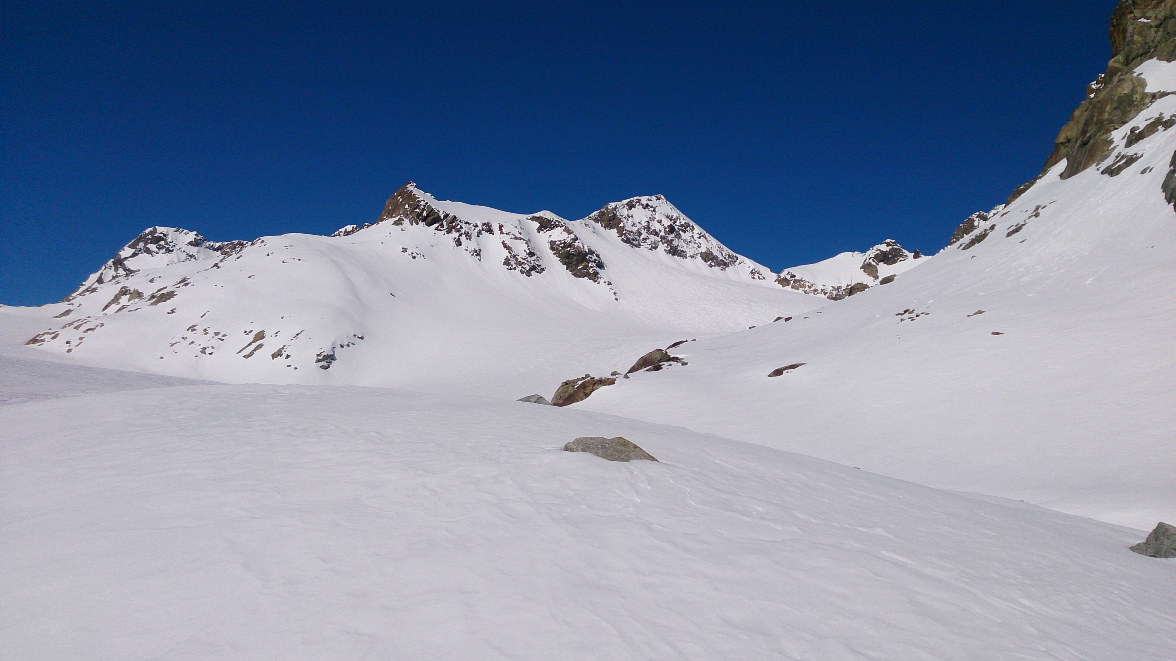 Tourenverhältnisse: Schnee ab der Materialseilbahn des Westfalenhauses, aber noch kein rechter Firn: Gipfelhang je nach Exposition gegen Mittag noch tragfähig oder nicht, Rinne vom Rotgratferner recht tief, danach die nordseitigen Hänge alles zwischen, tief, Bruchharsch und auch aufgefirnt