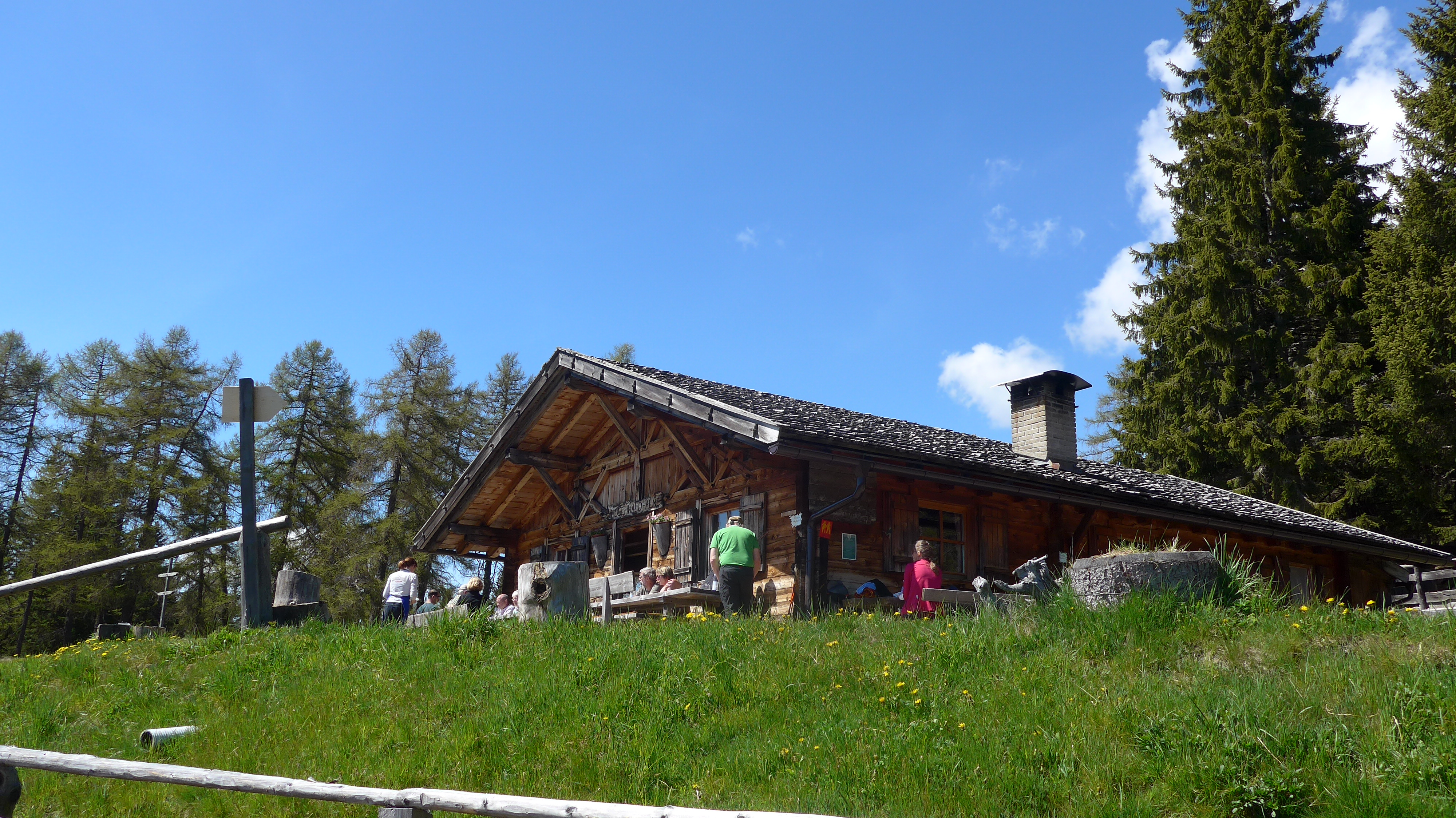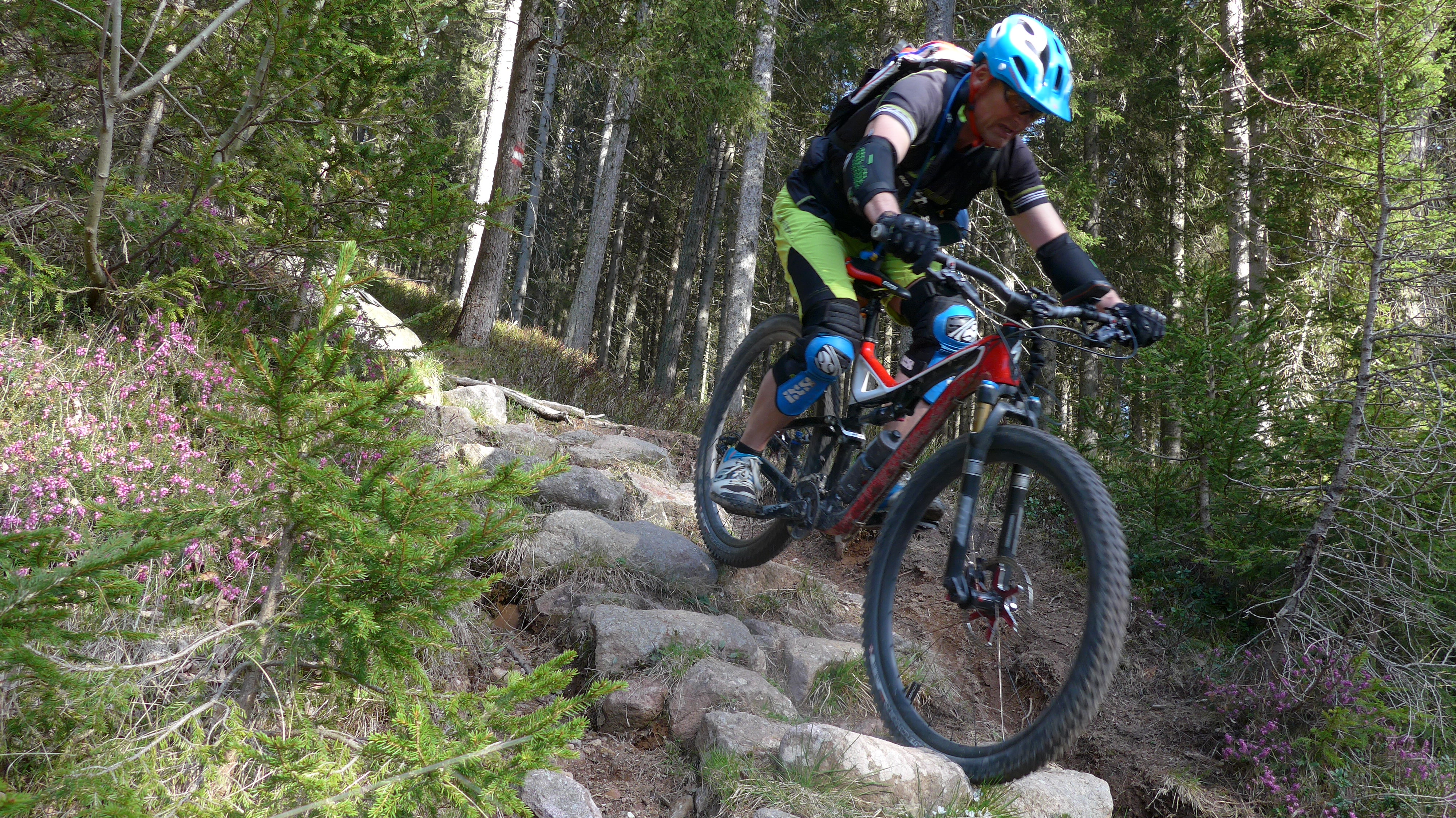 Gschmeidiger Trail, dann etwas fordernder, teils S2 (verblockt, im Wald noch etwas nass) nach Süden, nach Krößbrunn zur Leadner Alm nach Hafling.