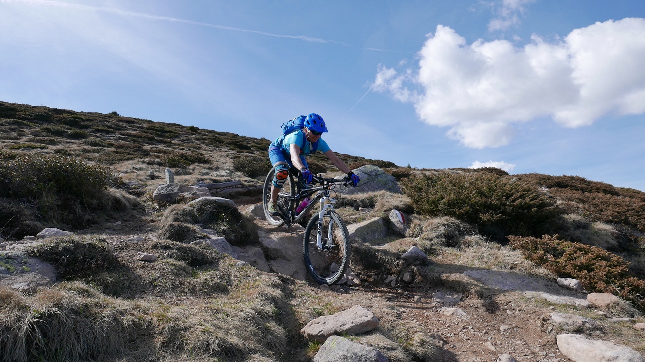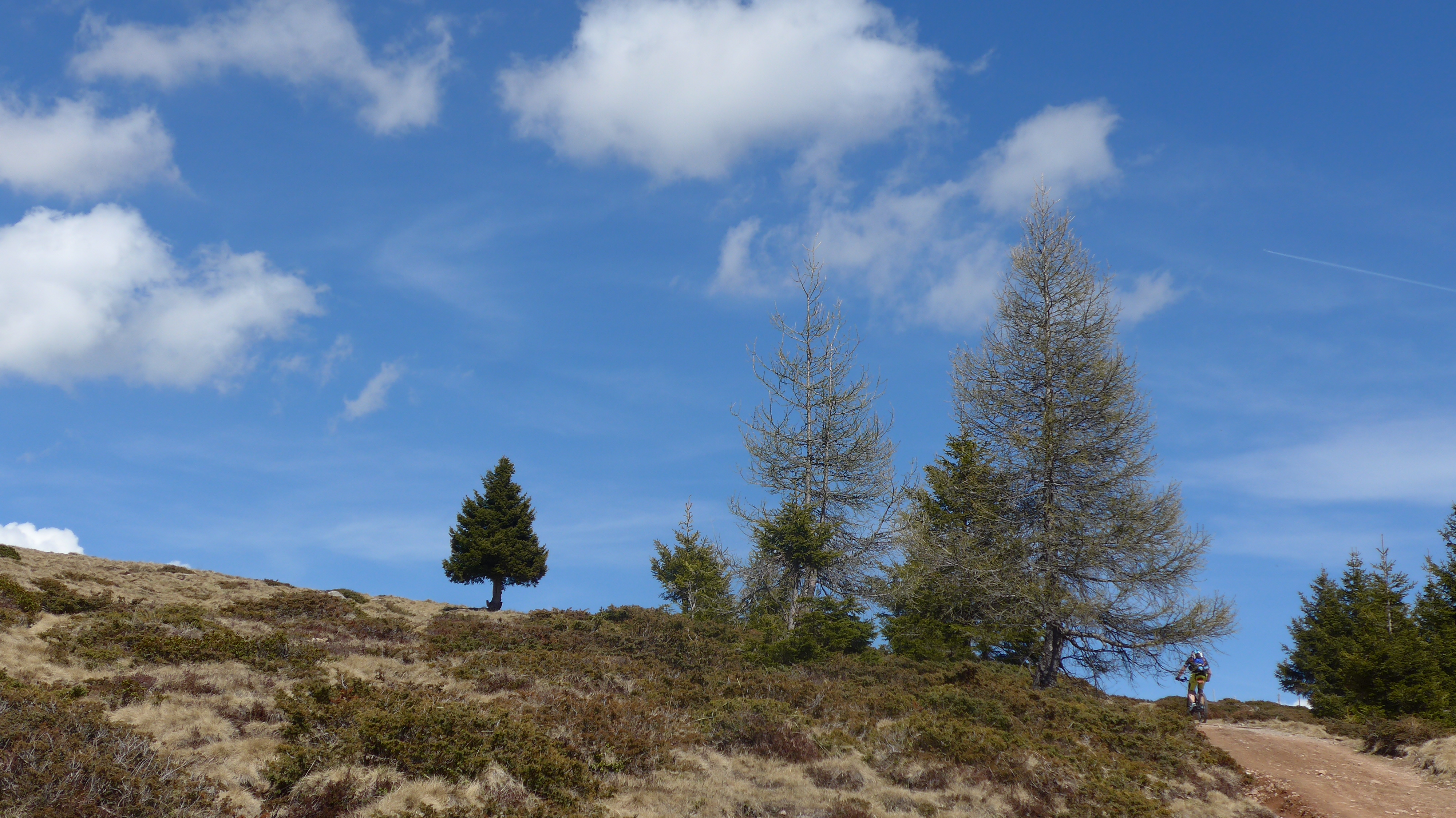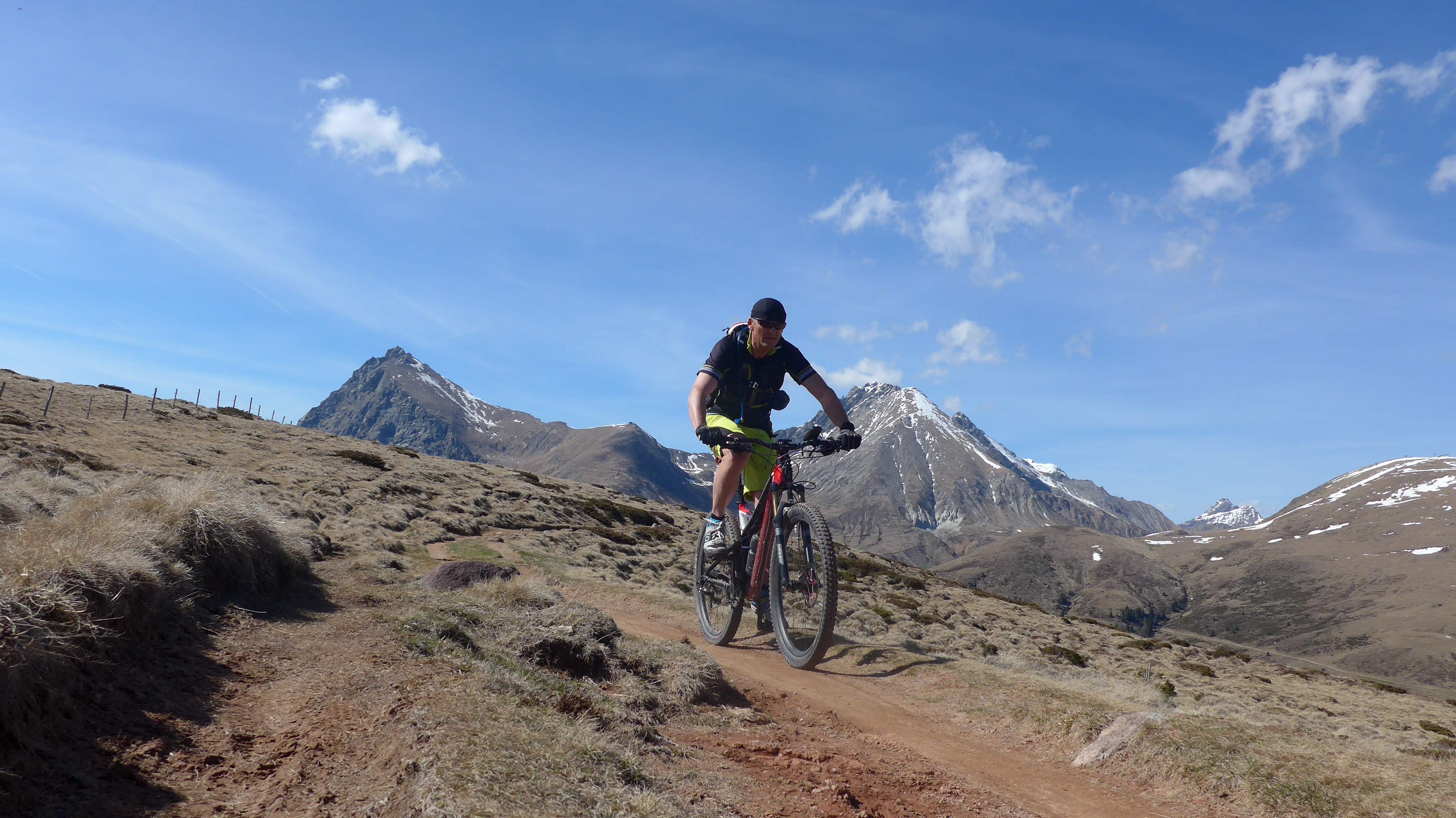 Sehr schöner Trail (fast 1/2 der Abfahrt), Rest auf Forststraße und bisschen Teerstraße. Großartige Aussicht. Heute sehr ruhig - noch wenige Wanderer unterwegs (E5). Etwas windig - trotzdem auf fast 2100 m noch sehr mild.