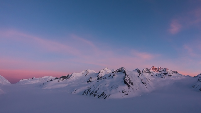 Abendstimmung auf der Konkordiahütte mit (von links nach rechts) Lötschenlücke, Anuchnubel, Äbenifluh, Gletscherhorn, Kranzberg, Jungfrau, Jungfraujoch