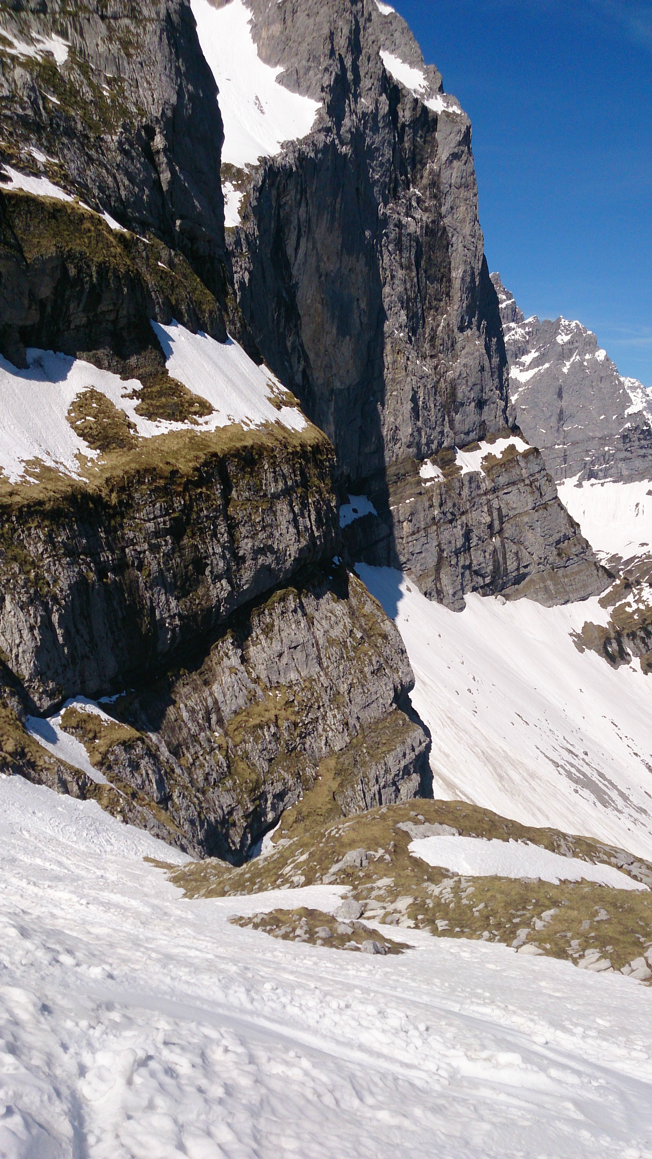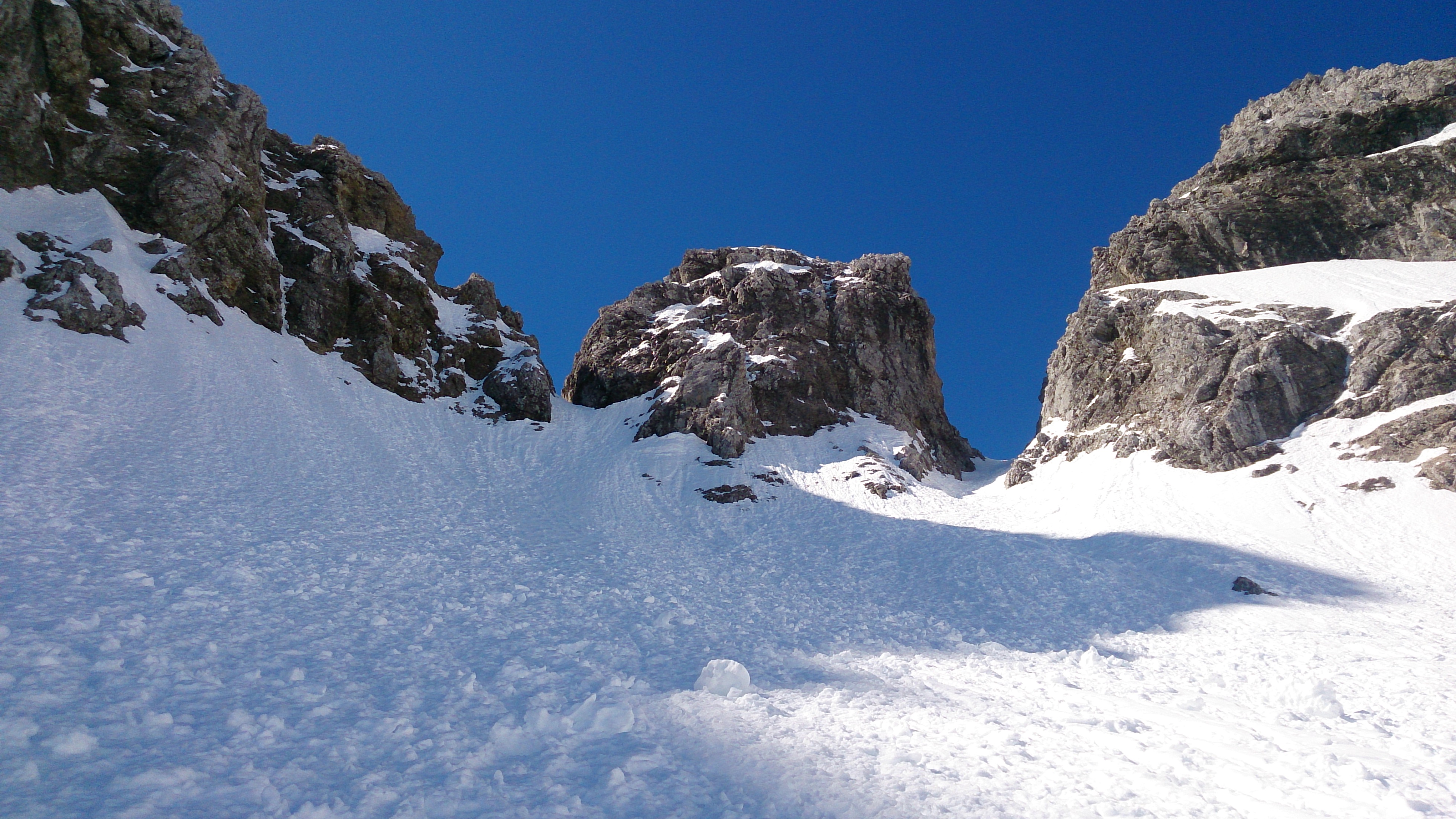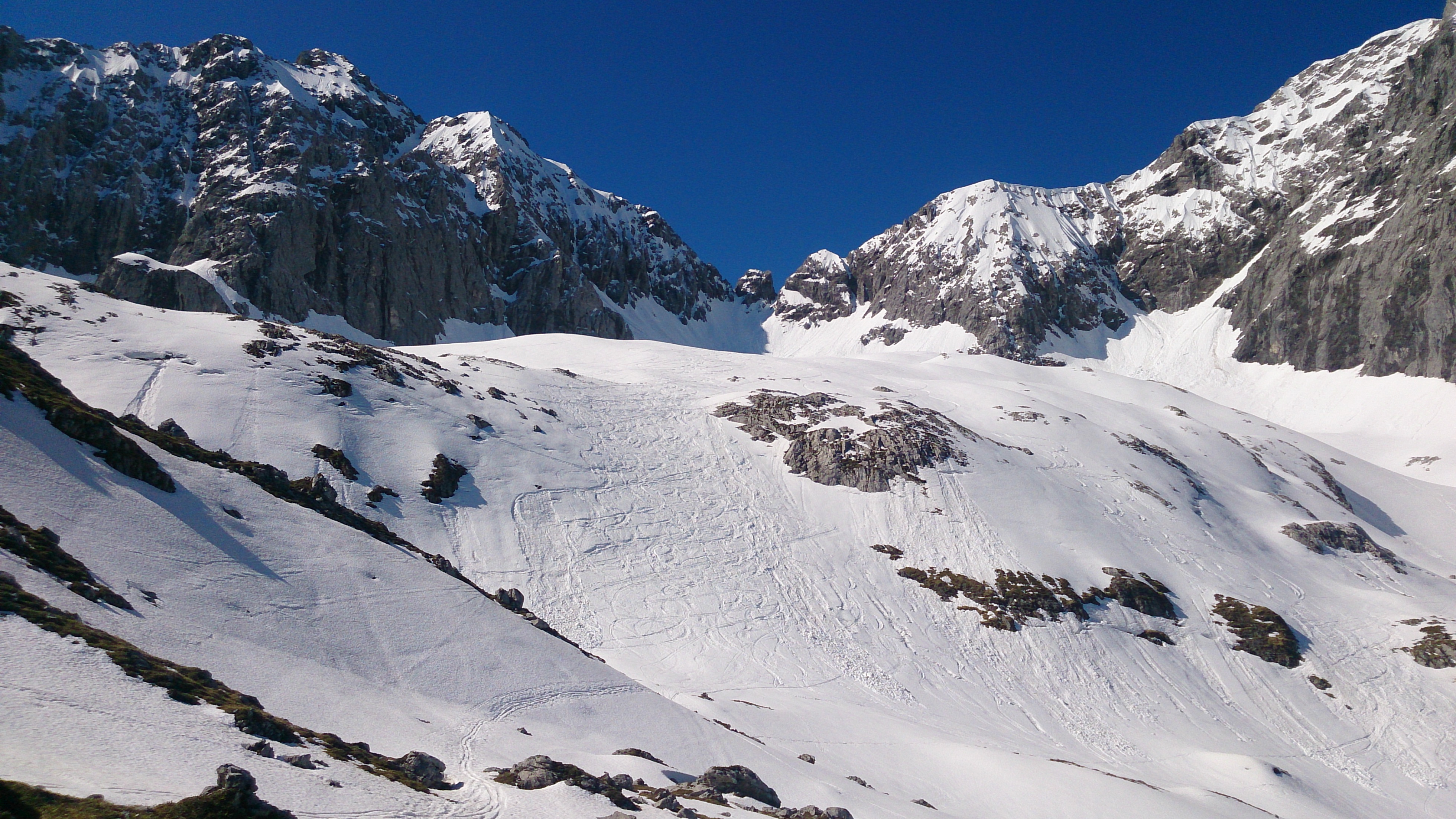 Gefahreneinschätzung: hoch, insbesondere wegen Lawinen aus den Flanken - daher auch nicht bis zur Scharte gegangen, s.u.