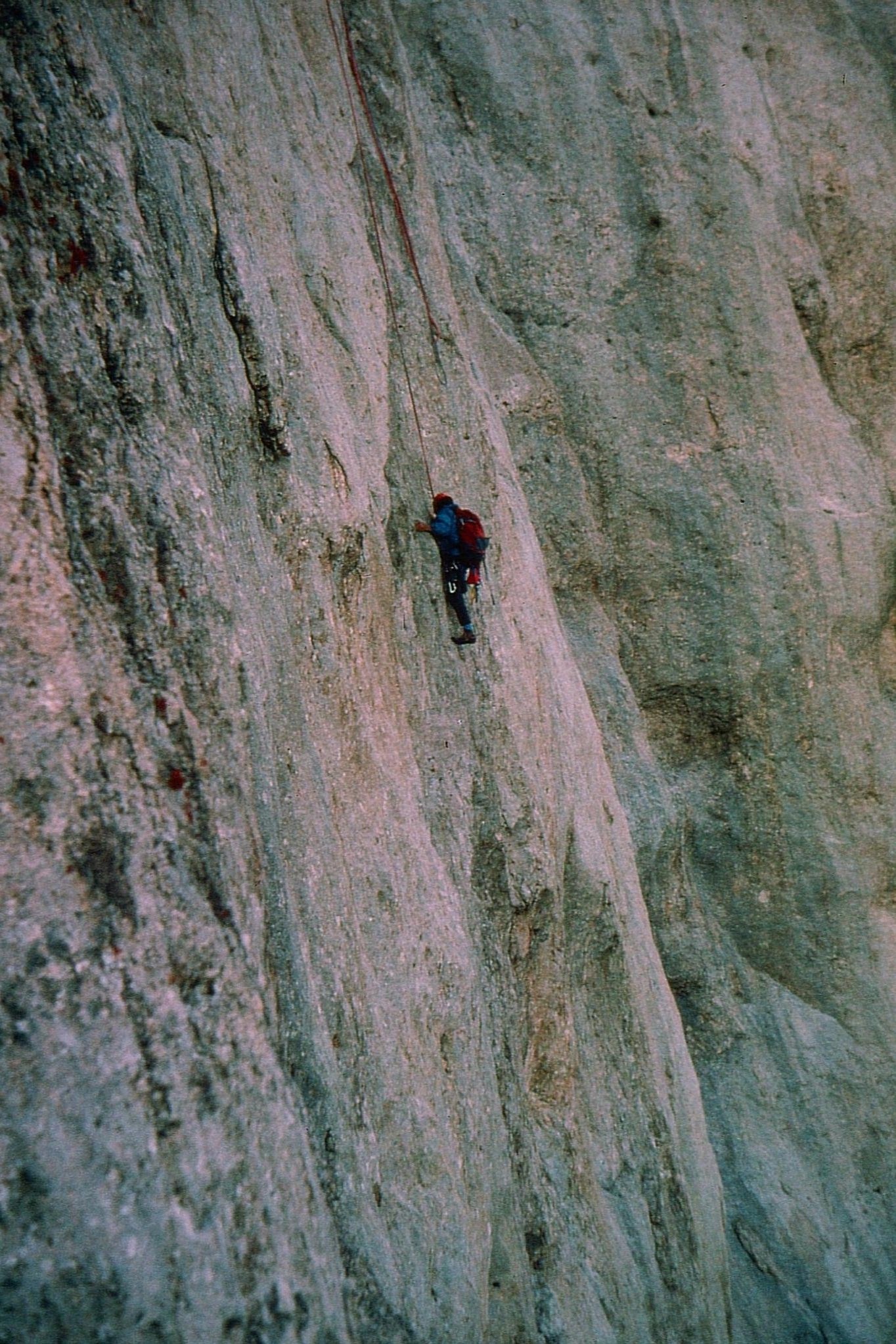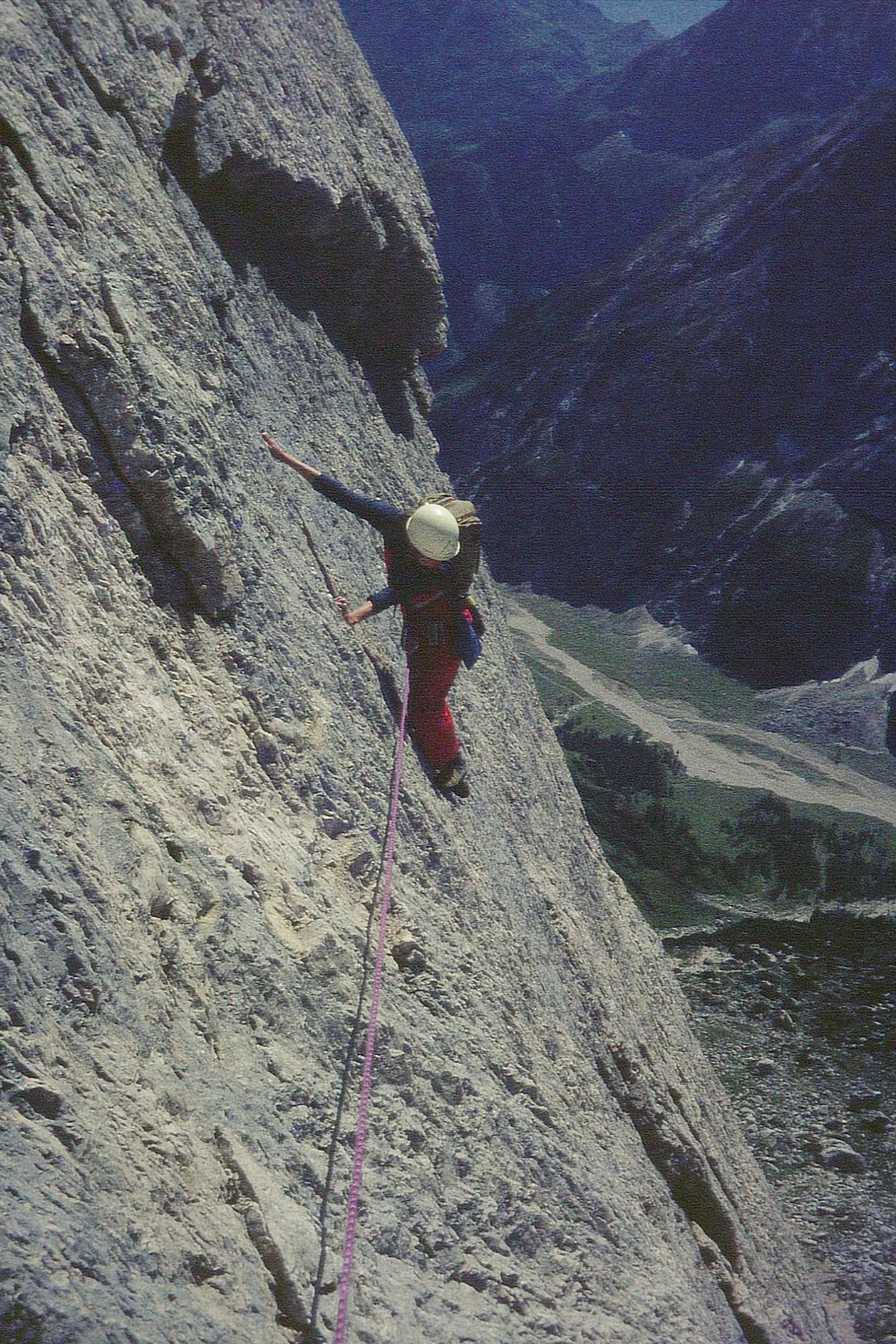 Bilder / GPS-Track: 1. Thomas Huber in der "Moderne Zeiten" August 1985, rechts der "Gogna" 2.Ausstieg aufs "Große Band" in der Schiestl-Wurm Variante