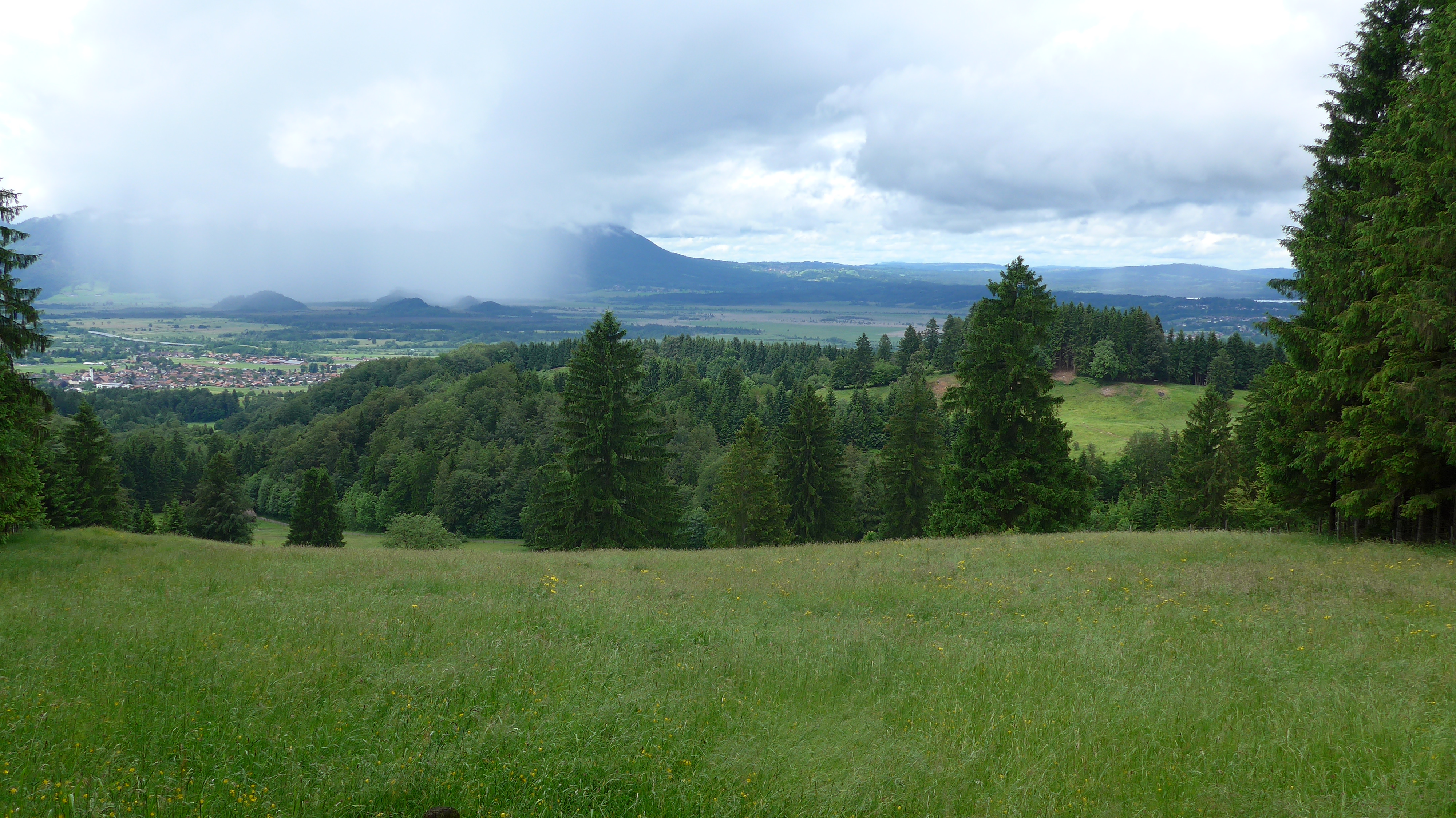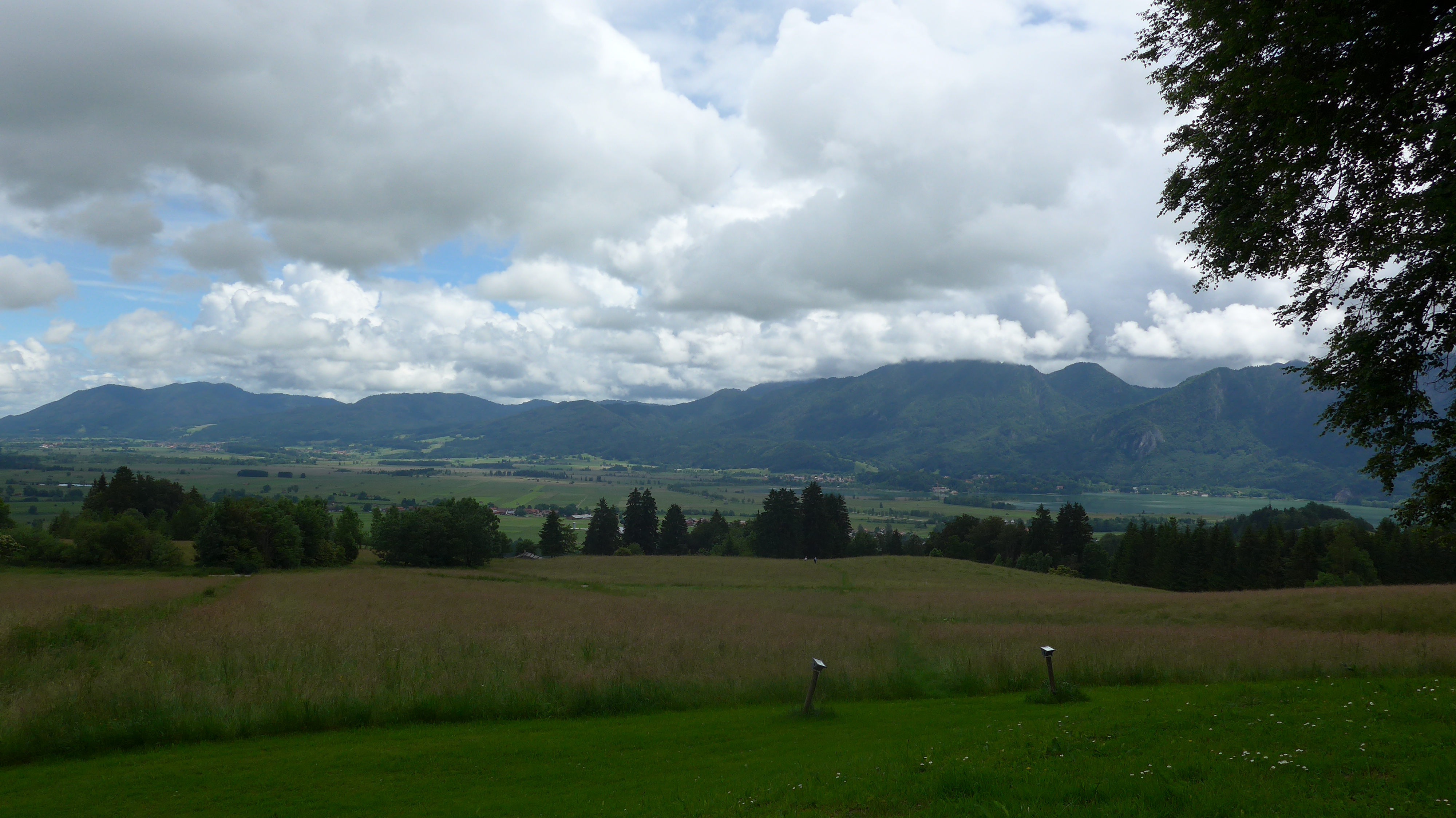 Weiter auf Forststraße hinunter nach Ohlstadt. Weiter nach Schwaiganger - Großweil - Kleinweil. Schwenk nach Osten zum Örtchen Stern mit dem Panorama ! Cafe (Mo + Di Ruhetag). Da könnte man´s bei Sonne länger aushalten ... Seltener Blick auf Benewand, Jochberg + Kochelsee.