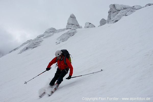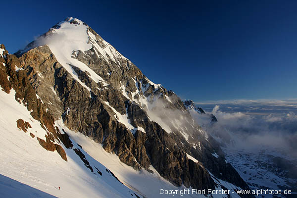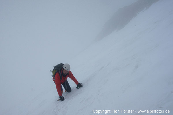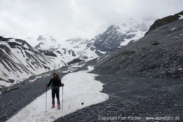 Am Sa. 30.5. nach Sulden, im "Yak und Yeti" noch geschmorte Yak-Keule genossen, sehr zu empfehlen! Nach kurzer Nacht im Auto um 2:30 Abmarsch bei sternklarem Himmel Richtung Königspitze. Bis 2200m Fahrweg, dann Moränengelände, ab 2400m Schnee. Sind bis auf 2800m zu Fuß, wollten eigentlich die Ostrinne machen, diese hatte allerdings schon sehr wenig Schnee und tiefe Lawinenrinnen. Deswegen auf Normalweg umdisponiert und mit Ski bis zum Cedecpass, dort Nebel und kalter Wind. Trotzdem 250m zu Fuß nach Süden hinab und mit Ski bis auf 3250m. Zu Fuß weiter durch die S-Rinne zur Schulter und über den Osthang im dichten Nebel und beginndem Schneefall zum Gipfel, guter Trittschnee, am Schluss bis gut 45°. Abstieg zurück zu den Skiern (Ostflanke wurde befahren, bei Nebel und eher harten Verhältnissen aber sicher kein Genuss), kurze Abfahrt und Gegenanstieg zum Cedecpass. Im Nebel bis auf 3000m, dann bei besserer Sicht und gutem Firn Abfahrt bis 2300m. Zu Fuß mit kurzen Fahrpassagen zum Auto. Insg. gut 10 Std. und knapp 2500Hm. Auch im Ortlergebiet bereits erstaunlich wenig Schnee, Ski sind am Suldenferner bis 2400m zu tragen. Ortler wurde am Vortag als Skitour gemacht, noch gute Verhältnisse.