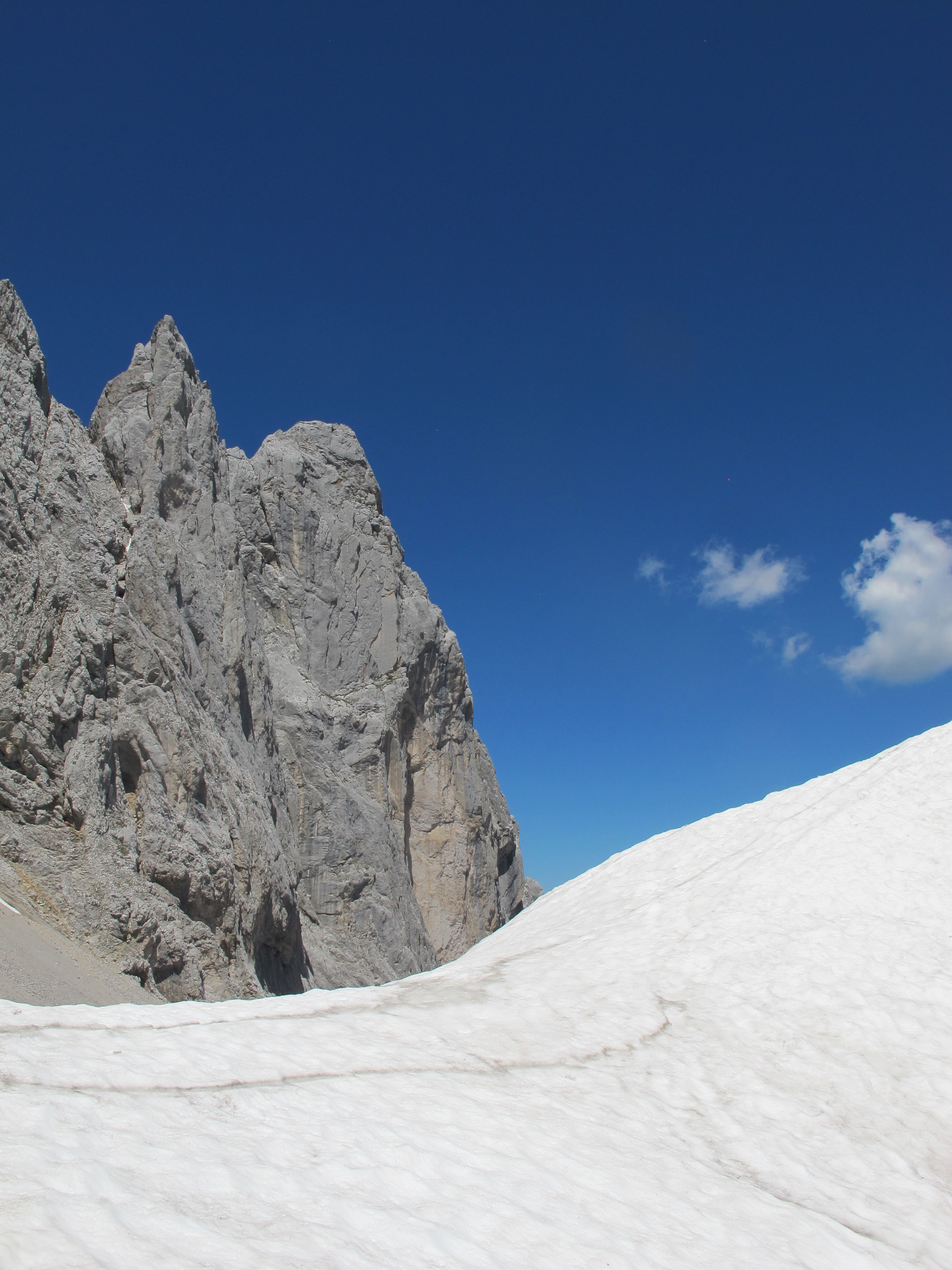 Prognose: Aufstieg übers Kübelkar, wir waren zu spät dran, in der Mittagshitze nicht sehr angenehm. Dafür erst um zwei eingestiegen und die Kletterei die meiste Zeit im Schatten genossen.