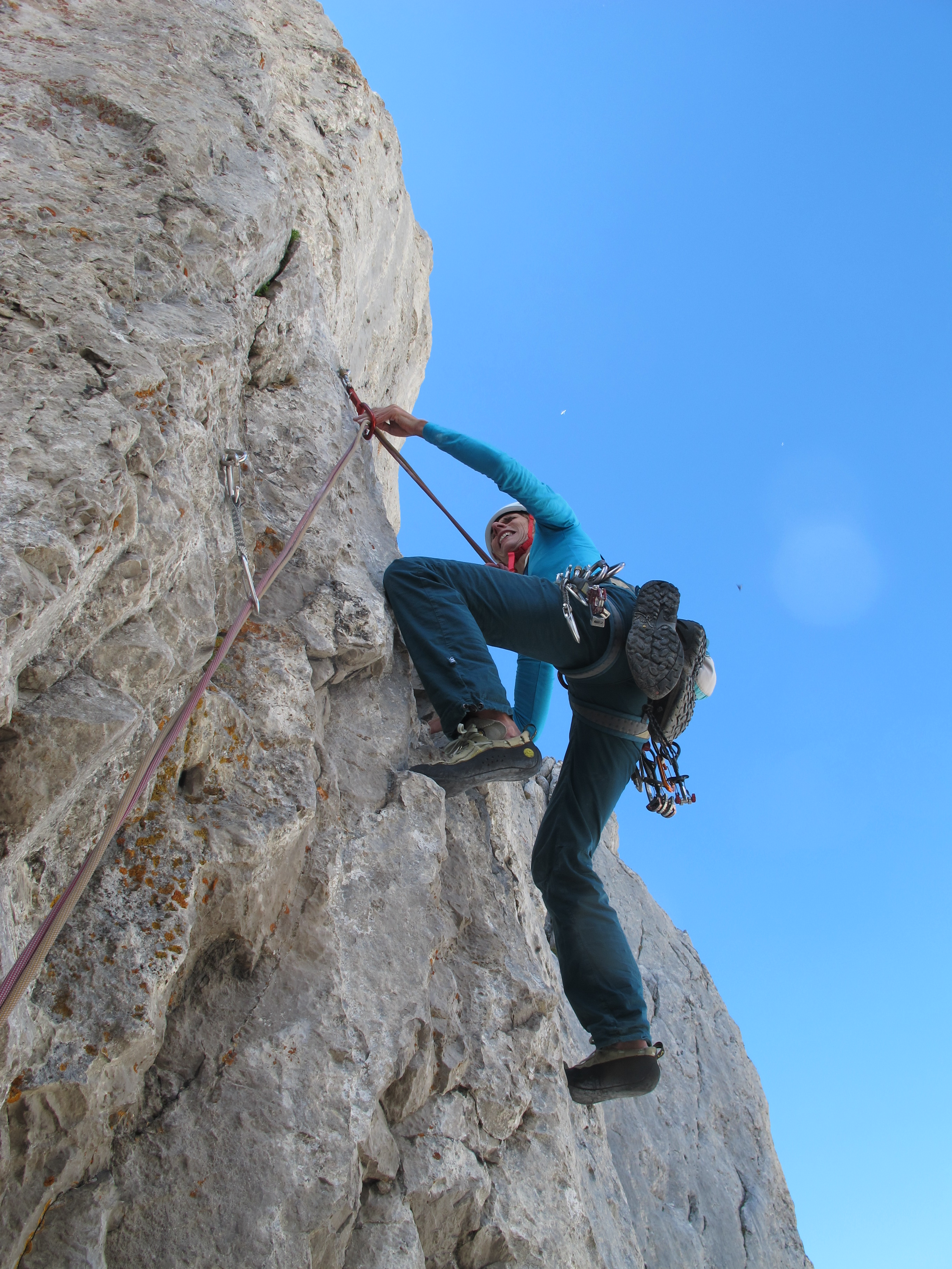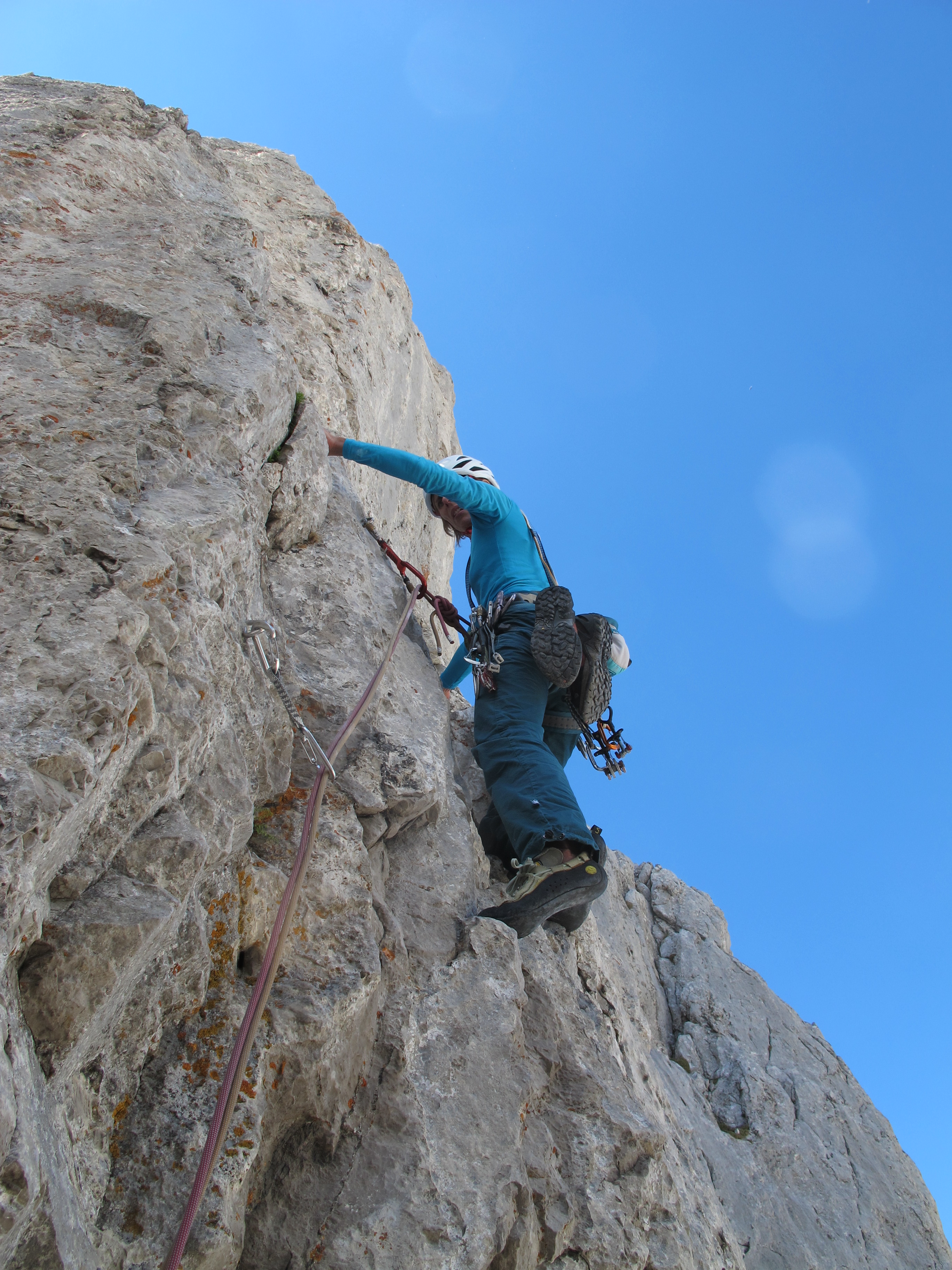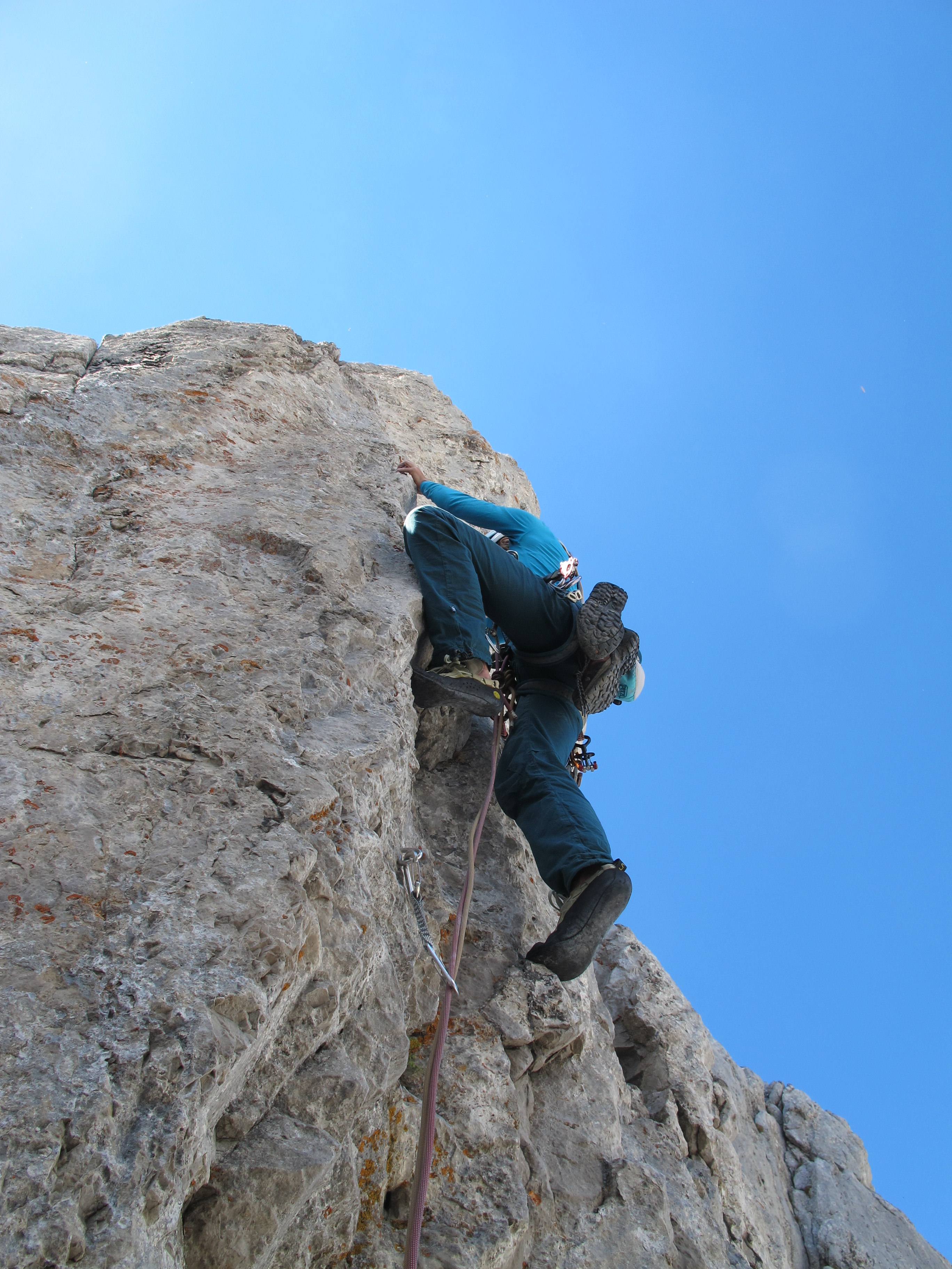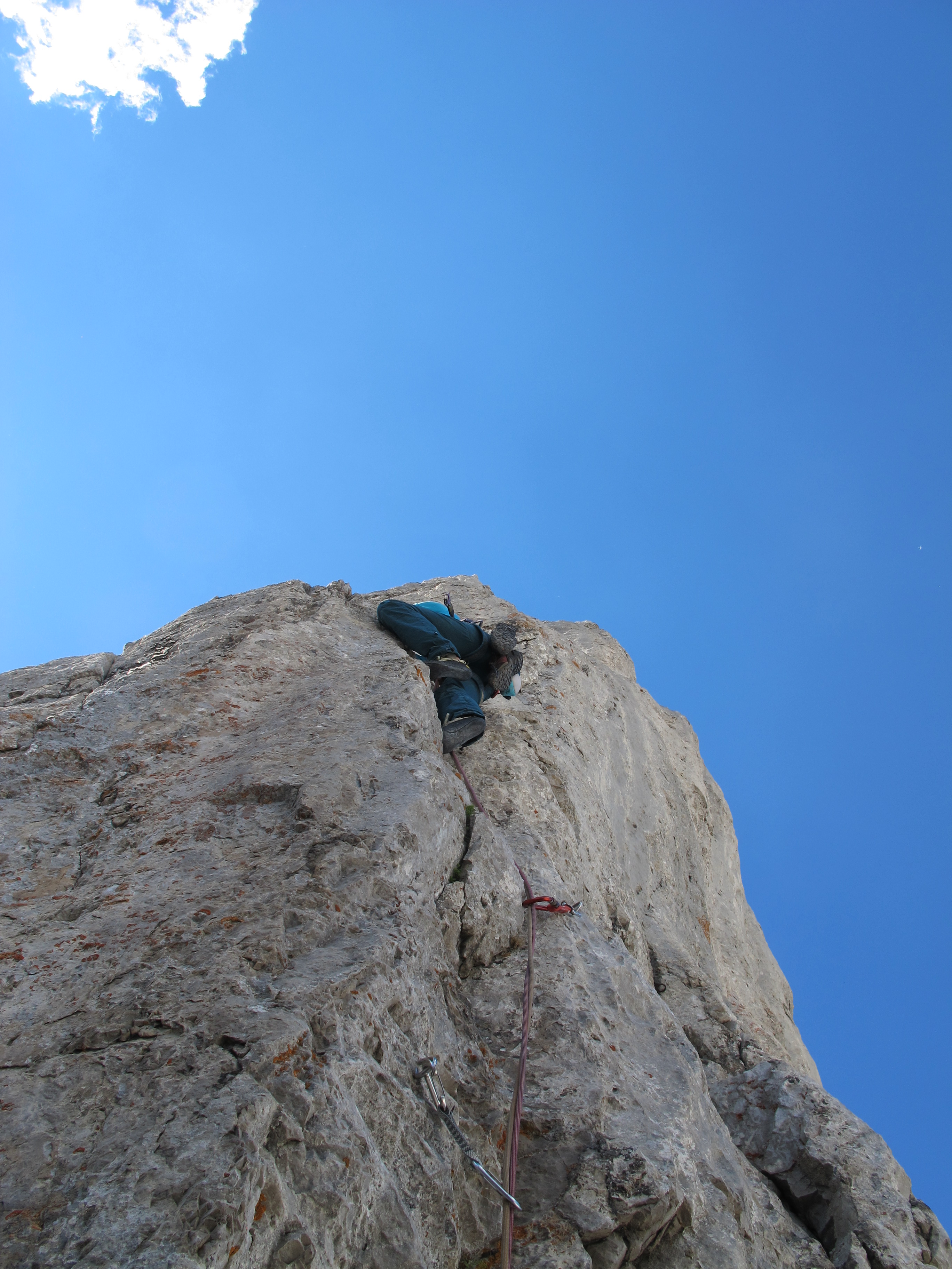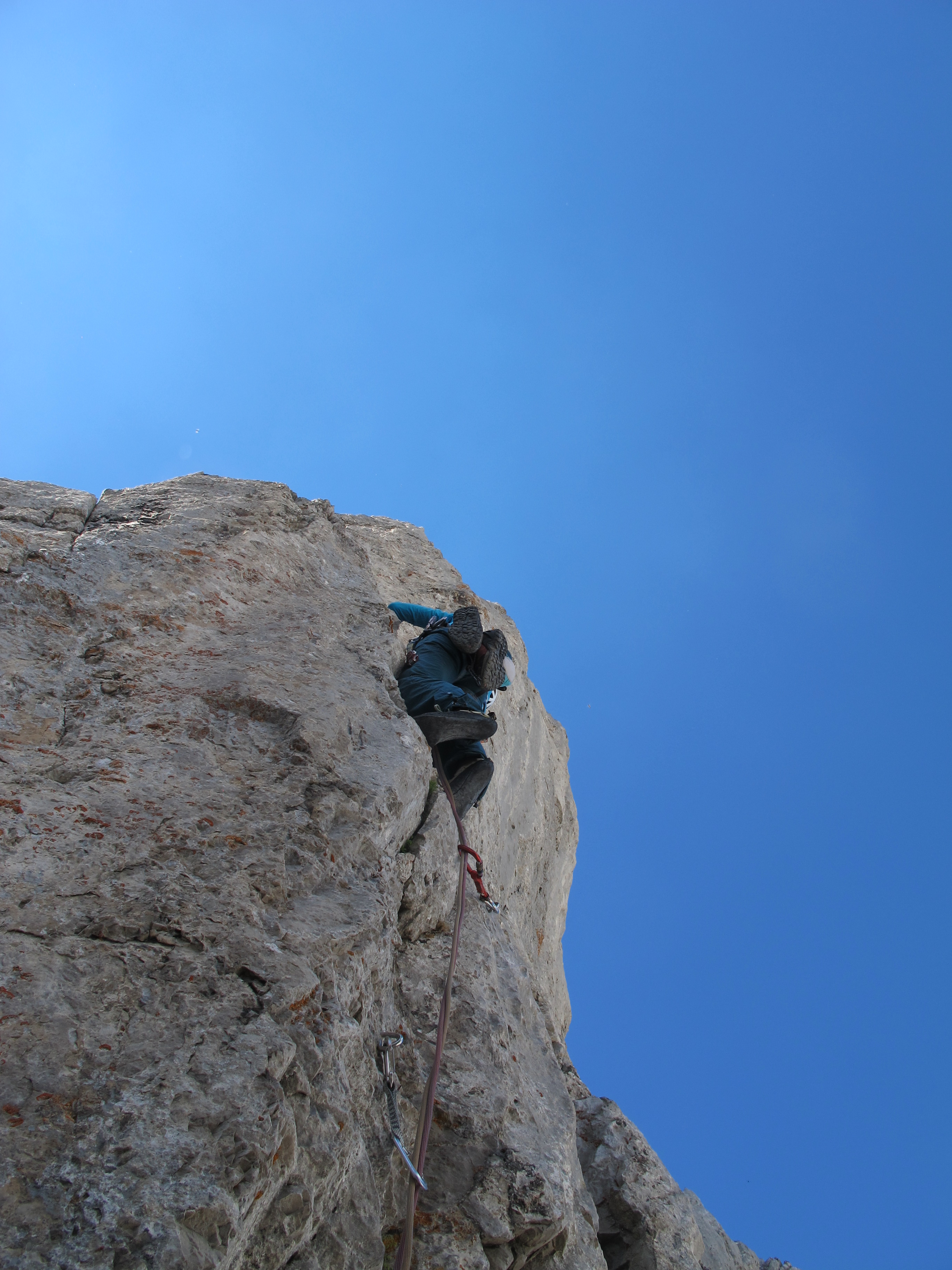 Tourenverhältnisse: Kantenhöhe, 180m, 8 Seillängen, Schlüsselstelle VI+, lt. Rotherführer, (rechts der Bohrhaken und dann wieder nach links, Bohrhaken einhängen, aber rechts bleiben und beim alten Schlaghaken wieder links queren zu Fingerriss und dann hoch zum Stand)