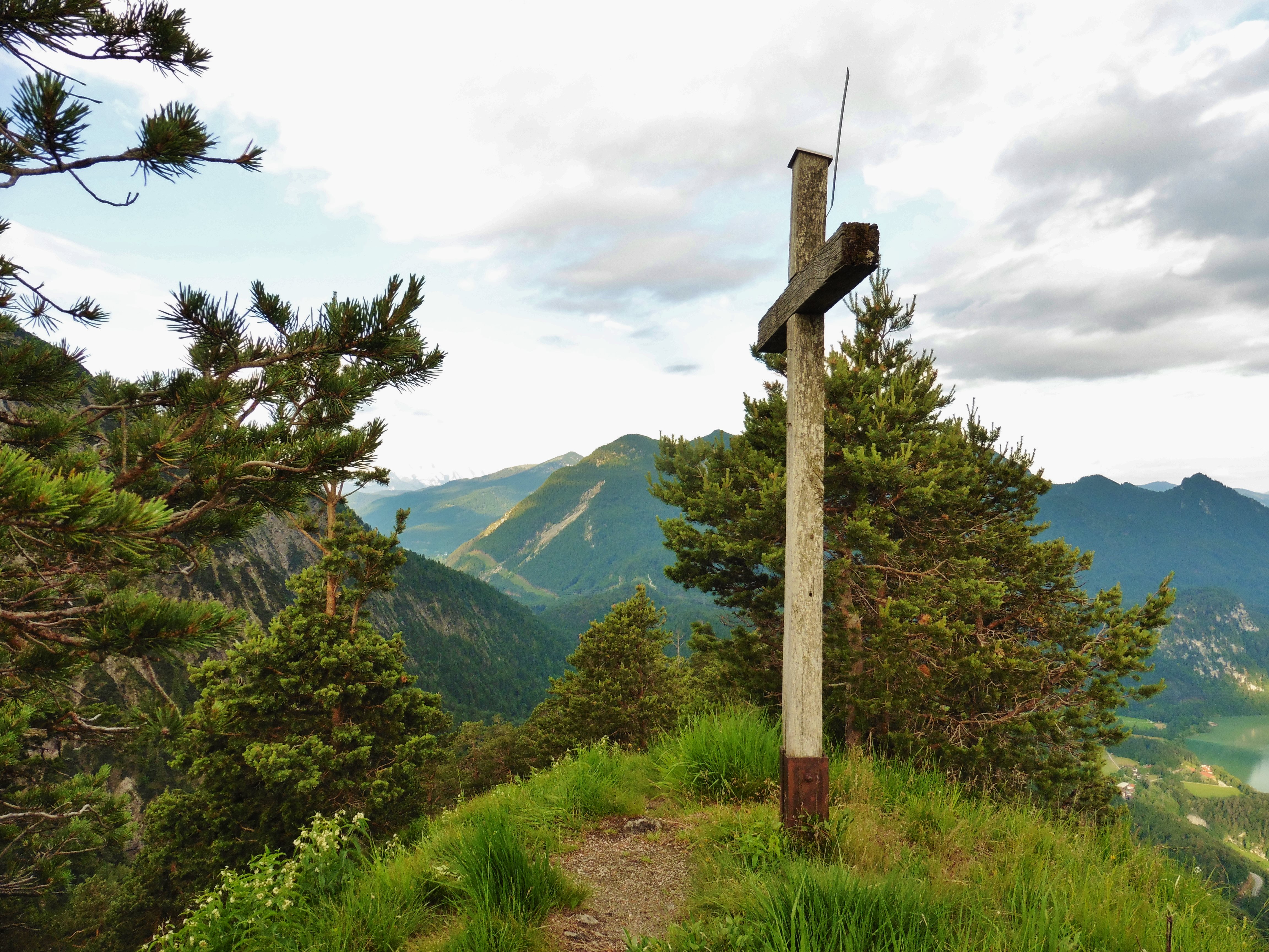 Sonstiges: vom Parkplatz kurz die Straße entlang bis zum Hotel "Grauer Bär"; direkt gegenüber beginnt ein Pfad, der etwas verwickelt, im Allgemeinen links von einem markanten Graben zu der mittlerweile bekannten Tafel, die vor einer Begehung des Steiges warnt, führt; der Clou, - der Steig ist ab hier deutlich erkennbar, gut zu begehen und leitet ohne besonderen Schwierigkeiten zum Graseck; im obersten Teil, dort wo der Steig in die Südflanke führt, ist es schöner direkt am Grat zu bleiben; vom Gipfelkreuz geht es kurz steil bergab und anschließend muss ein Türmchen überstiegen werden; dieser Teil erfordert erhöhte Aufmerksamkeit, da sehr exponiert; der Weiterweg zum Sonnenspitz ist einfach; der Abstieg erfolgt über den mark. Weg auf der Nordseite; dort wo eine Tafel "Kochel" nach rechts weist ist es besser den unmarkierten Weg, der steil nach links in den Hochwald führt zu benützen (um den oberen Teil der Forststraße zu vermeiden); dieser Weg führt unmittelbar vor die Ostwand des Kiensteins; dieser ist in wenigen Minuten über einen teilweise versicherten Weg ersteigbar; anschließend leitet ein unmark. Weg nach Norden zur Forststraße, die zum Parkplatz führt;